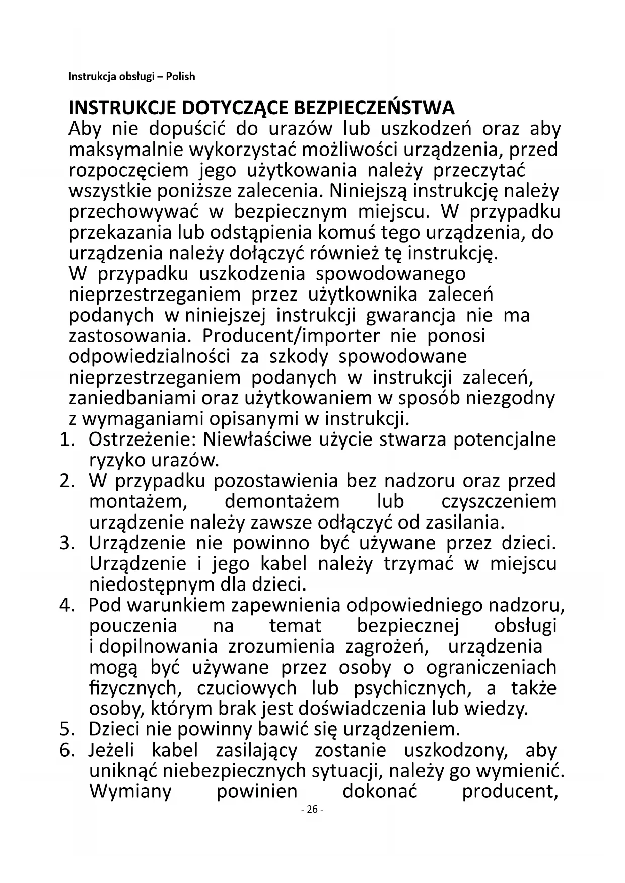 Aby nie dopuścić do urazów lub uszkodzeń oraz aby maksymalnie wykorzystać możliwości urządzenia, przed rozpoczęciem jego użytkowania należy przeczytać wszystkie poniższe zalecenia. Niniejszą instrukcję należy przechowywać w bezpiecznym miejscu. W przypadku przekazania lub odstąpienia komuś tego urządzenia, do urządzenia należy dołączyć również tę instrukcję. W przypadku uszkodzenia spowodowanego nieprzestrzeganiem przez użytkownika zaleceń podanych w niniejszej instrukcji gwarancja nie ma zastosowania. Producent/importer nie ponosi odpowiedzialności za szkody spowodowane nieprzestrzeganiem podanych w instrukcji zaleceń, zaniedbaniami oraz użytkowaniem w sposób niezgodny z wymaganiami opisanymi w instrukcji.