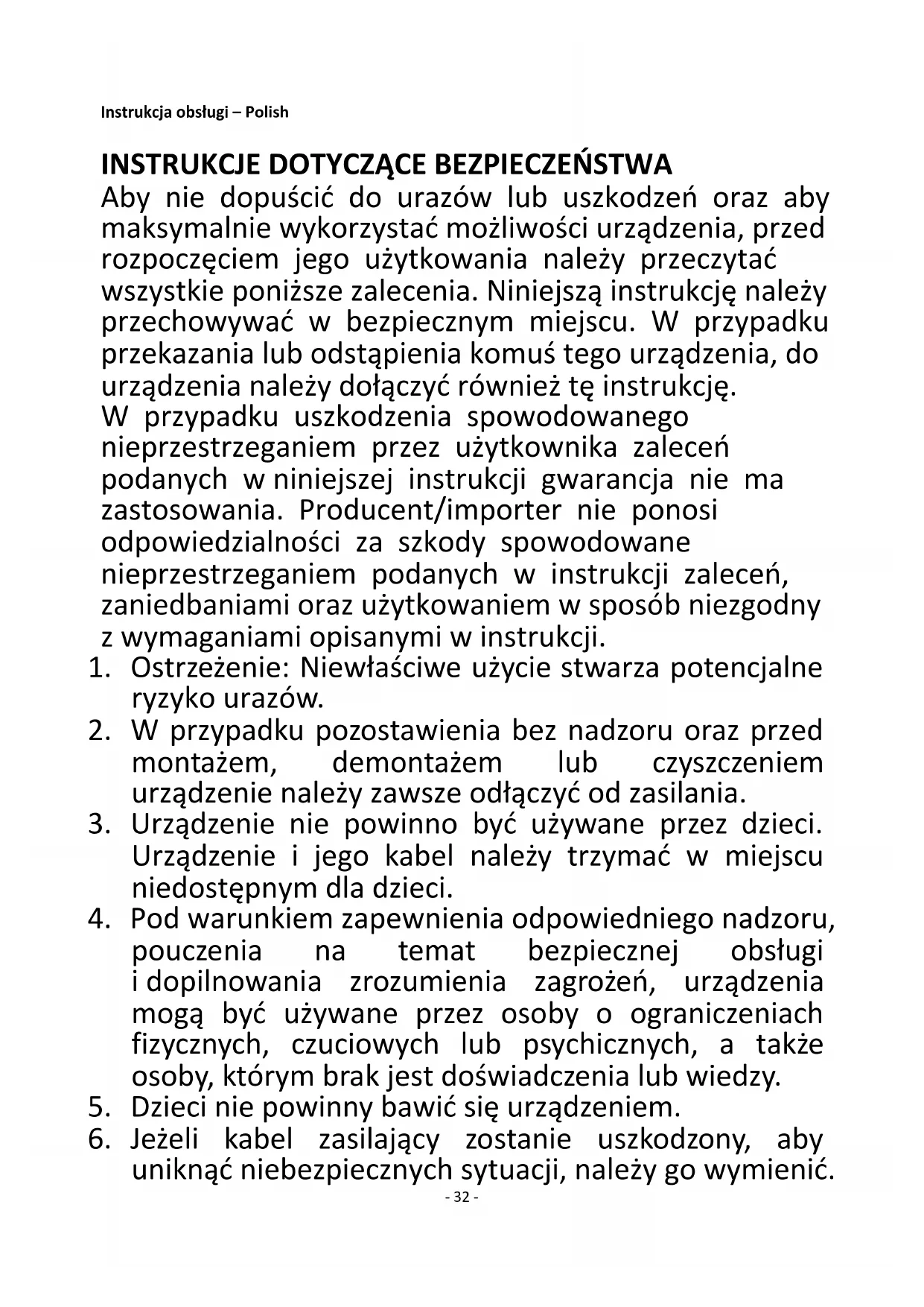 Aby nie dopuścić do urazów lub uszkodzeń oraz aby maksymalnie wykorzystać możliwości urządzenia, przed rozpoczęciem jego użytkowania należy przeczytać wszystkie poniższe zalecenia. Niniejszą instrukcję należy przechowywać w bezpiecznym miejscu. W przypadku przekazania lub odstąpienia komuś tego urządzenia, do urządzenia należy dołączyć również tę instrukcję. W przypadku uszkodzenia spowodowanego nieprzestrzeganiem przez użytkownika zaleceń podanych w niniejszej instrukcji gwarancja nie ma zastosowania. Producent/importer nie ponosi odpowiedzialności za szkody spowodowane nieprzestrzeganiem podanych w instrukcji zaleceń, zaniedbaniami oraz użytkowaniem w sposób niezgodny z wymaganiami opisanymi w instrukcji.