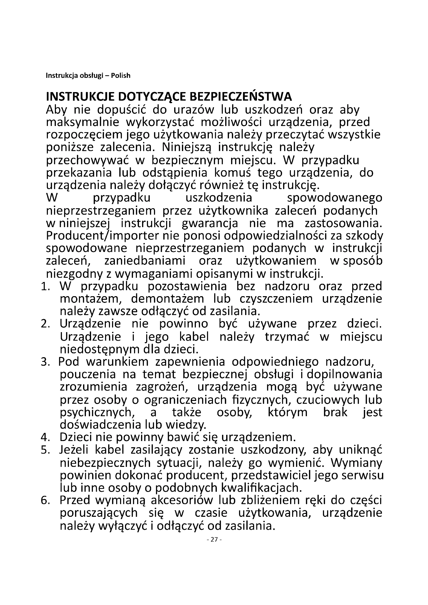 Aby nie dopuścić do urazów lub uszkodzeń oraz aby maksymalnie wykorzystać możliwości urządzenia, przed rozpoczęciem jego użytkowania należy przeczytać wszystkie poniższe zalecenia. Niniejszą instrukcję należy przechowywać w bezpiecznym miejscu. W przypadku przekazania lub odstąpienia komuś tego urządzenia, do urządzenia należy dołączyć również tę instrukcję. W przypadku uszkodzenia spowodowanego nieprzestrzeganiem przez użytkownika zaleceń podanych w niniejszej instrukcji gwarancja nie ma zastosowania. Producent/importer nie ponosi odpowiedzialności za szkody spowodowane nieprzestrzeganiem podanych w instrukcji zaleceń, zaniedbaniami oraz użytkowaniem w sposób niezgodny z wymaganiami opisanymi w instrukcji.