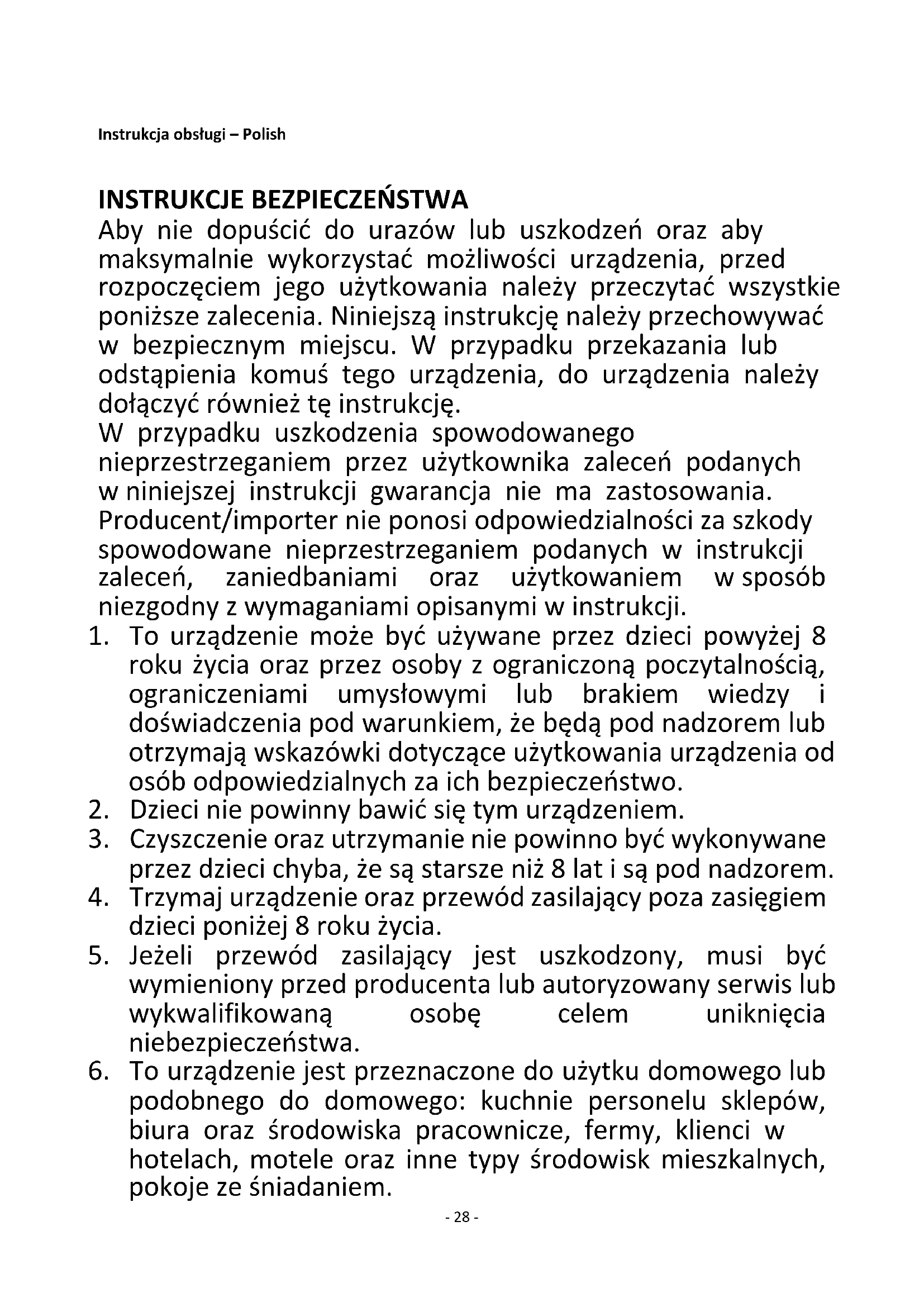 Aby nie dopuścić do urazów lub uszkodzeń oraz aby maksymalnie wykorzystać możliwości urządzenia, przed rozpoczęciem jego użytkowania należy przeczytać wszystkie poniższe zalecenia. Niniejszą instrukcję należy przechowywać w bezpiecznym miejscu. W przypadku przekazania lub odstąpienia komuś tego urządzenia, do urządzenia należy dołączyć również tę instrukcję. W przypadku uszkodzenia spowodowanego nieprzestrzeganiem przez użytkownika zaleceń podanych w niniejszej instrukcji gwarancja nie ma zastosowania. Producent/importer nie ponosi odpowiedzialności za szkody spowodowane nieprzestrzeganiem podanych w instrukcji zaleceń, zaniedbaniami oraz użytkowaniem w sposób niezgodny z wymaganiami opisanymi w instrukcji.