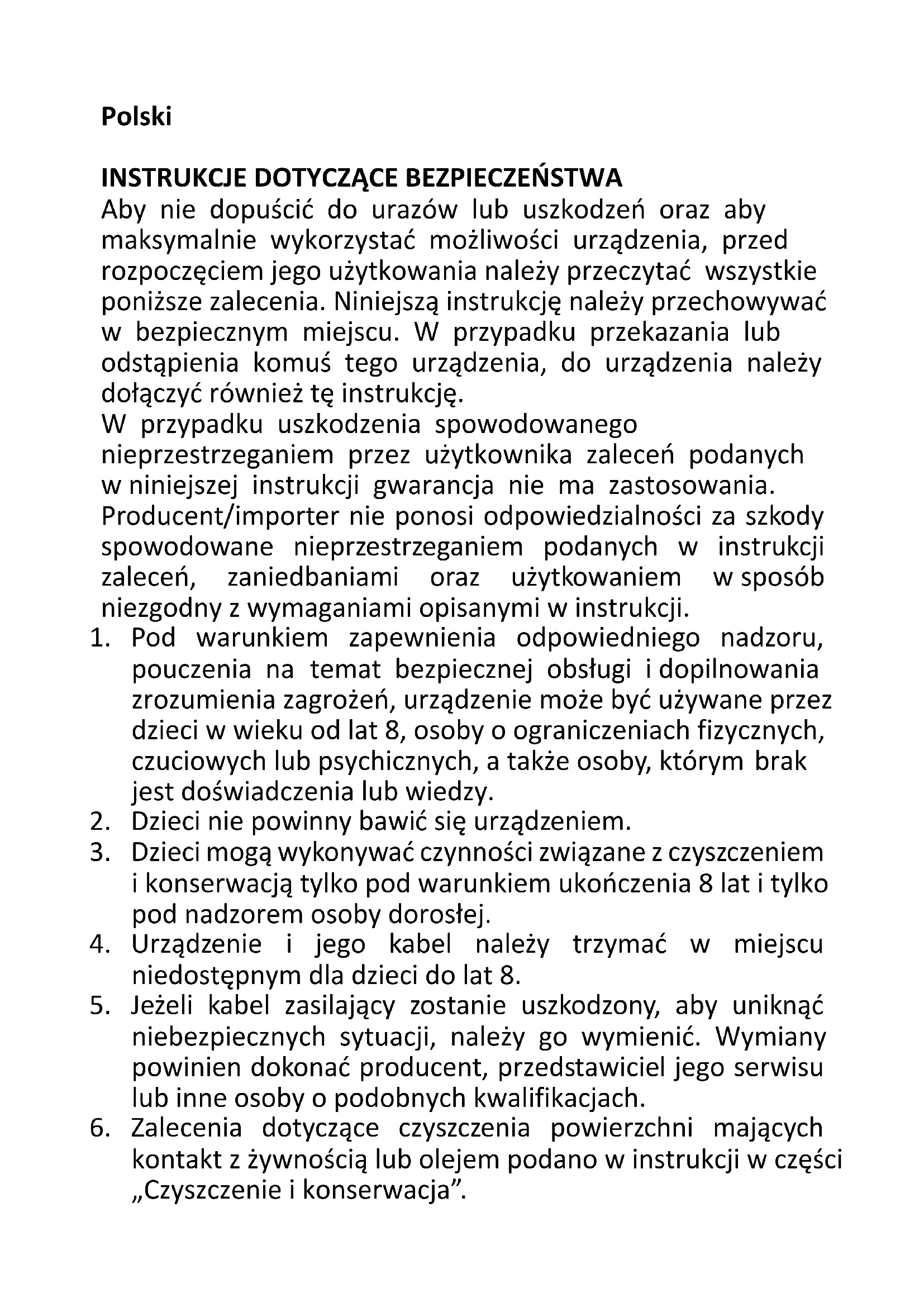 Aby nie dopuścić do urazów lub uszkodzeń oraz aby maksymalnie wykorzystać możliwości urządzenia, przed rozpoczęciem jego użytkowania należy przeczytać wszystkie poniższe zalecenia. Niniejszą instrukcję należy przechowywać w bezpiecznym miejscu. W przypadku przekazania lub odstąpienia komuś tego urządzenia, do urządzenia należy dołączyć również tę instrukcję. W przypadku uszkodzenia spowodowanego nieprzestrzeganiem przez użytkownika zaleceń podanych w niniejszej instrukcji gwarancja nie ma zastosowania. Producent/importer nie ponosi odpowiedzialności za szkody spowodowane nieprzestrzeganiem podanych w instrukcji zaleceń, zaniedbaniami oraz użytkowaniem w sposób niezgodny z wymaganiami opisanymi w instrukcji.