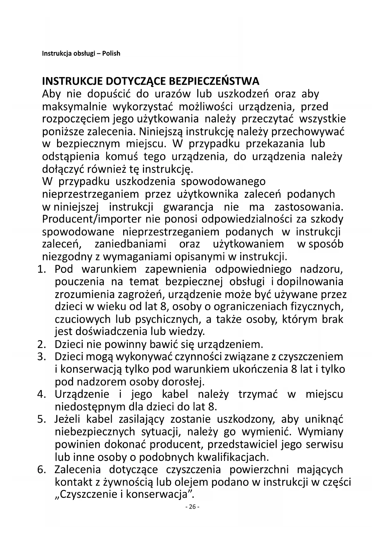 Aby nie dopuścić do urazów lub uszkodzeń oraz aby maksymalnie wykorzystać możliwości urządzenia, przed rozpoczęciem jego użytkowania należy przeczytać wszystkie poniższe zalecenia. Niniejszą instrukcję należy przechowywać w bezpiecznym miejscu. W przypadku przekazania lub odstąpienia komuś tego urządzenia, do urządzenia należy dołączyć również tę instrukcję. W przypadku uszkodzenia spowodowanego nieprzestrzeganiem przez użytkownika zaleceń podanych w niniejszej instrukcji gwarancja nie ma zastosowania. Producent/importer nie ponosi odpowiedzialności za szkody spowodowane nieprzestrzeganiem podanych w instrukcji zaleceń, zaniedbaniami oraz użytkowaniem w sposób niezgodny z wymaganiami opisanymi w instrukcji.