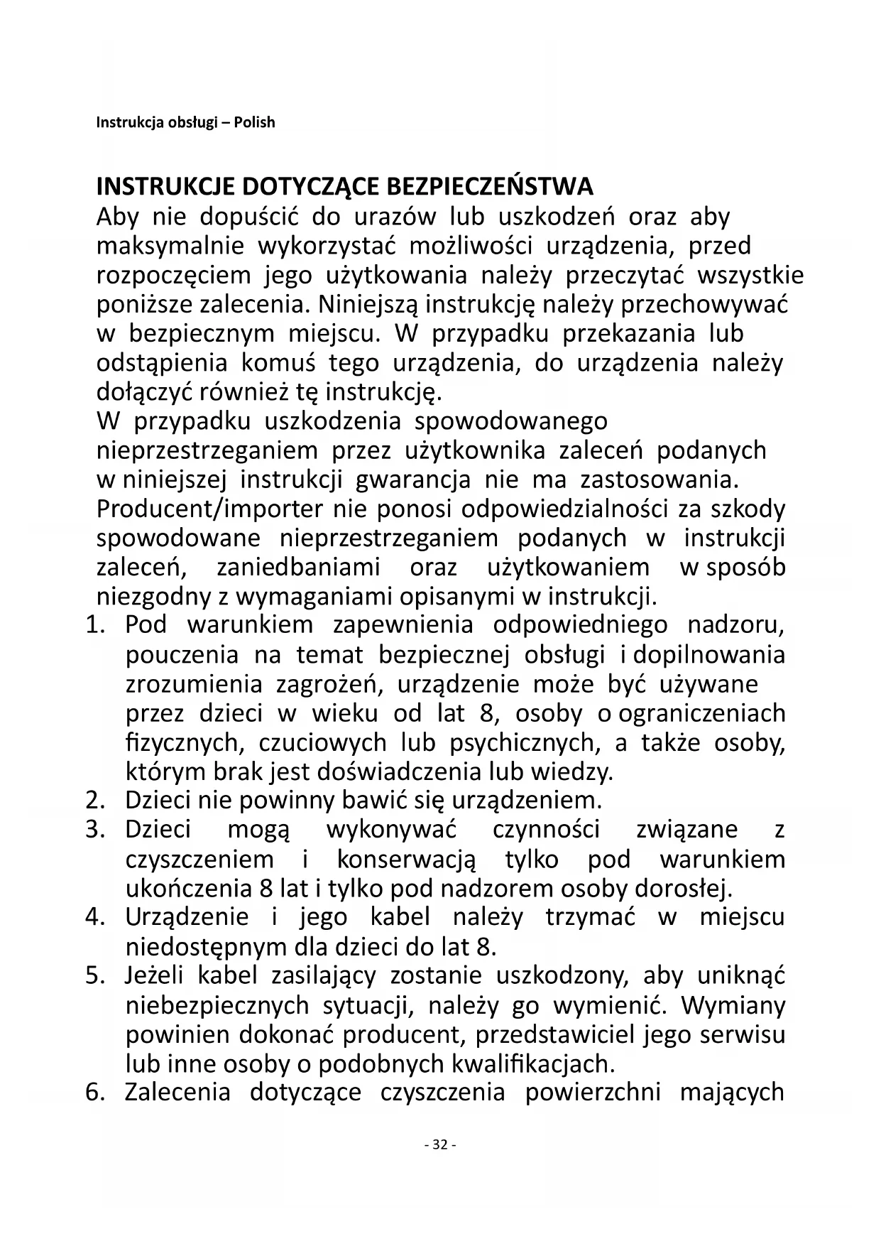 Aby nie dopuścić do urazów lub uszkodzeń oraz aby maksymalnie wykorzystać możliwości urządzenia, przed rozpoczęciem jego użytkowania należy przeczytać wszystkie poniższe zalecenia. Niniejszą instrukcję należy przechowywać w bezpiecznym miejscu. W przypadku przekazania lub odstąpienia komuś tego urządzenia, do urządzenia należy dołączyć również tę instrukcję. W przypadku uszkodzenia spowodowanego nieprzestrzeganiem przez użytkownika zaleceń podanych w niniejszej instrukcji gwarancja nie ma zastosowania. Producent/importer nie ponosi odpowiedzialności za szkody spowodowane nieprzestrzeganiem podanych w instrukcji zaleceń, zaniedbaniami oraz użytkowaniem w sposób niezgodny z wymaganiami opisanymi w instrukcji.