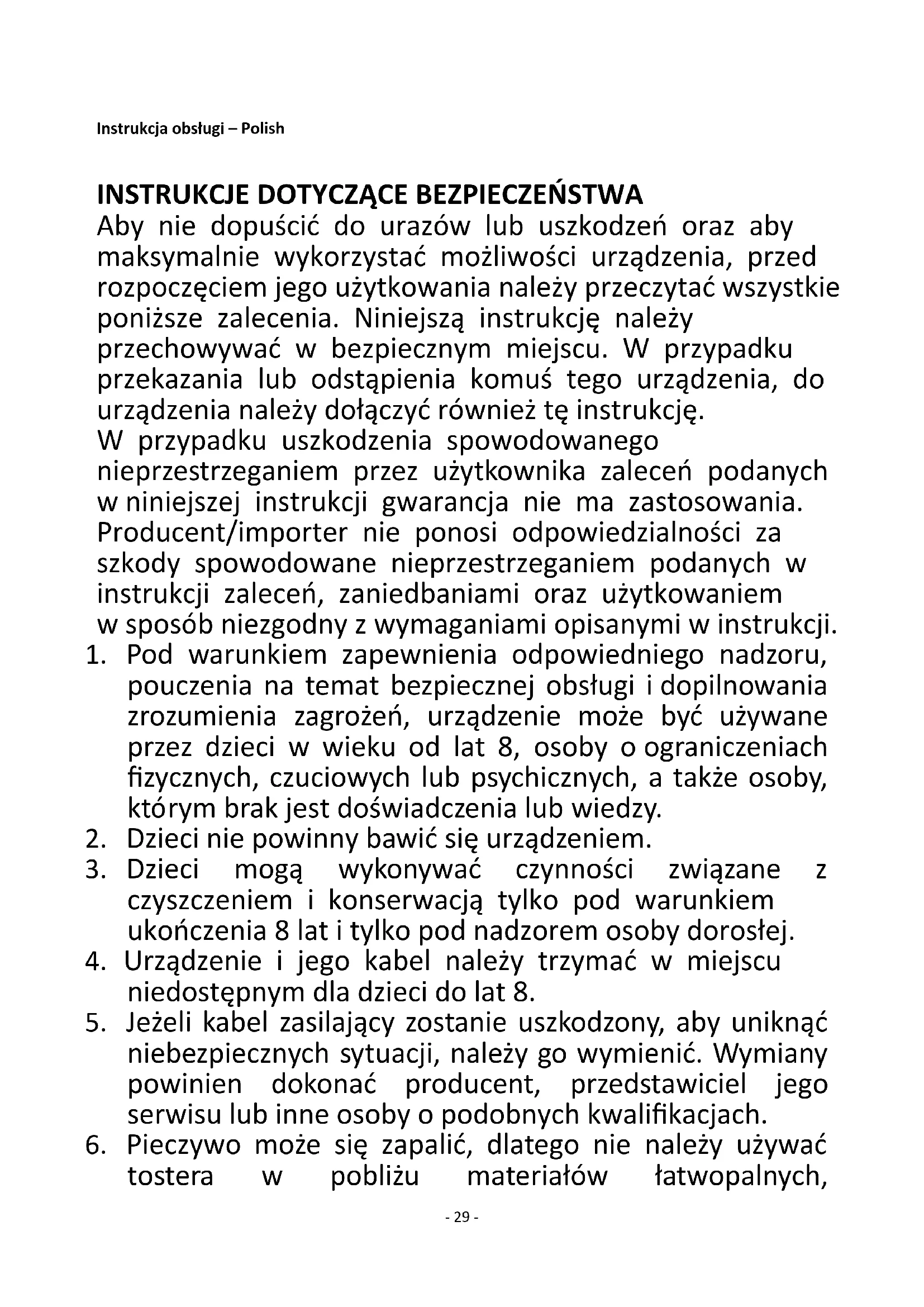 Aby nie dopuścić do urazów lub uszkodzeń oraz aby maksymalnie wykorzystać możliwości urządzenia, przed rozpoczęciem jego użytkowania należy przeczytać wszystkie poniższe zalecenia. Niniejszą instrukcję należy przechowywać w bezpiecznym miejscu. W przypadku przekazania lub odstąpienia komuś tego urządzenia, do urządzenia należy dołączyć również tę instrukcję. W przypadku uszkodzenia spowodowanego nieprzestrzeganiem przez użytkownika zaleceń podanych w niniejszej instrukcji gwarancja nie ma zastosowania. Producent/importer nie ponosi odpowiedzialności za szkody spowodowane nieprzestrzeganiem podanych w instrukcji zaleceń, zaniedbaniami oraz użytkowaniem w sposób niezgodny z wymaganiami opisanymi w instrukcji.