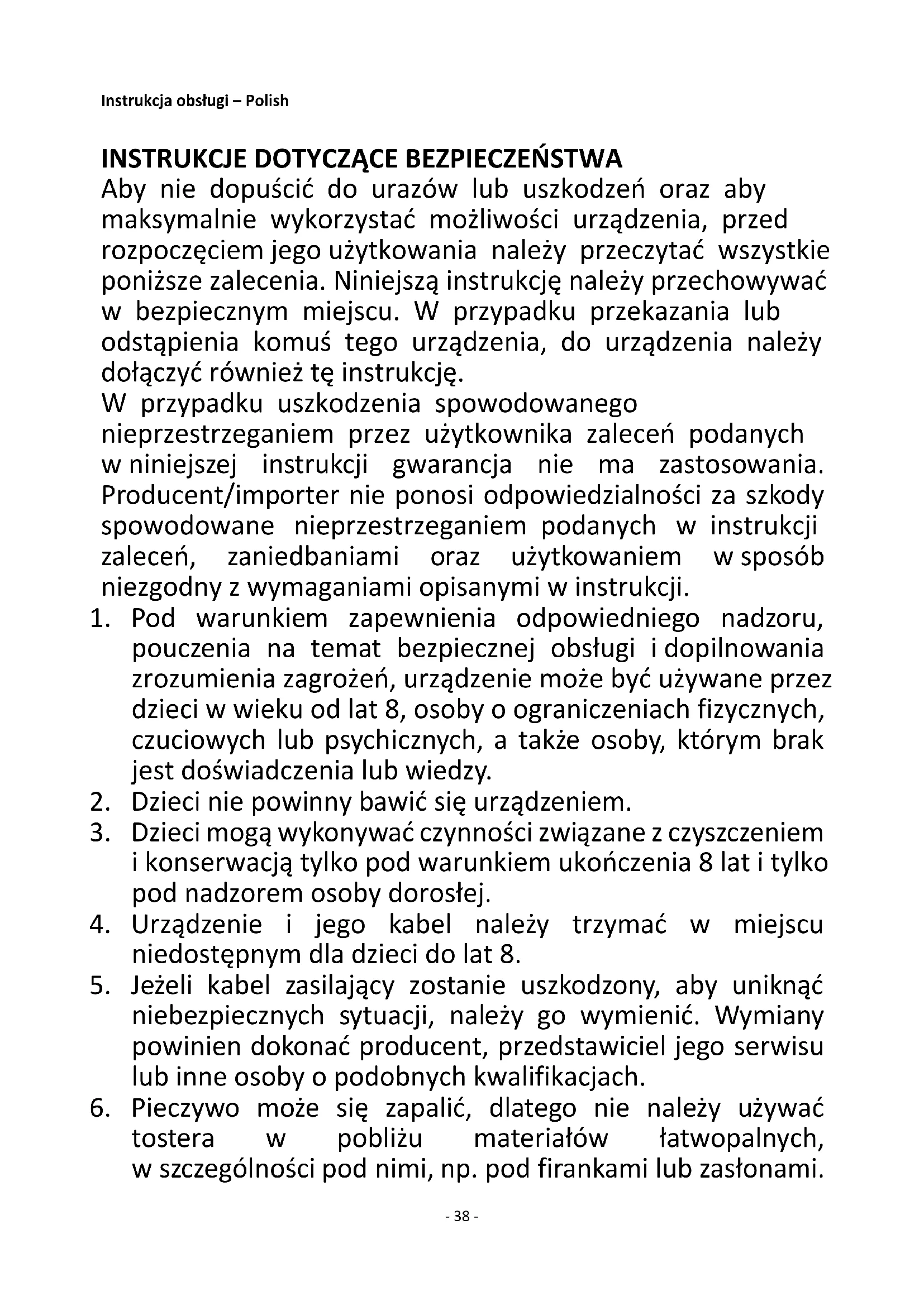 Aby nie dopuścić do urazów lub uszkodzeń oraz aby maksymalnie wykorzystać możliwości urządzenia, przed rozpoczęciem jego użytkowania należy przeczytać wszystkie poniższe zalecenia. Niniejszą instrukcję należy przechowywać w bezpiecznym miejscu. W przypadku przekazania lub odstąpienia komuś tego urządzenia, do urządzenia należy dołączyć również tę instrukcję. W przypadku uszkodzenia spowodowanego nieprzestrzeganiem przez użytkownika zaleceń podanych w niniejszej instrukcji gwarancja nie ma zastosowania. Producent/importer nie ponosi odpowiedzialności za szkody spowodowane nieprzestrzeganiem podanych w instrukcji zaleceń, zaniedbaniami oraz użytkowaniem w sposób niezgodny z wymaganiami opisanymi w instrukcji.