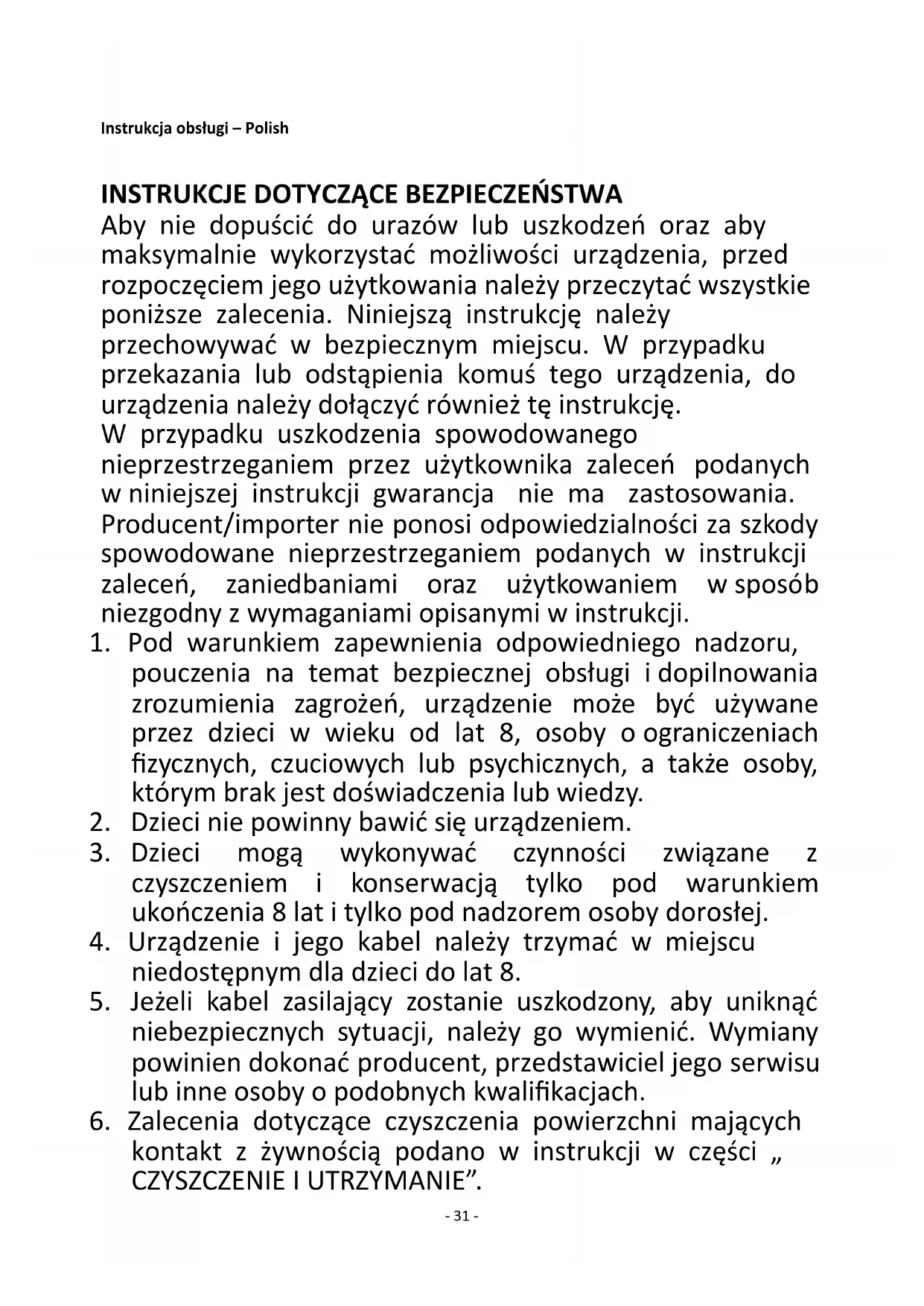 Aby nie dopuścić do urazów lub uszkodzeń oraz aby maksymalnie wykorzystać możliwości urządzenia, przed rozpoczęciem jego użytkowania należy przeczytać wszystkie poniższe zalecenia. Niniejszą instrukcję należy przechowywać w bezpiecznym miejscu. W przypadku przekazania lub odstąpienia komuś tego urządzenia, do urządzenia należy dołączyć również tę instrukcję. W przypadku uszkodzenia spowodowanego nieprzestrzeganiem przez użytkownika zaleceń podanych w niniejszej instrukcji gwarancja nie ma zastosowania. Producent/importer nie ponosi odpowiedzialności za szkody spowodowane nieprzestrzeganiem podanych w instrukcji zaleceń, zaniedbaniami oraz użytkowaniem w sposób niezgodny z wymaganiami opisanymi w instrukcji.