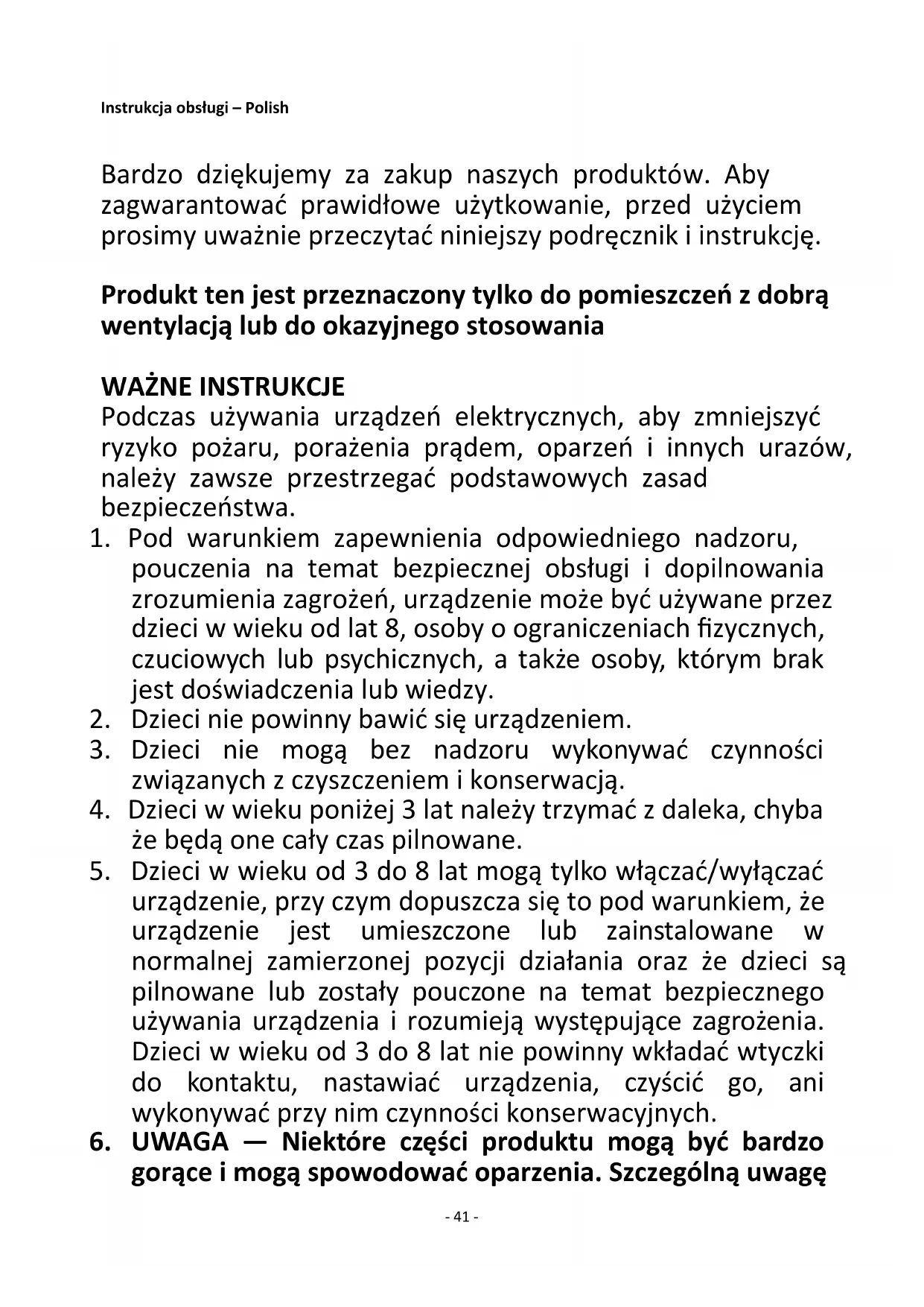 urządzenie, przy czym dopuszcza się to pod warunkiem, że urządzenie jest umieszczone lub zainstalowane w normalnej zamierzonej pozycji działania oraz że dzieci są pilnowane lub zostały pouczone na temat bezpiecznego używania urządzenia i rozumieją występujące zagrożenia. Dzieci w wieku od 3 do 8 lat nie powinny wkładać wtyczki do kontaktu, nastawiać urządzenia, czyścić go, ani wykonywać przy nim czynności konserwacyjnych.