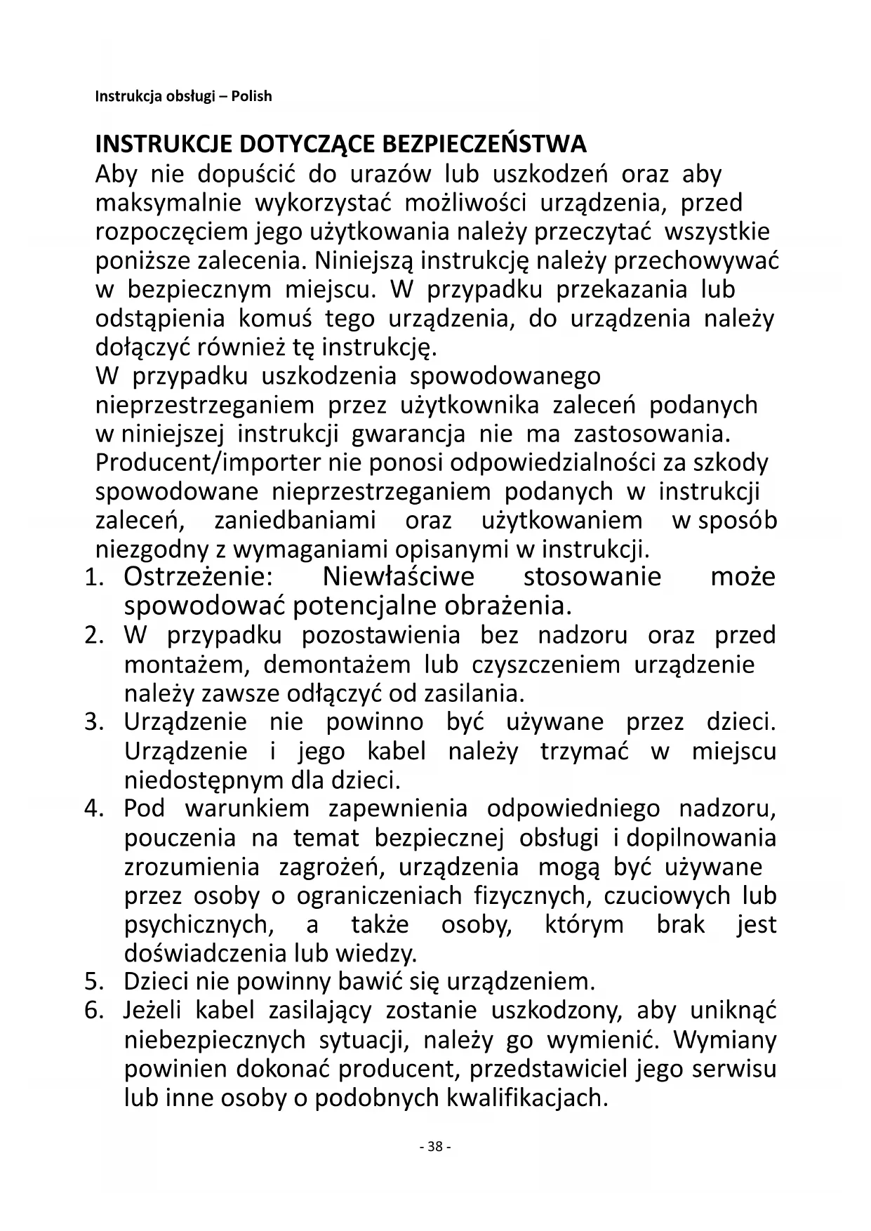 Aby nie dopuścić do urazów lub uszkodzeń oraz aby maksymalnie wykorzystać możliwości urządzenia, przed rozpoczęciem jego użytkowania należy przeczytać wszystkie poniższe zalecenia. Niniejszą instrukcję należy przechowywać w bezpiecznym miejscu. W przypadku przekazania lub odstąpienia komuś tego urządzenia, do urządzenia należy dołączyć również tę instrukcję. W przypadku uszkodzenia spowodowanego nieprzestrzeganiem przez użytkownika zaleceń podanych w niniejszej instrukcji gwarancja nie ma zastosowania. Producent/importer nie ponosi odpowiedzialności za szkody spowodowane nieprzestrzeganiem podanych w instrukcji zaleceń, zaniedbaniami oraz użytkowaniem w sposób niezgodny z wymaganiami opisanymi w instrukcji.