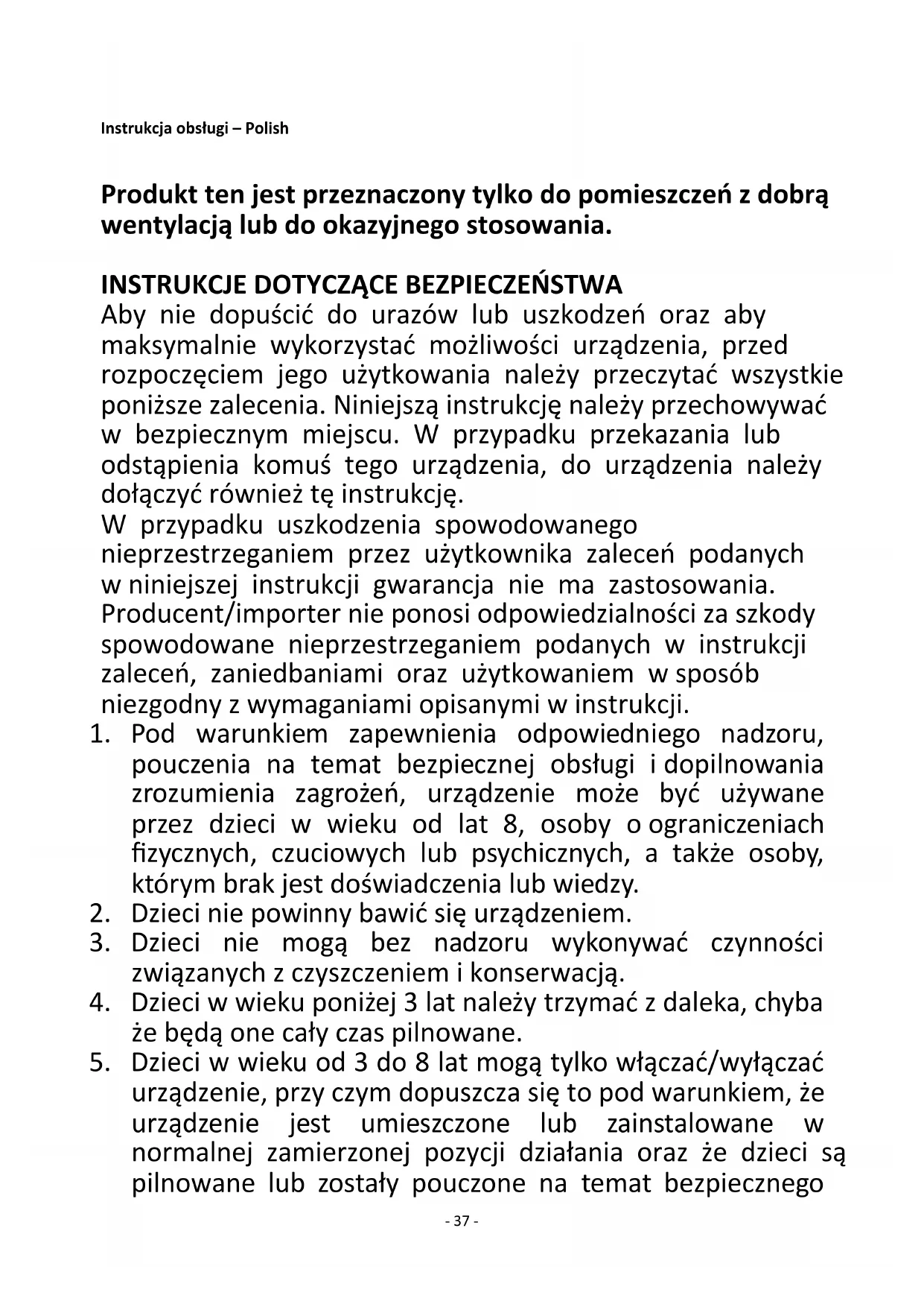 urządzenie, przy czym dopuszcza się to pod warunkiem, że urządzenie jest umieszczone lub zainstalowane w normalnej zamierzonej pozycji działania oraz że dzieci są pilnowane lub zostały pouczone na temat bezpiecznego- 38 - używania urządzenia i rozumieją występujące zagrożenia. Dzieci w wieku od 3 do 8 lat nie powinny wkładać wtyczki do kontaktu, nastawiać urządzenia, czyścić go, ani wykonywać przy nim czynności konserwacyjnych.