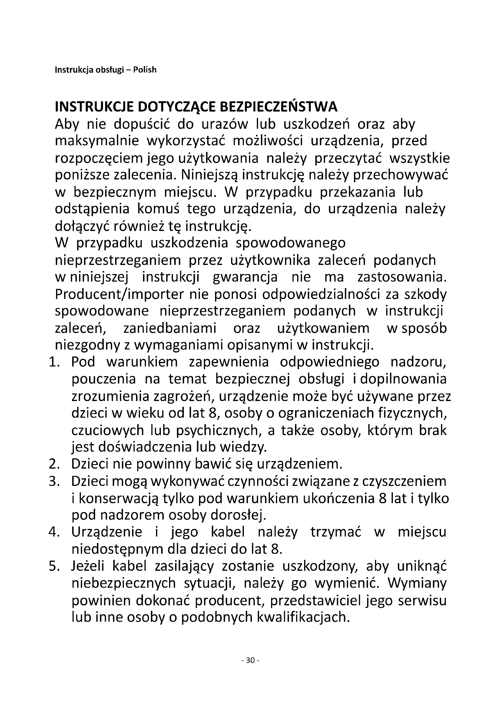 Aby nie dopuścić do urazów lub uszkodzeń oraz aby maksymalnie wykorzystać możliwości urządzenia, przed rozpoczęciem jego użytkowania należy przeczytać wszystkie poniższe zalecenia. Niniejszą instrukcję należy przechowywać w bezpiecznym miejscu. W przypadku przekazania lub odstąpienia komuś tego urządzenia, do urządzenia należy dołączyć również tę instrukcję. W przypadku uszkodzenia spowodowanego nieprzestrzeganiem przez użytkownika zaleceń podanych w niniejszej instrukcji gwarancja nie ma zastosowania. Producent/importer nie ponosi odpowiedzialności za szkody spowodowane nieprzestrzeganiem podanych w instrukcji zaleceń, zaniedbaniami oraz użytkowaniem w sposób niezgodny z wymaganiami opisanymi w instrukcji.