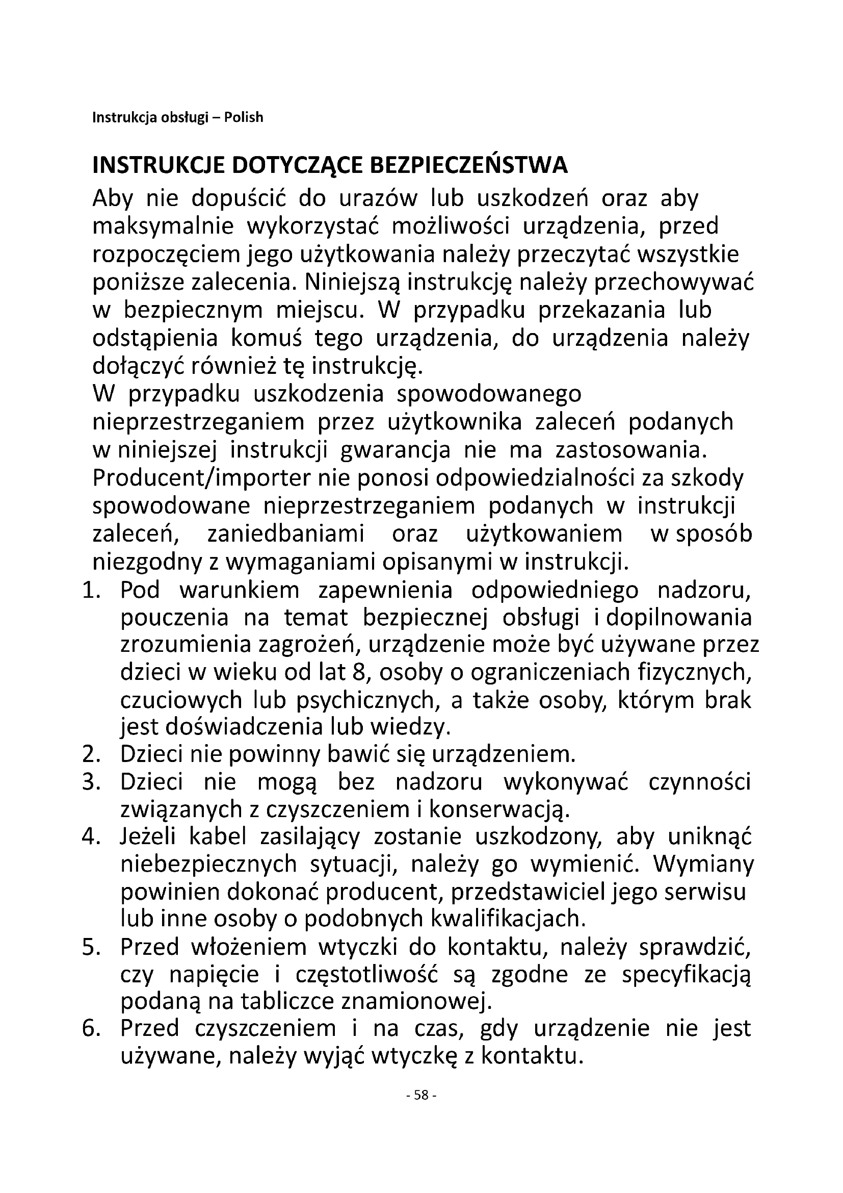 Aby nie dopuścić do urazów lub uszkodzeń oraz aby maksymalnie wykorzystać możliwości urządzenia, przed rozpoczęciem jego użytkowania należy przeczytać wszystkie poniższe zalecenia. Niniejszą instrukcję należy przechowywać w bezpiecznym miejscu. W przypadku przekazania lub odstąpienia komuś tego urządzenia, do urządzenia należy dołączyć również tę instrukcję. W przypadku uszkodzenia spowodowanego nieprzestrzeganiem przez użytkownika zaleceń podanych w niniejszej instrukcji gwarancja nie ma zastosowania. Producent/importer nie ponosi odpowiedzialności za szkody spowodowane nieprzestrzeganiem podanych w instrukcji zaleceń, zaniedbaniami oraz użytkowaniem w sposób niezgodny z wymaganiami opisanymi w instrukcji.