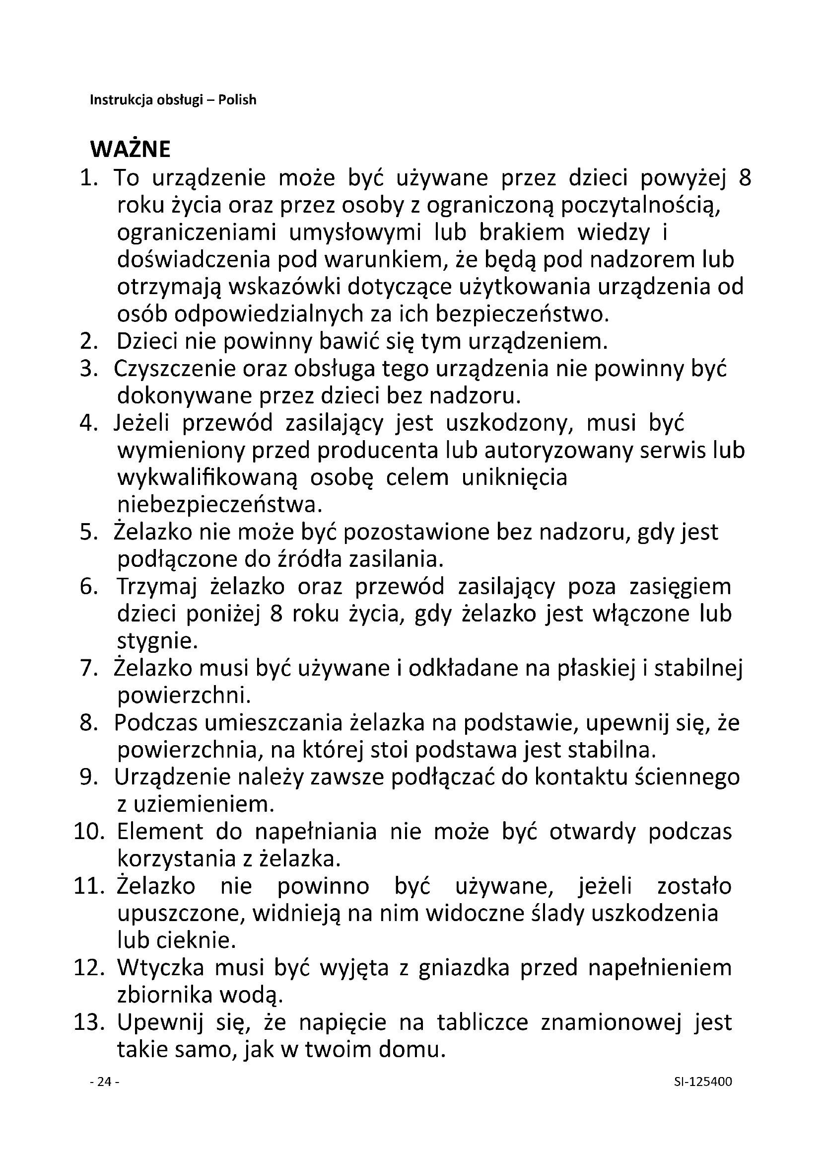 sposób uszkodzone, albo wtyczka u przewód mają- 26 - SI-125400 widoczne uszkodzenia. W przypadku uszkodzenia, zanieś urządzenie do elektryka celem sprawdzenia I ewentualnej naprawy.