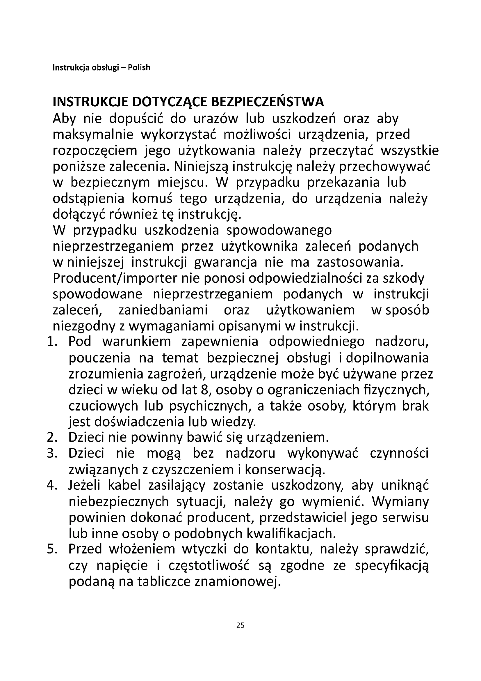 Aby nie dopuścić do urazów lub uszkodzeń oraz aby maksymalnie wykorzystać możliwości urządzenia, przed rozpoczęciem jego użytkowania należy przeczytać wszystkie poniższe zalecenia. Niniejszą instrukcję należy przechowywać w bezpiecznym miejscu. W przypadku przekazania lub odstąpienia komuś tego urządzenia, do urządzenia należy dołączyć również tę instrukcję. W przypadku uszkodzenia spowodowanego nieprzestrzeganiem przez użytkownika zaleceń podanych w niniejszej instrukcji gwarancja nie ma zastosowania. Producent/importer nie ponosi odpowiedzialności za szkody spowodowane nieprzestrzeganiem podanych w instrukcji zaleceń, zaniedbaniami oraz użytkowaniem w sposób niezgodny z wymaganiami opisanymi w instrukcji.