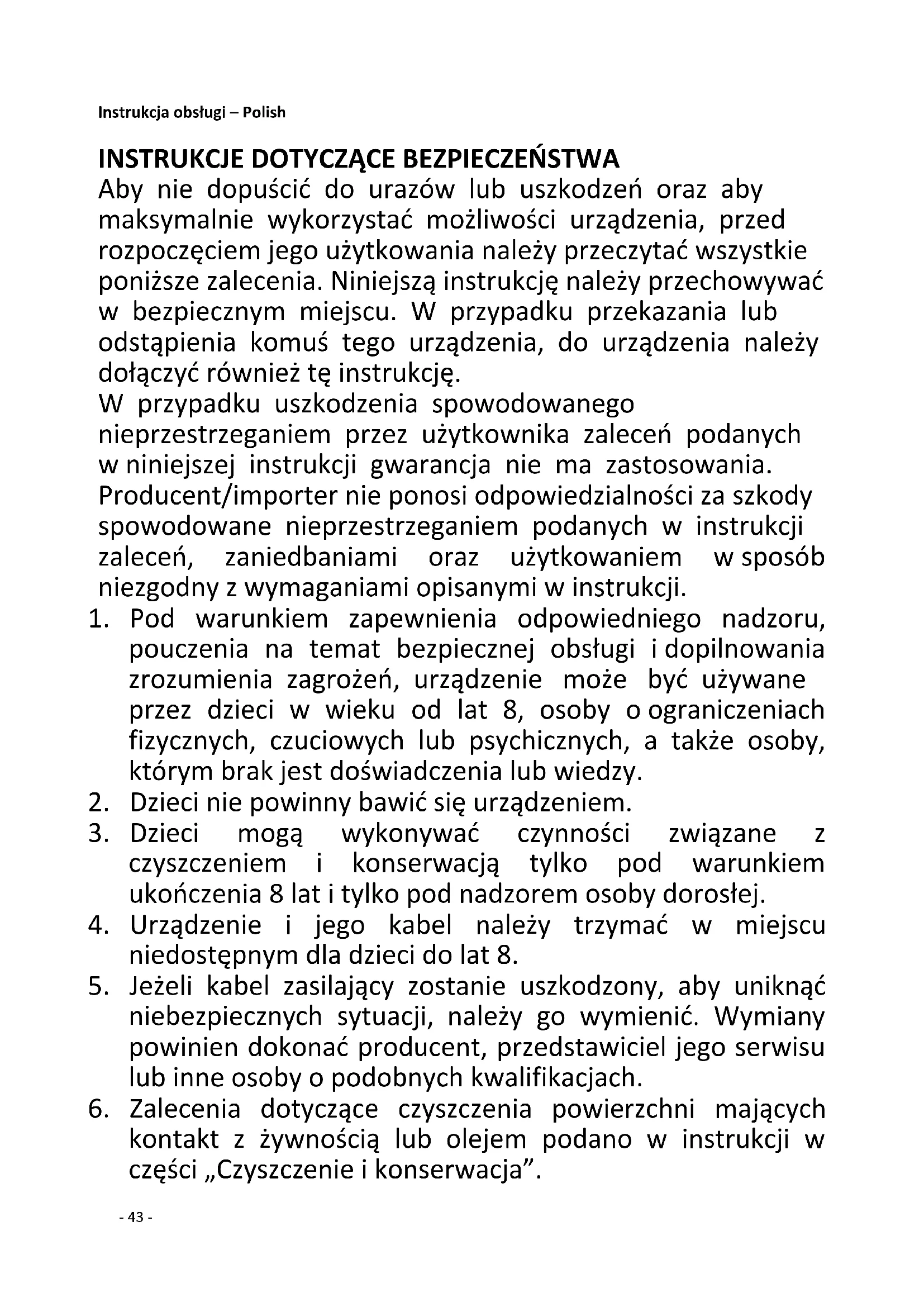 Aby nie dopuścić do urazów lub uszkodzeń oraz aby maksymalnie wykorzystać możliwości urządzenia, przed rozpoczęciem jego użytkowania należy przeczytać wszystkie poniższe zalecenia. Niniejszą instrukcję należy przechowywać w bezpiecznym miejscu. W przypadku przekazania lub odstąpienia komuś tego urządzenia, do urządzenia należy dołączyć również tę instrukcję. W przypadku uszkodzenia spowodowanego nieprzestrzeganiem przez użytkownika zaleceń podanych w niniejszej instrukcji gwarancja nie ma zastosowania. Producent/importer nie ponosi odpowiedzialności za szkody spowodowane nieprzestrzeganiem podanych w instrukcji zaleceń, zaniedbaniami oraz użytkowaniem w sposób niezgodny z wymaganiami opisanymi w instrukcji.