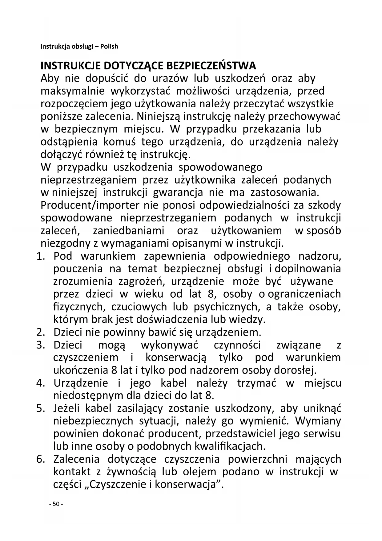 Aby nie dopuścić do urazów lub uszkodzeń oraz aby maksymalnie wykorzystać możliwości urządzenia, przed rozpoczęciem jego użytkowania należy przeczytać wszystkie poniższe zalecenia. Niniejszą instrukcję należy przechowywać w bezpiecznym miejscu. W przypadku przekazania lub odstąpienia komuś tego urządzenia, do urządzenia należy dołączyć również tę instrukcję. W przypadku uszkodzenia spowodowanego nieprzestrzeganiem przez użytkownika zaleceń podanych w niniejszej instrukcji gwarancja nie ma zastosowania. Producent/importer nie ponosi odpowiedzialności za szkody spowodowane nieprzestrzeganiem podanych w instrukcji zaleceń, zaniedbaniami oraz użytkowaniem w sposób niezgodny z wymaganiami opisanymi w instrukcji.