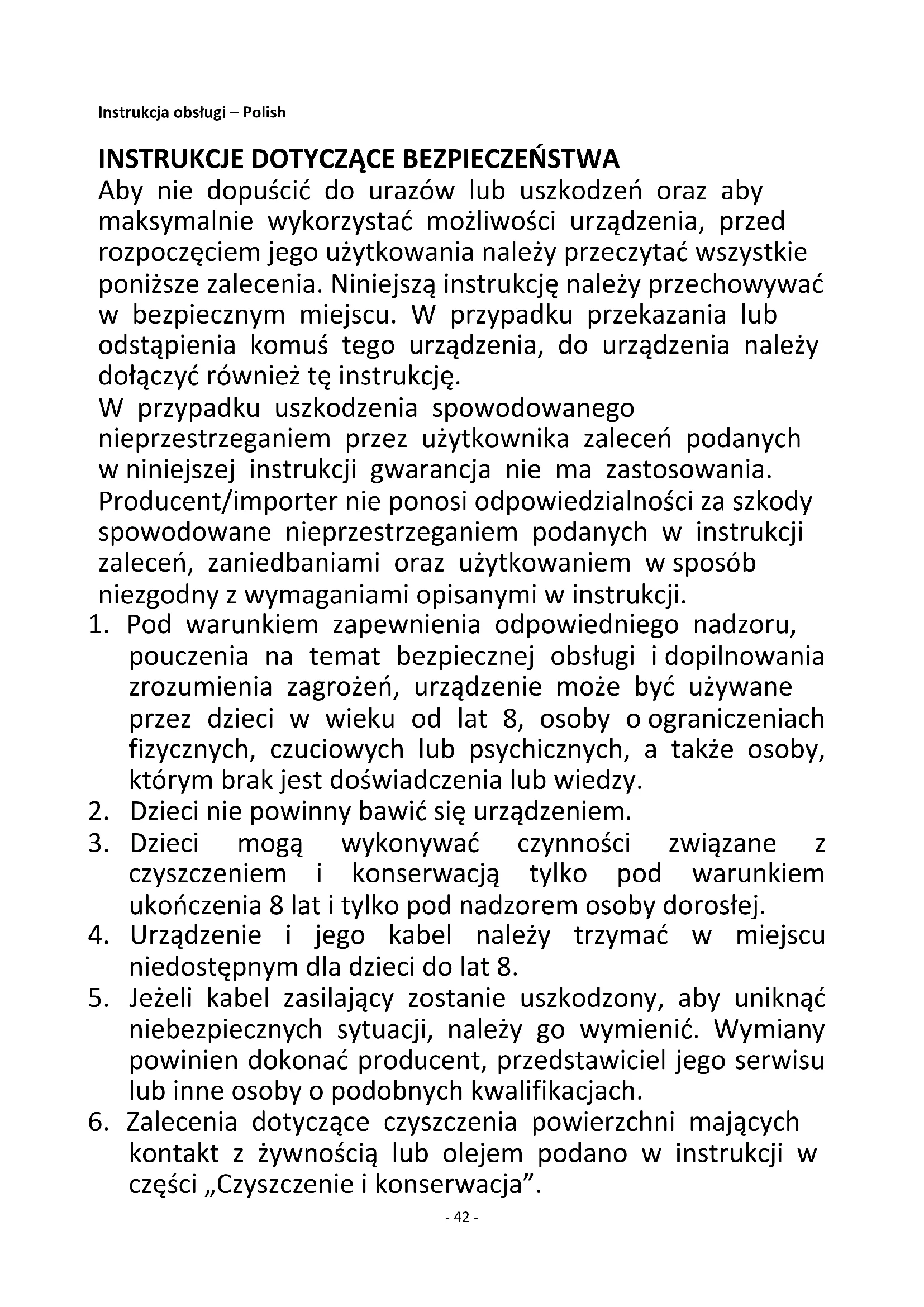 Aby nie dopuścić do urazów lub uszkodzeń oraz aby maksymalnie wykorzystać możliwości urządzenia, przed rozpoczęciem jego użytkowania należy przeczytać wszystkie poniższe zalecenia. Niniejszą instrukcję należy przechowywać w bezpiecznym miejscu. W przypadku przekazania lub odstąpienia komuś tego urządzenia, do urządzenia należy dołączyć również tę instrukcję. W przypadku uszkodzenia spowodowanego nieprzestrzeganiem przez użytkownika zaleceń podanych w niniejszej instrukcji gwarancja nie ma zastosowania. Producent/importer nie ponosi odpowiedzialności za szkody spowodowane nieprzestrzeganiem podanych w instrukcji zaleceń, zaniedbaniami oraz użytkowaniem w sposób niezgodny z wymaganiami opisanymi w instrukcji.