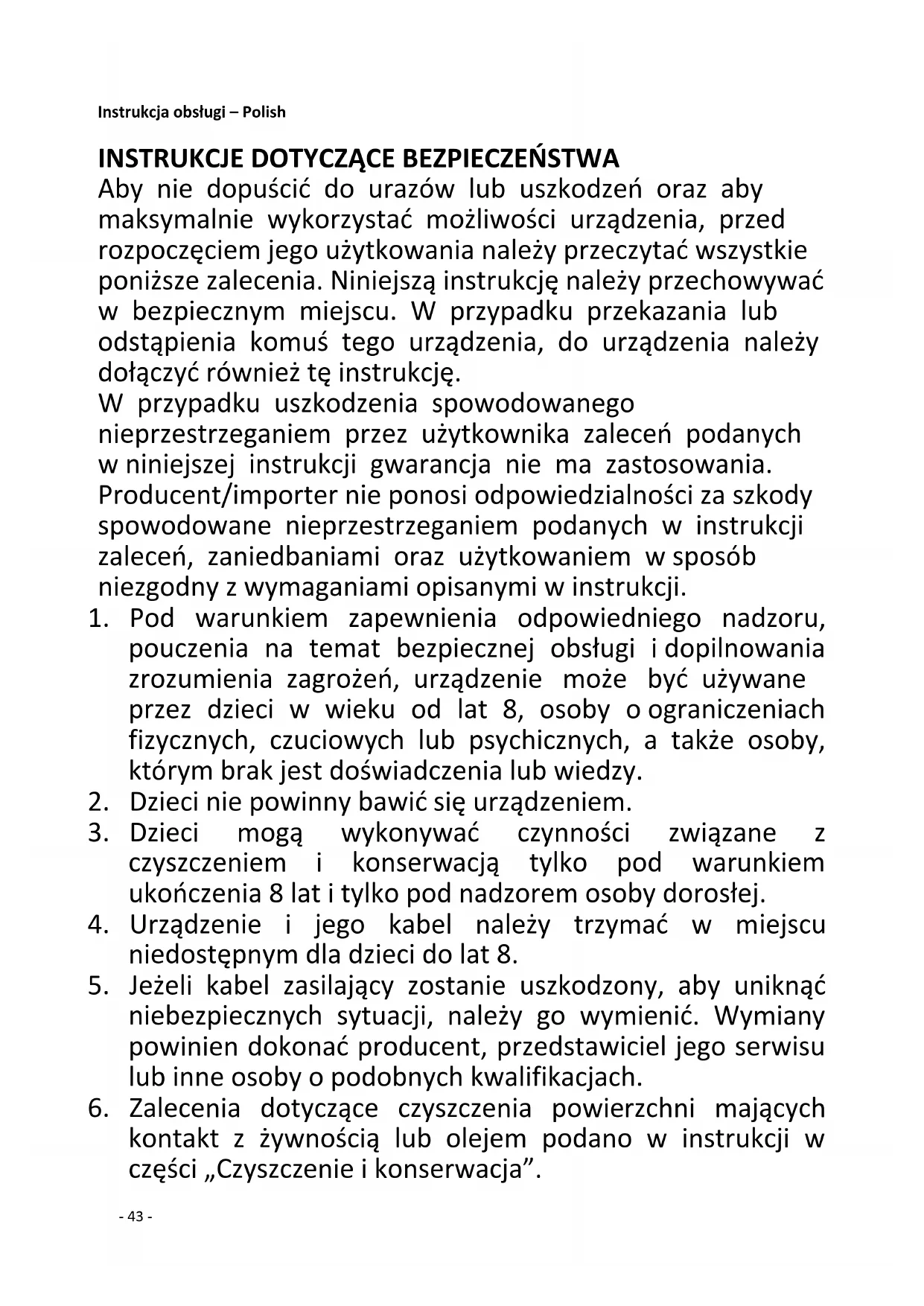Aby nie dopuścić do urazów lub uszkodzeń oraz aby maksymalnie wykorzystać możliwości urządzenia, przed rozpoczęciem jego użytkowania należy przeczytać wszystkie poniższe zalecenia. Niniejszą instrukcję należy przechowywać w bezpiecznym miejscu. W przypadku przekazania lub odstąpienia komuś tego urządzenia, do urządzenia należy dołączyć również tę instrukcję. W przypadku uszkodzenia spowodowanego nieprzestrzeganiem przez użytkownika zaleceń podanych w niniejszej instrukcji gwarancja nie ma zastosowania. Producent/importer nie ponosi odpowiedzialności za szkody spowodowane nieprzestrzeganiem podanych w instrukcji zaleceń, zaniedbaniami oraz użytkowaniem w sposób niezgodny z wymaganiami opisanymi w instrukcji.