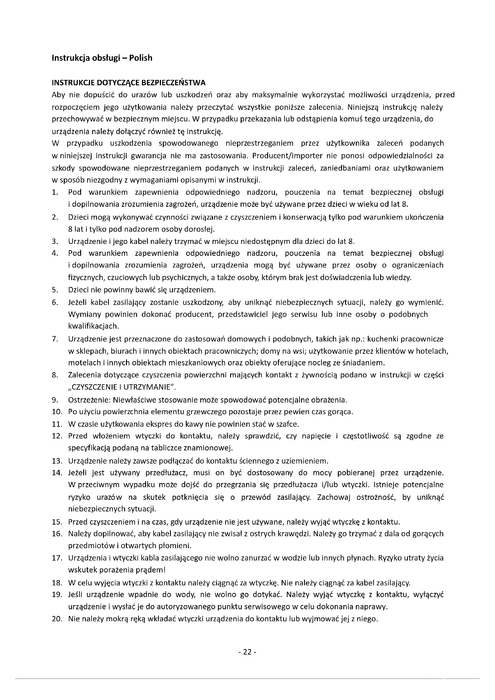 22. W czasie użytkowania nie należy nigdy zostawiać urządzenia bez nadzoru.