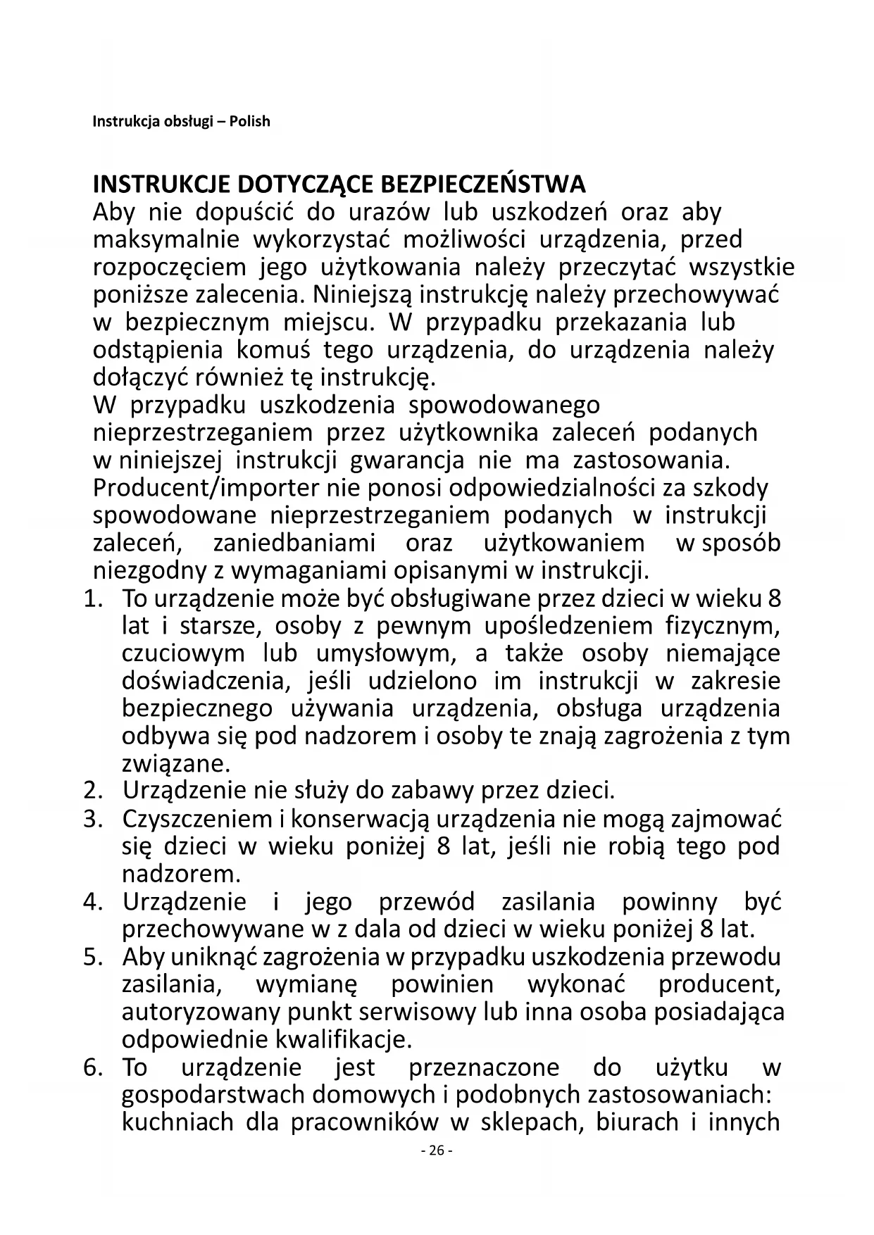Aby nie dopuścić do urazów lub uszkodzeń oraz aby maksymalnie wykorzystać możliwości urządzenia, przed rozpoczęciem jego użytkowania należy przeczytać wszystkie poniższe zalecenia. Niniejszą instrukcję należy przechowywać w bezpiecznym miejscu. W przypadku przekazania lub odstąpienia komuś tego urządzenia, do urządzenia należy dołączyć również tę instrukcję. W przypadku uszkodzenia spowodowanego nieprzestrzeganiem przez użytkownika zaleceń podanych w niniejszej instrukcji gwarancja nie ma zastosowania. Producent/importer nie ponosi odpowiedzialności za szkody spowodowane nieprzestrzeganiem podanych w instrukcji zaleceń, zaniedbaniami oraz użytkowaniem w sposób niezgodny z wymaganiami opisanymi w instrukcji.