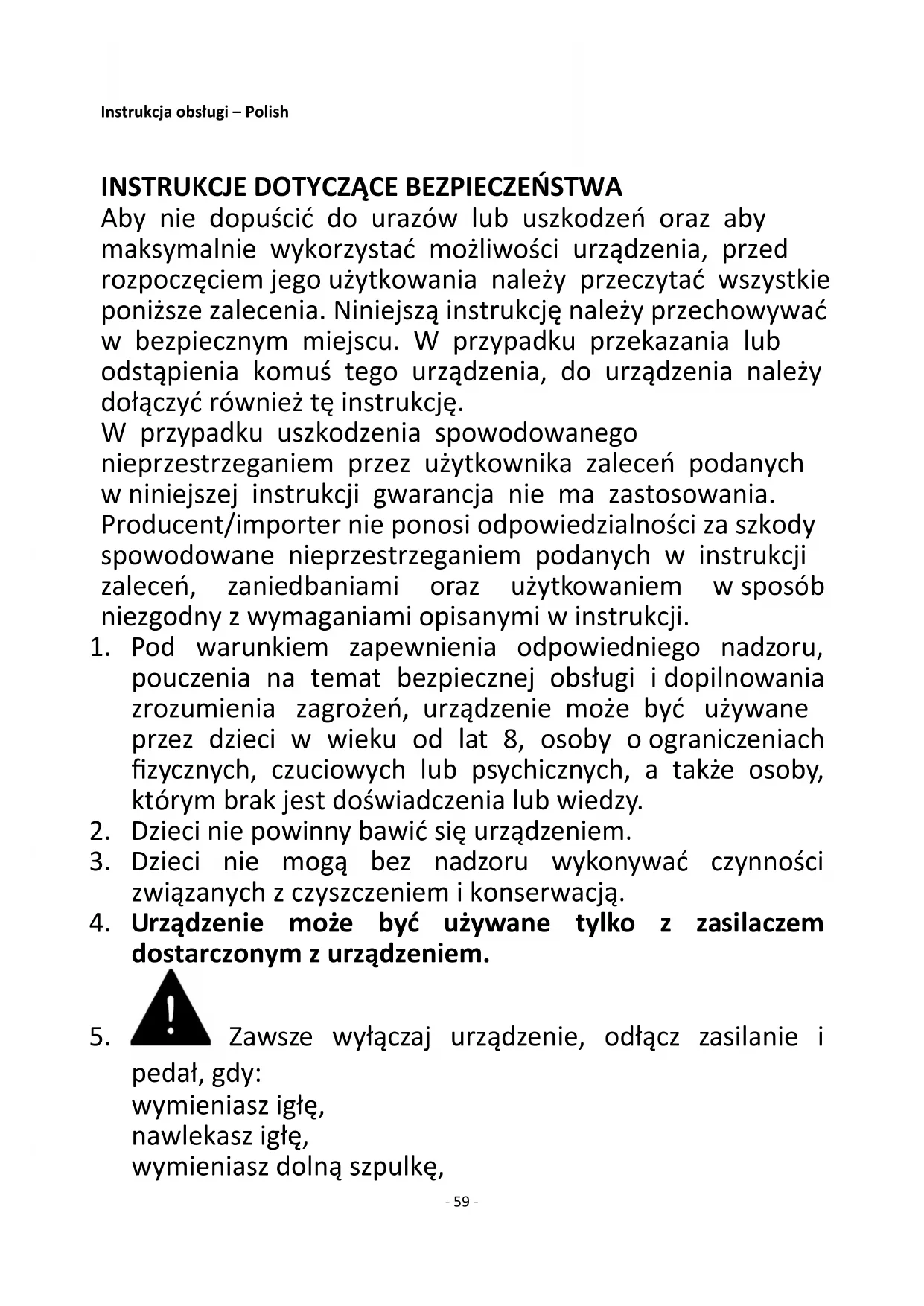 pedał, gdy: wymieniasz igłę, nawlekasz igłę, wymieniasz dolną szpulkę,- 60 - wymieniasz którąkolwiek część maszyny, czyścisz maszynę, po każdym użyciu.