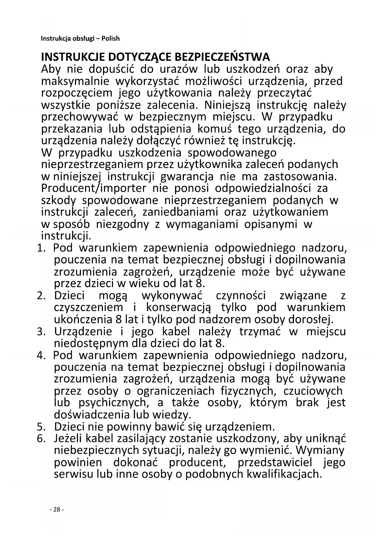 Aby nie dopuścić do urazów lub uszkodzeń oraz aby maksymalnie wykorzystać możliwości urządzenia, przed rozpoczęciem jego użytkowania należy przeczytać wszystkie poniższe zalecenia. Niniejszą instrukcję należy przechowywać w bezpiecznym miejscu. W przypadku przekazania lub odstąpienia komuś tego urządzenia, do urządzenia należy dołączyć również tę instrukcję. W przypadku uszkodzenia spowodowanego nieprzestrzeganiem przez użytkownika zaleceń podanych w niniejszej instrukcji gwarancja nie ma zastosowania. Producent/importer nie ponosi odpowiedzialności za szkody spowodowane nieprzestrzeganiem podanych w instrukcji zaleceń, zaniedbaniami oraz użytkowaniem w sposób niezgodny z wymaganiami opisanymi w instrukcji.