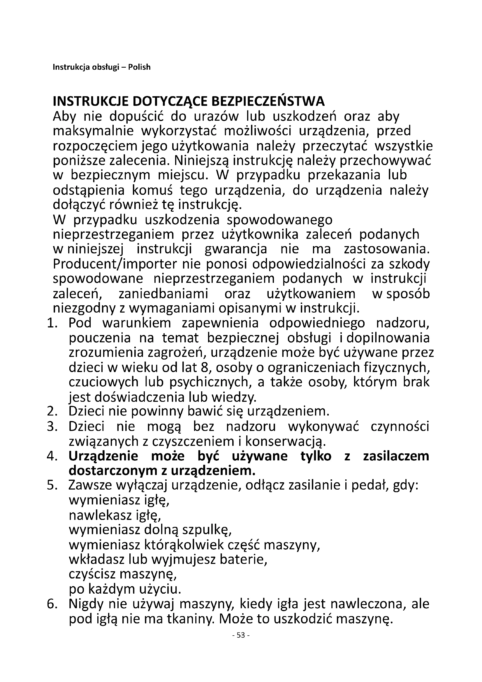 Aby nie dopuścić do urazów lub uszkodzeń oraz aby maksymalnie wykorzystać możliwości urządzenia, przed rozpoczęciem jego użytkowania należy przeczytać wszystkie poniższe zalecenia. Niniejszą instrukcję należy przechowywać w bezpiecznym miejscu. W przypadku przekazania lub odstąpienia komuś tego urządzenia, do urządzenia należy dołączyć również tę instrukcję. W przypadku uszkodzenia spowodowanego nieprzestrzeganiem przez użytkownika zaleceń podanych w niniejszej instrukcji gwarancja nie ma zastosowania. Producent/importer nie ponosi odpowiedzialności za szkody spowodowane nieprzestrzeganiem podanych w instrukcji zaleceń, zaniedbaniami oraz użytkowaniem w sposób niezgodny z wymaganiami opisanymi w instrukcji.