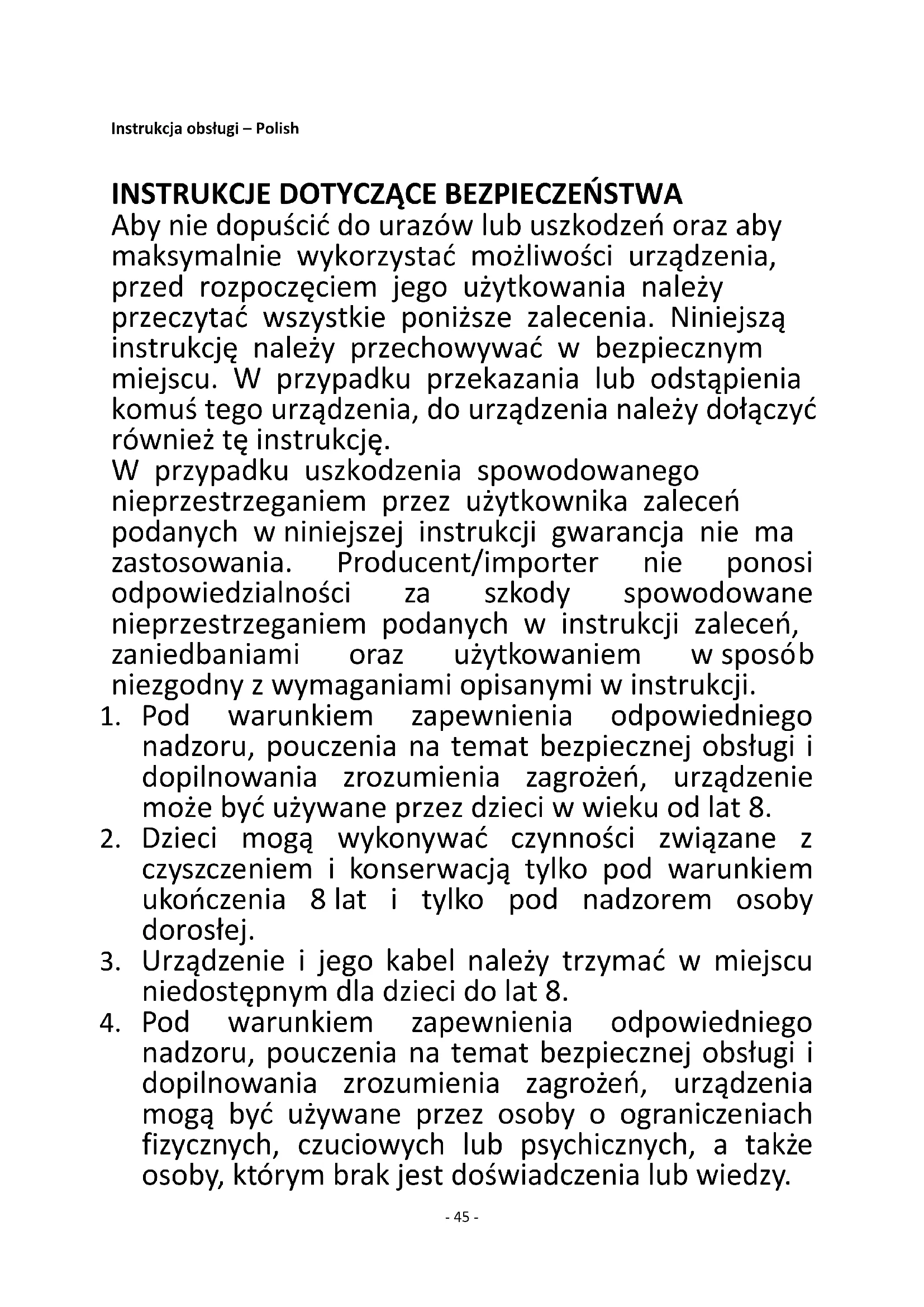nadzoru, pouczenia na temat bezpiecznej obsługi i dopilnowania zrozumienia zagrożeń, urządzenia mogą być używane przez osoby o ograniczeniach fizycznych, czuciowych lub psychicznych, a także osoby, którym brak jest doświadczenia lub wiedzy.- 46 -