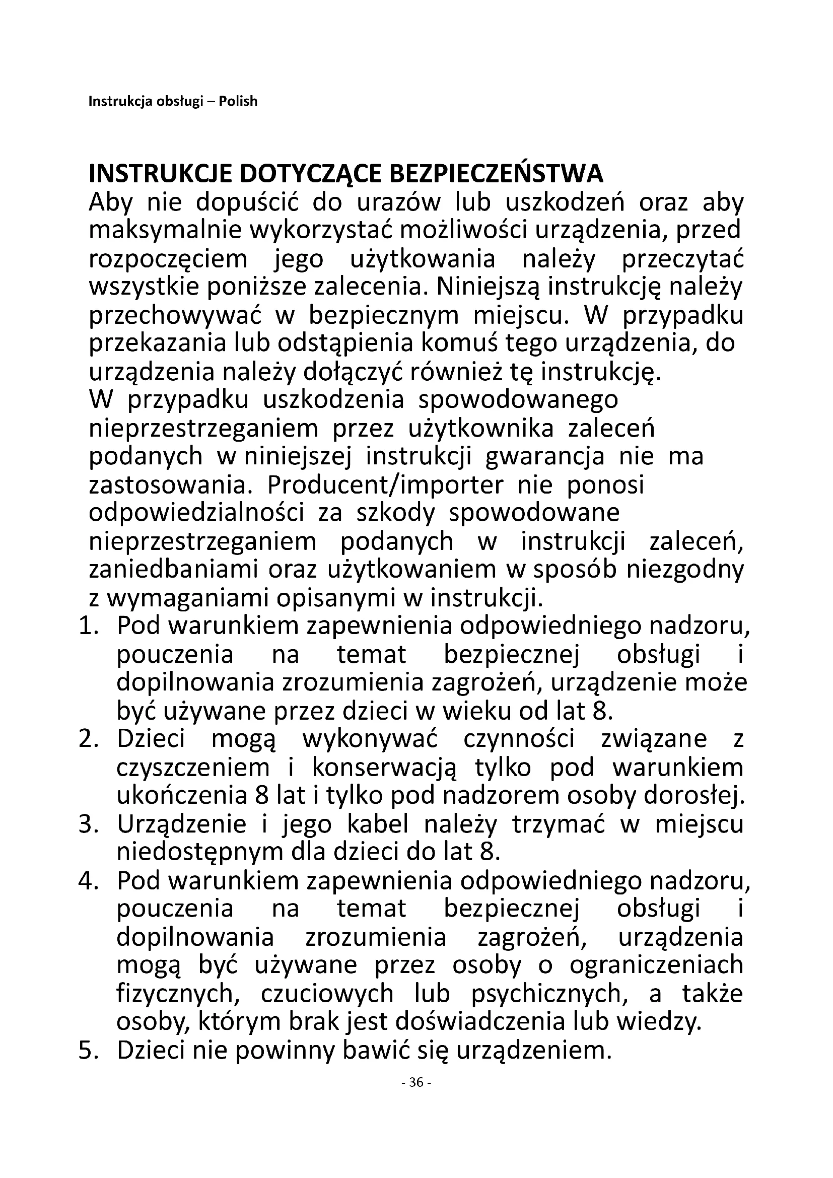 Aby nie dopuścić do urazów lub uszkodzeń oraz aby maksymalnie wykorzystać możliwości urządzenia, przed rozpoczęciem jego użytkowania należy przeczytać wszystkie poniższe zalecenia. Niniejszą instrukcję należy przechowywać w bezpiecznym miejscu. W przypadku przekazania lub odstąpienia komuś tego urządzenia, do urządzenia należy dołączyć również tę instrukcję. W przypadku uszkodzenia spowodowanego nieprzestrzeganiem przez użytkownika zaleceń podanych w niniejszej instrukcji gwarancja nie ma zastosowania. Producent/importer nie ponosi odpowiedzialności za szkody spowodowane nieprzestrzeganiem podanych w instrukcji zaleceń, zaniedbaniami oraz użytkowaniem w sposób niezgodny z wymaganiami opisanymi w instrukcji.