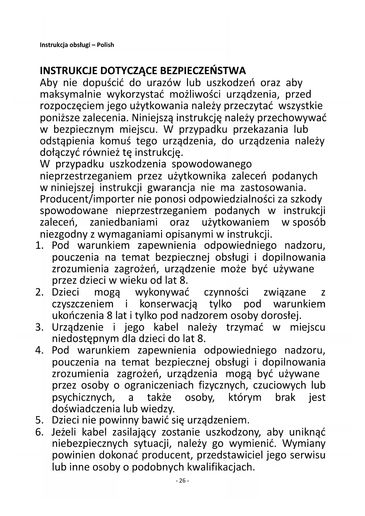 Aby nie dopuścić do urazów lub uszkodzeń oraz aby maksymalnie wykorzystać możliwości urządzenia, przed rozpoczęciem jego użytkowania należy przeczytać wszystkie poniższe zalecenia. Niniejszą instrukcję należy przechowywać w bezpiecznym miejscu. W przypadku przekazania lub odstąpienia komuś tego urządzenia, do urządzenia należy dołączyć również tę instrukcję. W przypadku uszkodzenia spowodowanego nieprzestrzeganiem przez użytkownika zaleceń podanych w niniejszej instrukcji gwarancja nie ma zastosowania. Producent/importer nie ponosi odpowiedzialności za szkody spowodowane nieprzestrzeganiem podanych w instrukcji zaleceń, zaniedbaniami oraz użytkowaniem w sposób niezgodny z wymaganiami opisanymi w instrukcji.