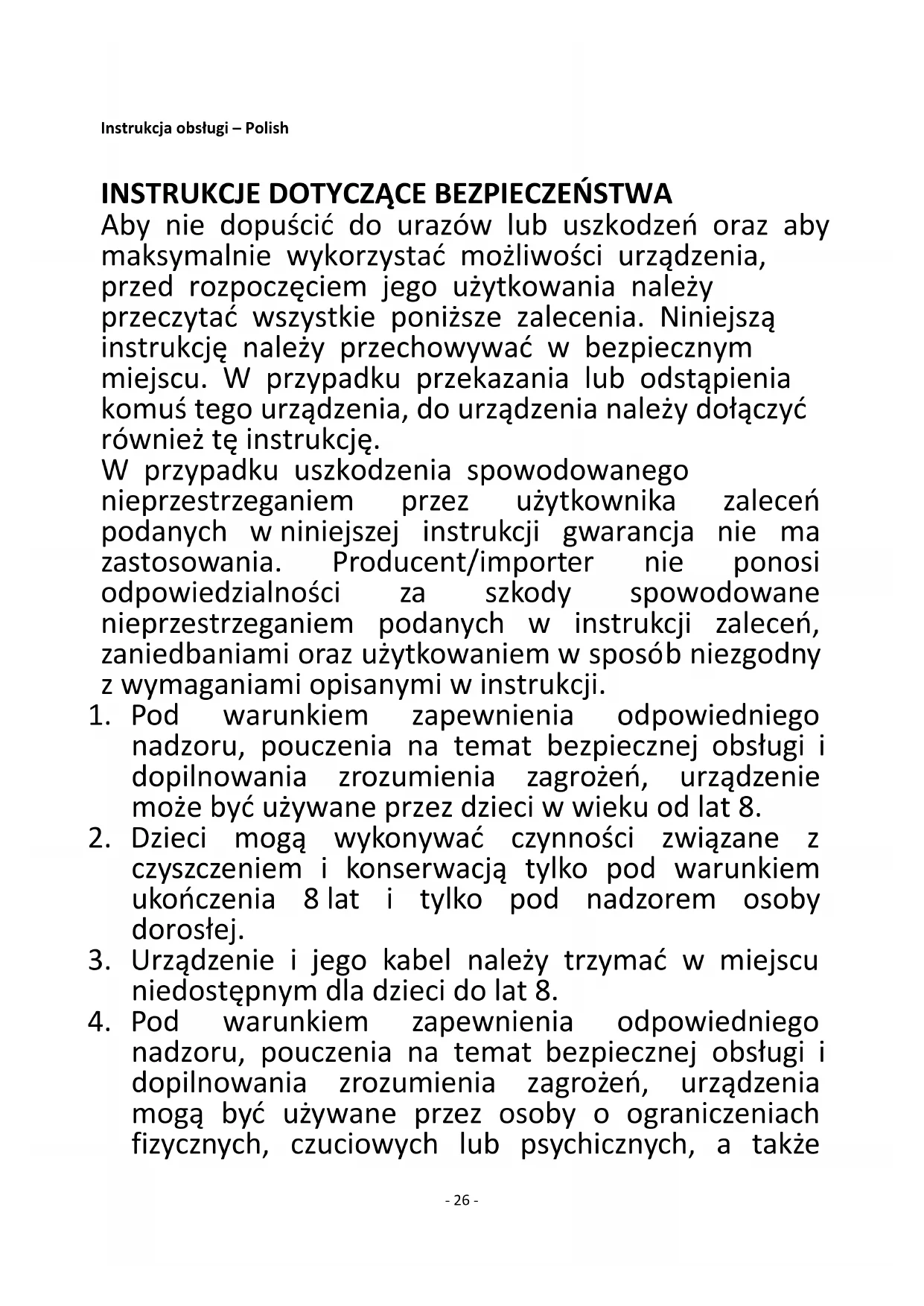 Aby nie dopuścić do urazów lub uszkodzeń oraz aby maksymalnie wykorzystać możliwości urządzenia, przed rozpoczęciem jego użytkowania należy przeczytać wszystkie poniższe zalecenia. Niniejszą instrukcję należy przechowywać w bezpiecznym miejscu. W przypadku przekazania lub odstąpienia komuś tego urządzenia, do urządzenia należy dołączyć również tę instrukcję. W przypadku uszkodzenia spowodowanego nieprzestrzeganiem przez użytkownika zaleceń podanych w niniejszej instrukcji gwarancja nie ma zastosowania. Producent/importer nie ponosi odpowiedzialności za szkody spowodowane nieprzestrzeganiem podanych w instrukcji zaleceń, zaniedbaniami oraz użytkowaniem w sposób niezgodny z wymaganiami opisanymi w instrukcji.