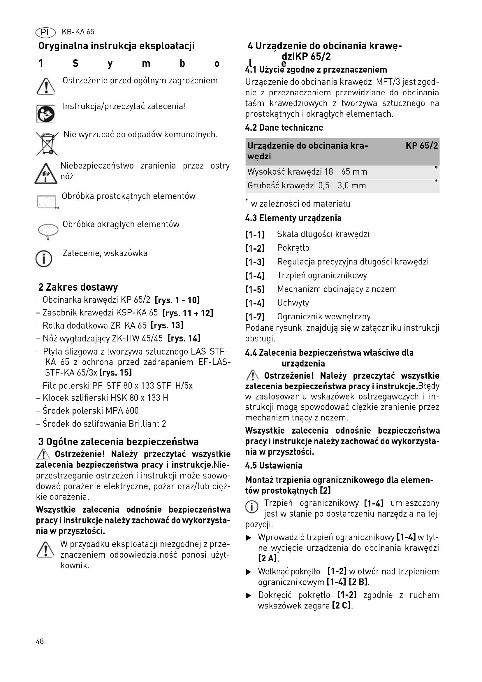 Oryginalna instrukcja eksploatacji 1Symbole 2 Zakres dostawy – Obcinarka krawędzi KP 65/2 [rys. 1 - 10] – Zasobnik krawędzi KSP-KA 65 [rys. 11 + 12] – Rolka dodatkowa ZR-KA 65 [rys. 13] – Nóż wygładzający ZK-HW 45/45 [rys. 14] – Płyta ślizgowa z tworzywa sztucznego LAS-STF- KA 65 z ochroną przed zadrapaniem EF-LAS- STF-KA 65/3x [rys. 15] – Filc polerski PF-STF 80 x 133 STF-H/5x – Klocek szlifierski HSK 80 x 133 H – Środek polerski MPA 600 – Środek do szlifowania Brilliant 2 3 Ogólne zalecenia bezpieczeństwa Ostrzeżenie! Należy przeczytać wszystkie zalecenia bezpieczeństwa pracy i instrukcje. Nie- przestrzeganie ostrzeżeń i instrukcji może spowo- dować porażenie elektryczne, pożar oraz/lub cięż- kie obrażenia. Wszystkie zalecenia odnośnie bezpieczeństwa pracy i instrukcje należy zachować do wykorzysta- nia w przyszłości. W przypadku eksploatacji niezgodnej z prze- znaczeniem odpowiedzialność ponosi użyt- kownik. 4 Urządzenie do obcinania krawę- dziKP 65/2