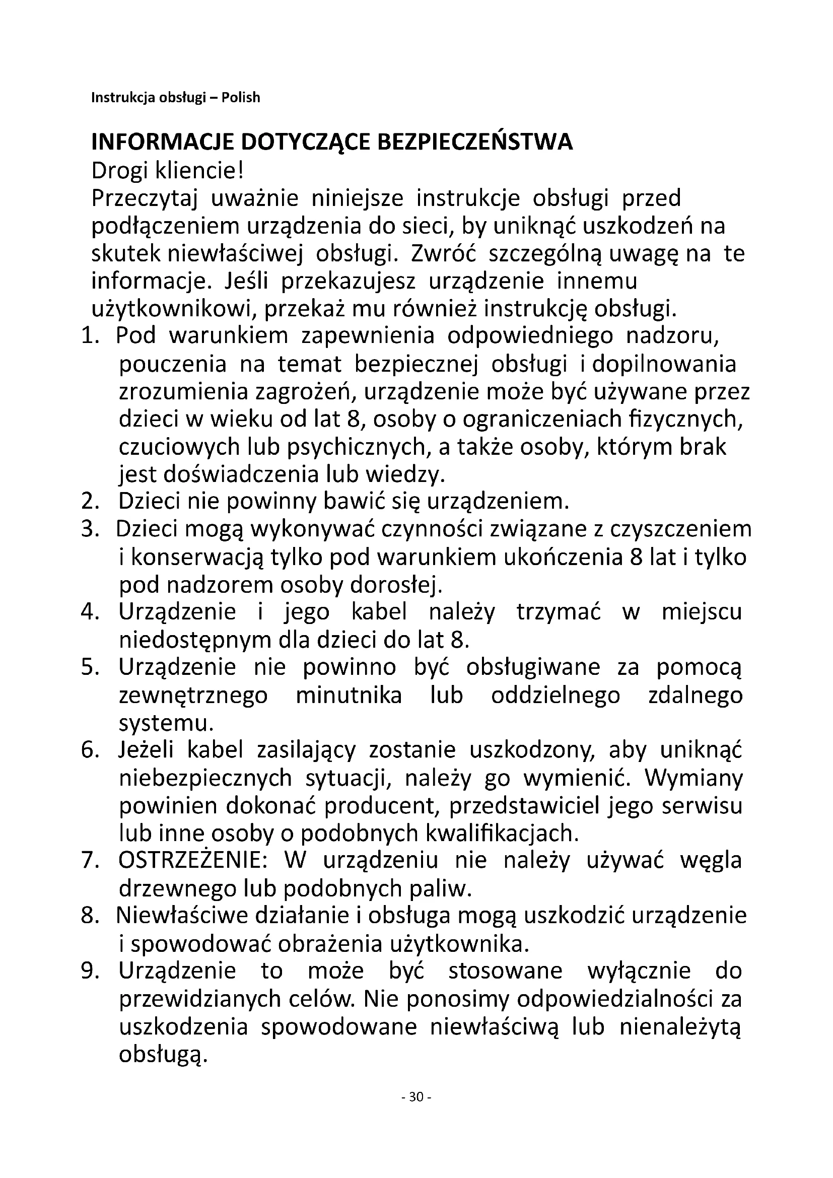 pouczenia na temat bezpiecznej obsługi i dopilnowania zrozumienia zagrożeń, urządzenie może być używane przez dzieci w wieku od lat 8, osoby o ograniczeniach fizycznych, czuciowych lub psychicznych, a także osoby, którym brak jest doświadczenia lub wiedzy.