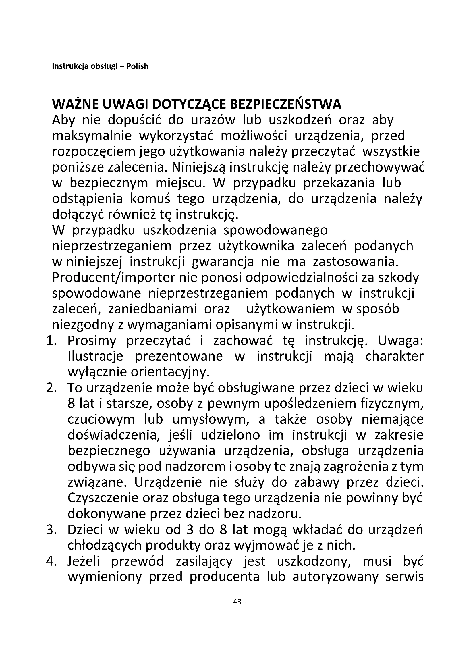 4. Jeżeli przewód zasilający jest uszkodzony, musi być