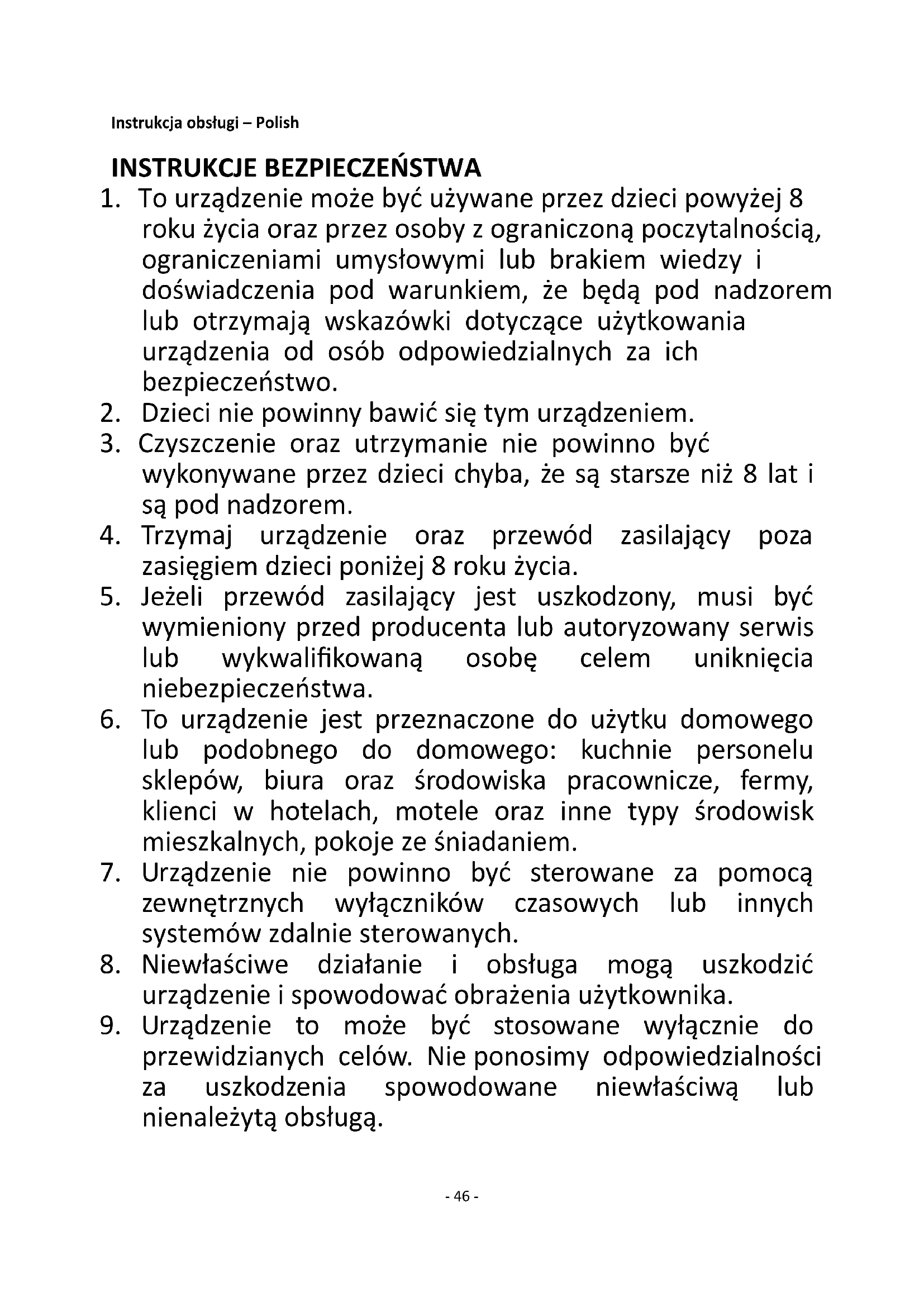 9. Urządzenie to może być stosowane wyłącznie do