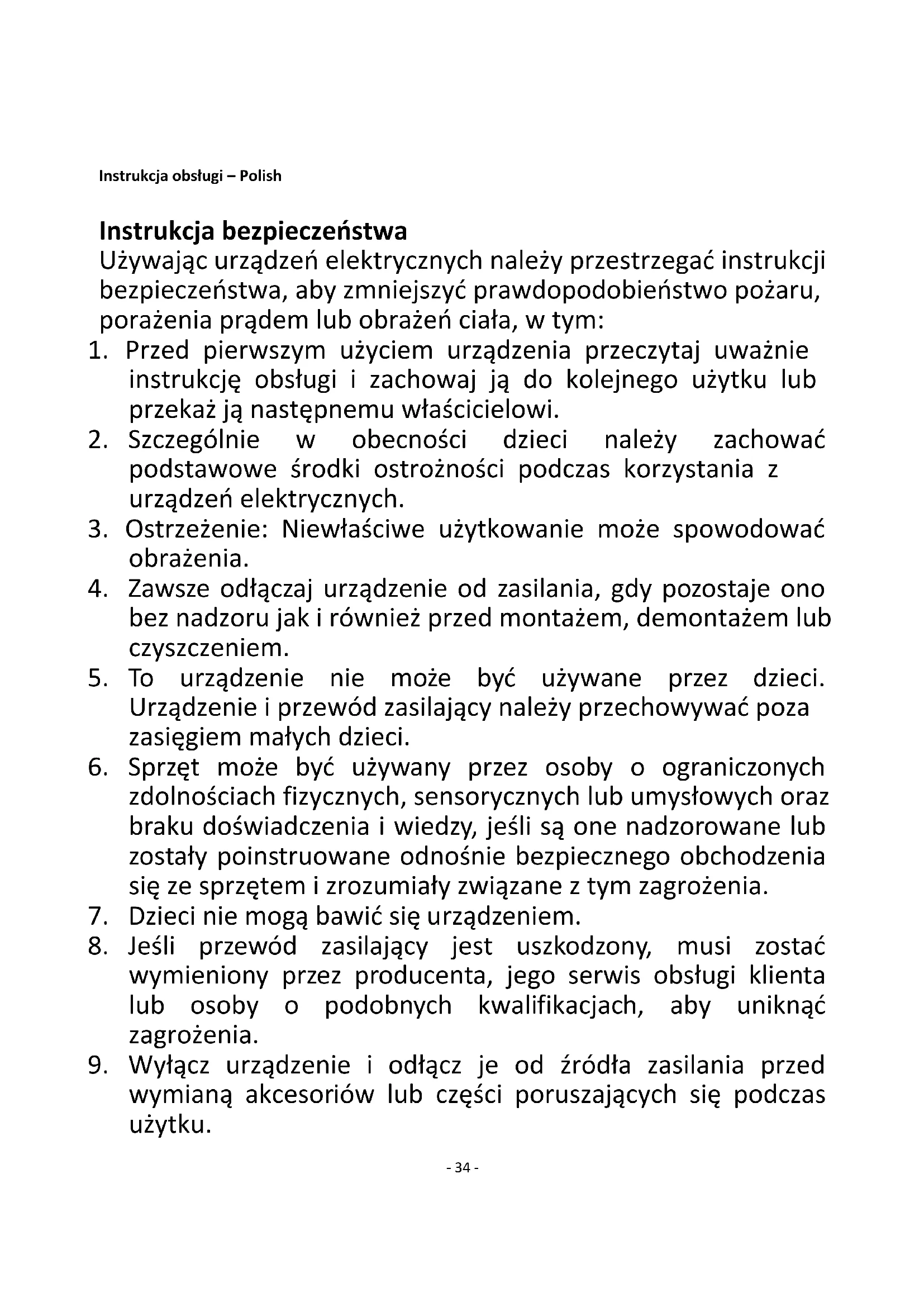8. Jeśli przewód zasilający jest uszkodzony, musi zostać