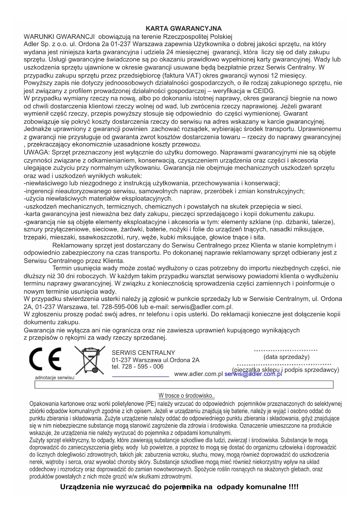 6. Накрийте пристрій поліетиленовим пакетом, щоб захистити від пилу, і згорніть шнур живлення. Зберігання в сухому місці, захищеному від прямих сонячних променів. ТЕХНІЧНІ ДАНІ: Харчування 220-240В ~50 Гц Потужність: 70 Вт Максимальна потужність: 320 Вт Ємність бака: 3,5 л Витрата води: 400 мл/год Акумулятор: CR2025 (3 В) Рівень шуму: 60 дБ Об'єм повітряного потоку: 5м3/год Розміри виробу: 28,5 х 22,0 х 82,5 см Vi sköter om miljön. Överlämna förpackningar i kartong till pappersavfall. Polyetylensäckar (PE) slängs i avfallsbehållare för plast. Man bör lämna en gammal apparat till en riktig återvinningscentral, eftersom farliga komponenter i apparaten kan orsaka fara till miljön. En elektrisk apparat bör lämnas för att minska förnyad användning av denna. Om apparaten innehåller batterier, bör man ta bort dem och lämna dem separat till återvinningscentraler.71 KARTA GWARANCYJNA WARUNKI GWARANCJI obowiązują na terenie Rzeczpospolitej Polskiej Adler Sp. z o.o. ul. Ordona 2a 01-237 Warszawa zapewnia Użytkownika o dobrej jakości sprzętu, na który wydana jest niniejsza karta gwarancyjna i udziela 24 miesięcznej gwarancji, która liczy się od daty zakupu sprzętu. Usługi gwarancyjne świadczone są po okazaniu prawidłowo wypełnionej karty gwarancyjnej. Wady lub uszkodzenia sprzętu ujawnione w okresie gwarancji usuwane będą bezpłatnie przez Serwis Centralny. W przypadku zakupu sprzętu przez przedsiębiorcę (faktura VAT) okres gwarancji wynosi 12 miesięcy. Powyższy zapis nie dotyczy jednoosobowych działalności gospodarczych, o ile rodzaj zakupionego sprzętu, nie jest związany z profilem prowadzonej działalności gospodarczej – weryfikacja w CEIDG. W przypadku wymiany rzeczy na nową, albo po dokonaniu istotnej naprawy, okres gwarancji biegnie na nowo od chwili dostarczenia klientowi rzeczy wolnej od wad, lub zwrócenia rzeczy naprawionej. Jeżeli gwarant wymienił część rzeczy, przepis powyższy stosuje się odpowiednio do części wymienionej. Gwarant zobowiązuje się pokryć koszty dostarczenia rzeczy do serwisu na adres wskazany w karcie gwarancyjnej. Jednakże uprawniony z gwarancji powinien zachować rozsądek, wybierając środek transportu. Uprawnionemu z gwarancji nie przysługuje od gwaranta zwrot kosztów dostarczenia towaru – rzeczy do naprawy gwarancyjnej , przekraczający ekonomicznie uzasadnione koszty przewozu. UWAGA: Sprzęt przeznaczony jest wyłącznie do użytku domowego. Naprawami gwarancyjnymi nie są objęte czynności związane z odkamienianiem, konserwacją, czyszczeniem urządzenia oraz części i akcesoria ulegające zużyciu przy normalnym użytkowaniu. Gwarancja nie obejmuje mechanicznych uszkodzeń sprzętu oraz wad i uszkodzeń wynikłych wskutek: -niewłaściwego lub niezgodnego z instrukcją użytkowania, przechowywania i konserwacji; -ingerencji nieautoryzowanego serwisu, samowolnych napraw, przeróbek i zmian konstrukcyjnych; -użycia niewłaściwych materiałów eksploatacyjnych. -uszkodzeń mechanicznych, termicznych, chemicznych i powstałych na skutek przepięcia w sieci. -karta gwarancyjna jest nieważna bez daty zakupu, pieczęci sprzedającego i kopii dokumentu zakupu. -gwarancją nie są objęte elementy eksploatacyjne i akcesoria w tym: elementy szklane (np. dzbanki, talerze), sznury przyłączeniowe, sieciowe, żarówki, baterie, nożyki i folie do urządzeń tnących, nasadki miksujące, trzepaki, mieszaki, ssawkoszczotki, rury, węże, kubki miksujące, głowice tnące i sita. Reklamowany sprzęt jest dostarczany do Serwisu Centralnego przez Klienta w stanie kompletnym i odpowiednio zabezpieczony na czas transportu. Po dokonanej naprawie reklamowany sprzęt odbierany jest z Serwisu Centralnego przez Klienta. Termin usunięcia wady może zostać wydłużony o czas potrzebny do importu niezbędnych części, nie dłuższy niż 30 dni roboczych. W każdym takim przypadku warsztat serwisowy powiadomi klienta o wydłużeniu terminu naprawy gwarancyjnej. W związku z koniecznością sprowadzenia części zamiennych i poinformuje o nowym terminie usunięcia wady. W przypadku stwierdzenia usterki należy ją zgłosić w punkcie sprzedaży lub w Serwisie Centralnym, ul. Ordona 2A, 01-237 Warszawa, tel. 728-595-006 lub e-mail: serwis@adler.com.pl. W zgłoszeniu proszę podać swój adres, nr telefonu i opis usterki. Do reklamacji konieczne jest dołączenie kopii dokumentu zakupu. Gwarancja nie wyłącza ani nie ogranicza oraz nie zawiesza uprawnień kupującego wynikających z przepisów o rękojmi za wady rzeczy sprzedanej. SERWIS CENTRALNY 01-237 Warszawa ul.Ordona 2A tel. 728 - 595 - 006 www.adler.com.pl serwis@adler.com.pl (data sprzedaży) (pieczątka sklepu i podpis sprzedawcy) adnotacje serwisu: Urządzenia nie wyrzucać do pojemnika na odpady komunalne !!!! W trosce o środowisko.. Opakowania kartonowe oraz worki polietylenowe (PE) należy wrzucać do odpowiednich pojemników przeznaczonych do selektywnej zbiórki odpadów komunalnych zgodnie z ich opisem. Jeżeli w urządzeniu znajdują się baterie, należy je wyjąć i osobno oddać do punktu zbierania i składowania. Zużyte urządzenie należy oddać do odpowiedniego punktu zbierania i składowania, gdyż znajdujące się w nim niebezpieczne substancje mogą stanowić zagrożenie dla zdrowia i środowiska. Oznaczenie umieszczone na produkcie wskazuje, że urządzenia nie należy wyrzucać do pojemnika z odpadami komunalnymi. Zużyty sprzęt elektryczny, to odpady, które zawierają substancje szkodliwe dla ludzi, zwierząt i środowiska. Substancje te mogą doprowadzić do zanieczyszczenia gleby, wody lub powietrze, a poprzez to mogą się dostać do organizmu czł
