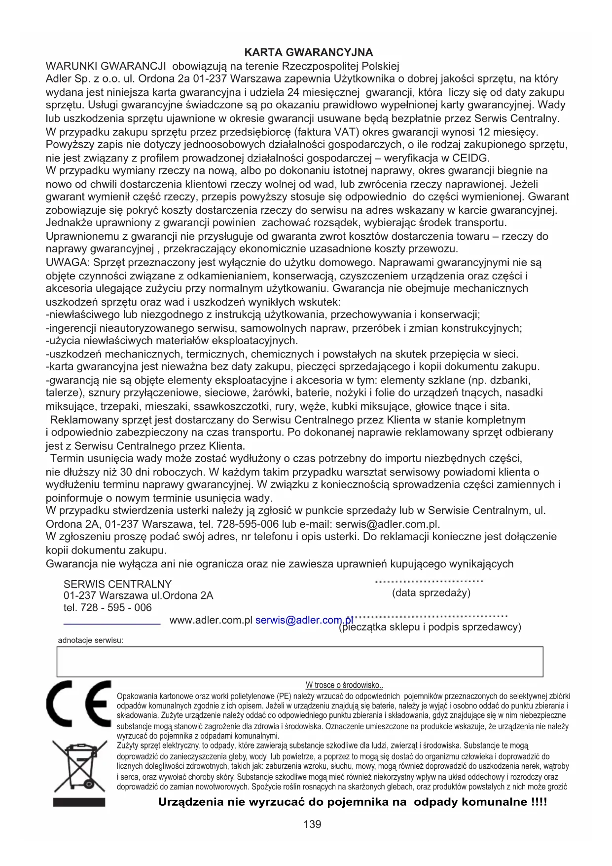 TECHNICKÉ DÁTA: Chladiaci výkon pri BTU: 9 000 BTU / hod Chladiaci výkon vo wattoch: 2 600 W Spotreba energie (chladenie) W: 950 W Hlasitosť: <= 64 dB Prietok vzduchu: 270 m3 / h Energetická trieda: A. Časovač: 24 hodín Hmotnosť chladiacej kvapaliny R290: max. 160 gramov Napätie 220-240 V ~ 50 Hz Starostlivosť o životné prostredie. Kartónový obal odovzdajte do zberných surovín. Polyetylénové vrecká (PE) vyhoďte do kontajnera na plast. Opotrebený spotrebič odovzdajte na príslušný zberný dvor, nebezpečné látky spotrebiča môžu predstavovať riziko pre životné prostredie. Elektrospotrebič odstráňte tak, aby nedochádzalo j jeho ďalšiemu použitiu. Ak sa v spotrebiči nachádzajú batérie, vyberte ich a odovzdajte ich na zberné miesto osobitne. Spotrebič nevyhadzujte do kontajnera na komunálny odpad! Pozor, nebezpečenstvo požiaru. NEPrepichujte ani nespaľujte. Majte na pamäti, že chladivo nemusí obsahovať zápach. Maximálne množstvo chladiva: 160 g.139 KARTA GWARANCYJNA WARUNKI GWARANCJI obowiązują na terenie Rzeczpospolitej Polskiej Adler Sp. z o.o. ul. Ordona 2a 01-237 Warszawa zapewnia Użytkownika o dobrej jakości sprzętu, na który wydana jest niniejsza karta gwarancyjna i udziela 24 miesięcznej gwarancji, która liczy się od daty zakupu sprzętu. Usługi gwarancyjne świadczone są po okazaniu prawidłowo wypełnionej karty gwarancyjnej. Wady lub uszkodzenia sprzętu ujawnione w okresie gwarancji usuwane będą bezpłatnie przez Serwis Centralny. W przypadku zakupu sprzętu przez przedsiębiorcę (faktura VAT) okres gwarancji wynosi 12 miesięcy. Powyższy zapis nie dotyczy jednoosobowych działalności gospodarczych, o ile rodzaj zakupionego sprzętu, nie jest związany z profilem prowadzonej działalności gospodarczej – weryfikacja w CEIDG. W przypadku wymiany rzeczy na nową, albo po dokonaniu istotnej naprawy, okres gwarancji biegnie na nowo od chwili dostarczenia klientowi rzeczy wolnej od wad, lub zwrócenia rzeczy naprawionej. Jeżeli gwarant wymienił część rzeczy, przepis powyższy stosuje się odpowiednio do części wymienionej. Gwarant zobowiązuje się pokryć koszty dostarczenia rzeczy do serwisu na adres wskazany w karcie gwarancyjnej. Jednakże uprawniony z gwarancji powinien zachować rozsądek, wybierając środek transportu. Uprawnionemu z gwarancji nie przysługuje od gwaranta zwrot kosztów dostarczenia towaru – rzeczy do naprawy gwarancyjnej , przekraczający ekonomicznie uzasadnione koszty przewozu. UWAGA: Sprzęt przeznaczony jest wyłącznie do użytku domowego. Naprawami gwarancyjnymi nie są objęte czynności związane z odkamienianiem, konserwacją, czyszczeniem urządzenia oraz części i akcesoria ulegające zużyciu przy normalnym użytkowaniu. Gwarancja nie obejmuje mechanicznych uszkodzeń sprzętu oraz wad i uszkodzeń wynikłych wskutek: -niewłaściwego lub niezgodnego z instrukcją użytkowania, przechowywania i konserwacji; -ingerencji nieautoryzowanego serwisu, samowolnych napraw, przeróbek i zmian konstrukcyjnych; -użycia niewłaściwych materiałów eksploatacyjnych. -uszkodzeń mechanicznych, termicznych, chemicznych i powstałych na skutek przepięcia w sieci. -karta gwarancyjna jest nieważna bez daty zakupu, pieczęci sprzedającego i kopii dokumentu zakupu. -gwarancją nie są objęte elementy eksploatacyjne i akcesoria w tym: elementy szklane (np. dzbanki, talerze), sznury przyłączeniowe, sieciowe, żarówki, baterie, nożyki i folie do urządzeń tnących, nasadki miksujące, trzepaki, mieszaki, ssawkoszczotki, rury, węże, kubki miksujące, głowice tnące i sita. Reklamowany sprzęt jest dostarczany do Serwisu Centralnego przez Klienta w stanie kompletnym i odpowiednio zabezpieczony na czas transportu. Po dokonanej naprawie reklamowany sprzęt odbierany jest z Serwisu Centralnego przez Klienta. Termin usunięcia wady może zostać wydłużony o czas potrzebny do importu niezbędnych części, nie dłuższy niż 30 dni roboczych. W każdym takim przypadku warsztat serwisowy powiadomi klienta o wydłużeniu terminu naprawy gwarancyjnej. W związku z koniecznością sprowadzenia części zamiennych i poinformuje o nowym terminie usunięcia wady. W przypadku stwierdzenia usterki należy ją zgłosić w punkcie sprzedaży lub w Serwisie Centralnym, ul. Ordona 2A, 01-237 Warszawa, tel. 728-595-006 lub e-mail: serwis@adler.com.pl. W zgłoszeniu proszę podać swój adres, nr telefonu i opis usterki. Do reklamacji konieczne jest dołączenie kopii dokumentu zakupu. Gwarancja nie wyłącza ani nie ogranicza oraz nie zawiesza uprawnień kupującego wynikających SERWIS CENTRALNY 01-237 Warszawa ul.Ordona 2A tel. 728 - 595 - 006 www.adler.com.pl serwis@adler.com.pl (data sprzedaży) (pieczątka sklepu i podpis sprzedawcy) adnotacje serwisu: Urządzenia nie wyrzucać do pojemnika na odpady komunalne !!!! W trosce o środowisko.. Opakowania kartonowe oraz worki polietylenowe (PE) należy wrzucać do odpowiednich pojemników przeznaczonych do selektywnej zbiórki odpadów komunalnych zgodnie z ich opisem. Jeżeli w urządzeniu znajdują się baterie, należy je wyjąć i osobno oddać do punktu zbierania i składowania. Zużyte urządzenie należy oddać do odpowiedniego punktu zbierania i składowania, gdyż znajdujące się w nim niebezpieczne substancje mogą stanowić zagrożenie dla zdrowia i środowiska. Oznaczenie umieszczone na produkcie wskazuje, że urządzenia nie należy wyrzucać do pojemnika z odpadami komunalnymi. Zużyty sprzęt elektryczny, to odpady, które zawierają substancje szkodliwe dla ludzi, zwierząt i środowiska. Substancje te mogą doprowadzić do zanieczyszczenia gleby, wody lub powietrze, a poprzez to mogą się dostać do organizmu człowieka i doprowadzić do licznych dolegliwości zdrowotnych, takich jak: zaburzenia wzroku, słuchu, mowy, mogą również doprowadzić do uszkodzenia nerek, wątroby i serca, oraz wywołać choroby skóry. Substan