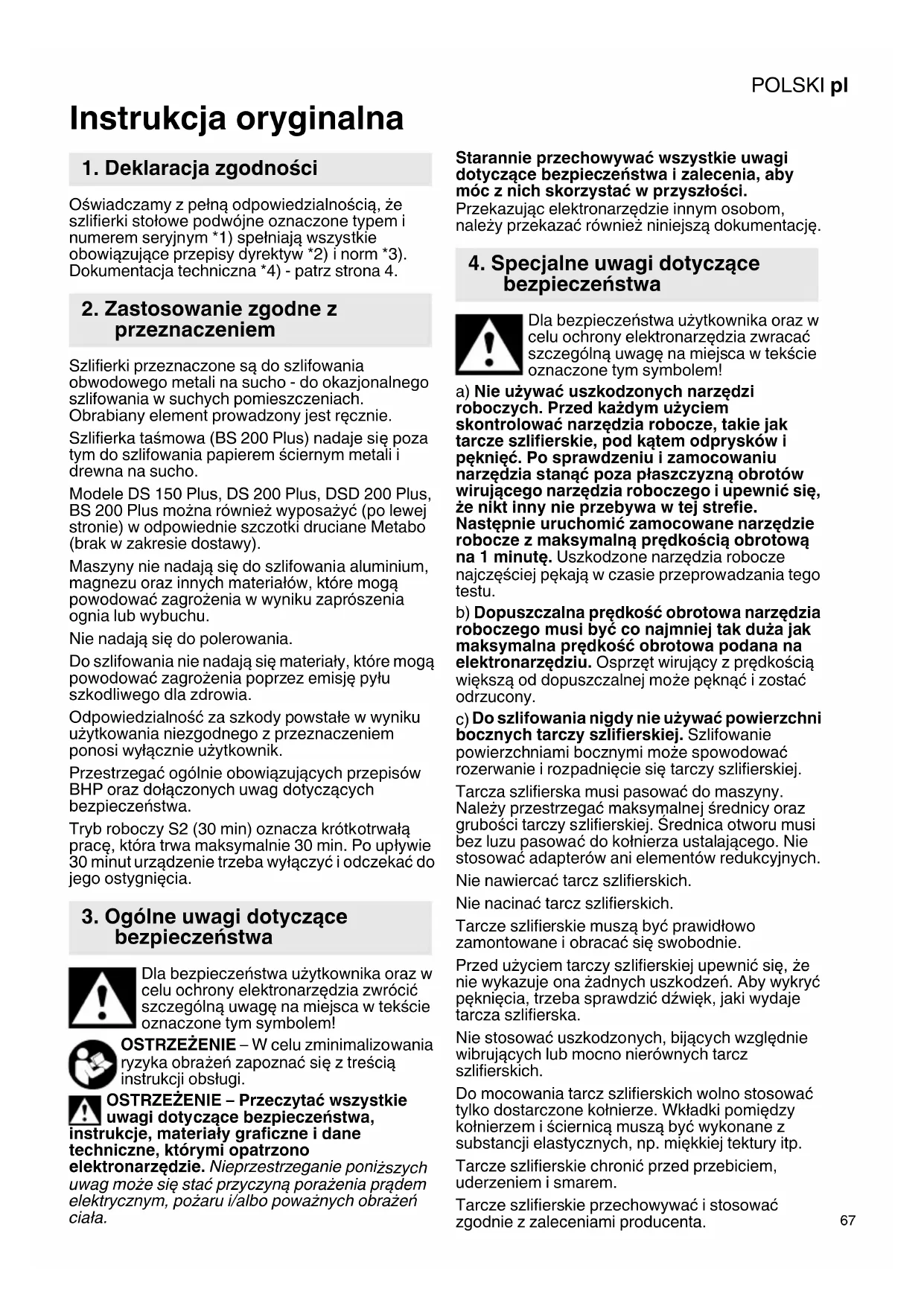 Instrukcja oryginalna Oświadczamy z pełną odpowiedzialnością, że szlifierki stołowe podwójne oznaczone typem i numerem seryjnym *1) spełniają wszystkie obowiązujące przepisy dyrektyw *2) i norm *3). Dokumentacja techniczna *4) - patrz strona 4. Szlifierki przeznaczone są do szlifowania obwodowego metali na sucho - do okazjonalnego szlifowania w suchych pomieszczeniach. Obrabiany element prowadzony jest ręcznie. Szlifierka taśmowa (BS 200 Plus) nadaje się poza tym do szlifowania papierem ściernym metali i drewna na sucho. Modele DS 150 Plus, DS 200 Plus, DSD 200 Plus, BS 200 Plus można również wyposażyć (po lewej stronie) w odpowiednie szczotki druciane Metabo (brak w zakresie dostawy). Maszyny nie nadają się do szlifowania aluminium, magnezu oraz innych materiałów, które mogą powodować zagrożenia w wyniku zaprószenia ognia lub wybuchu. Nie nadają się do polerowania. Do szlifowania nie nadają się materiały, które mogą powodować zagrożenia poprzez emisję pyłu szkodliwego dla zdrowia. Odpowiedzialność za szkody powstałe w wyniku użytkowania niezgodnego z przeznaczeniem ponosi wyłącznie użytkownik. Przestrzegać ogólnie obowiązujących przepisów BHP oraz dołączonych uwag dotyczących bezpieczeństwa. Tryb roboczy S2 (30 min) oznacza krótkotrwałą pracę, która trwa maksymalnie 30 min. Po upływie 30 minut urządzenie trzeba wyłączyć i odczekać do jego ostygnięcia. Dla bezpieczeństwa użytkownika oraz w celu ochrony elektronarzędzia zwrócić szczególną uwagę na miejsca w tekście oznaczone tym symbolem! OSTRZEŻENIE – W celu zminimalizowania ryzyka obrażeń zapoznać się z treścią instrukcji obsługi. OSTRZEŻENIE – Przeczytać wszystkie uwagi dotyczące bezpieczeństwa, instrukcje, materiały graficzne i dane techniczne, którymi opatrzono elektronarzędzie. Nieprzestrzeganie poni ższych uwag może się stać przyczyną porażenia prądem elektrycznym, pożaru i/albo poważnych obrażeń ciała. Starannie przechowywać wszystkie uwagi dotyczące bezpieczeństwa i zalecenia, aby móc z nich skorzystać w przyszłości. Przekazując elektronarzędzie innym osobom, należy przekazać również niniejszą dokumentację. Dla bezpieczeństwa użytkownika oraz w celu ochrony elektronarzędzia zwracać szczególną uwagę na miejsca w tekście oznaczone tym symbolem! a) Nie używać uszkodzonych narzędzi roboczych. Przed każdym użyciem skontrolować narzędzia robocze, takie jak tarcze szlifierskie, pod kątem odprysków i pękni ęć. Po sprawdzeniu i zamocowaniu narzędzia stanąć poza płaszczyzną obrotów wirującego narzędzia roboczego i upewnić się, że nikt inny nie przebywa w tej strefie. Następnie uruchomić zamocowane narzędzie robocze z maksymalną prędkością obrotową na 1 minutę. Uszkodzone narzędzia robocze najczęściej pękają w czasie przeprowadzania tego testu. b) Dopuszczalna prędkość obrotowa narzędzia roboczego musi być co najmniej tak duża jak maksymalna prędkość obrotowa podana na elektronarzędziu. Osprzęt wirujący z prędkością większą od dopuszczalnej może pęknąć i zostać odrzucony.