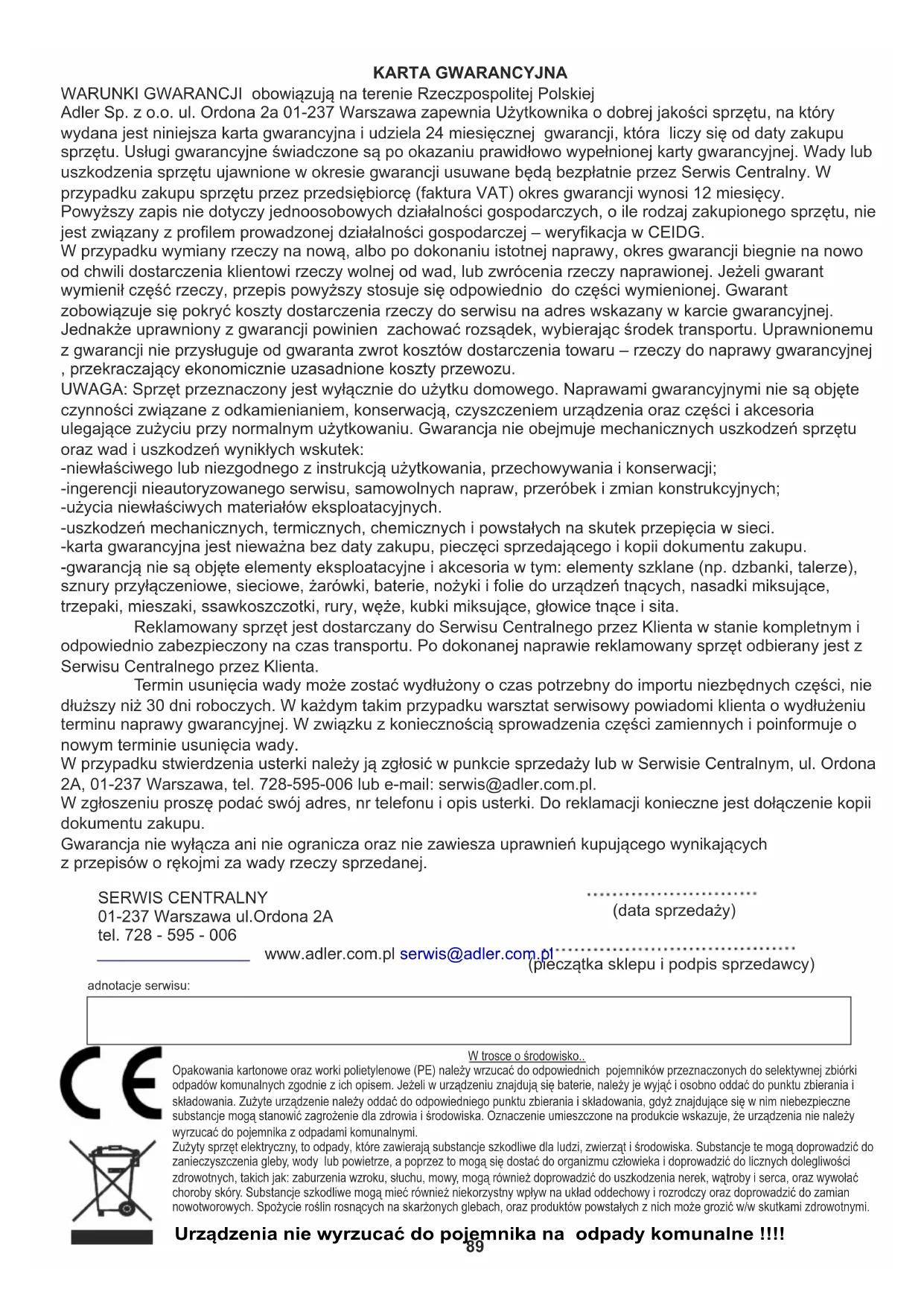 ТЕХНІЧНІ ДАНІ: Живлення 220-240 В ~ 50-60 Гц Потужність: 80 Вт Максимальна потужність: 350 Вт Ємність бака: 2 літри Витрата води: 230 мл / год Акумулятор: CR2025 (3V) Рівень шуму: 59,4 дБ Об'єм повітряного потоку: 188,4 м3/год Розміри виробу: 18,6 x 25,5 x 62,5 см Vi sköter om miljön. Överlämna förpackningar i kartong till pappersavfall. Polyetylensäckar (PE) slängs i avfallsbehållare för plast. Man bör lämna en gammal apparat till en riktig återvinningscentral, eftersom farliga komponenter i apparaten kan orsaka fara till miljön. En elektrisk apparat bör lämnas för att minska förnyad användning av denna. Om apparaten innehåller batterier, bör man ta bort dem och lämna dem separat till återvinningscentraler.89 KARTA GWARANCYJNA WARUNKI GWARANCJI obowiązują na terenie Rzeczpospolitej Polskiej Adler Sp. z o.o. ul. Ordona 2a 01-237 Warszawa zapewnia Użytkownika o dobrej jakości sprzętu, na który wydana jest niniejsza karta gwarancyjna i udziela 24 miesięcznej gwarancji, która liczy się od daty zakupu sprzętu. Usługi gwarancyjne świadczone są po okazaniu prawidłowo wypełnionej karty gwarancyjnej. Wady lub uszkodzenia sprzętu ujawnione w okresie gwarancji usuwane będą bezpłatnie przez Serwis Centralny. W przypadku zakupu sprzętu przez przedsiębiorcę (faktura VAT) okres gwarancji wynosi 12 miesięcy. Powyższy zapis nie dotyczy jednoosobowych działalności gospodarczych, o ile rodzaj zakupionego sprzętu, nie jest związany z profilem prowadzonej działalności gospodarczej – weryfikacja w CEIDG. W przypadku wymiany rzeczy na nową, albo po dokonaniu istotnej naprawy, okres gwarancji biegnie na nowo od chwili dostarczenia klientowi rzeczy wolnej od wad, lub zwrócenia rzeczy naprawionej. Jeżeli gwarant wymienił część rzeczy, przepis powyższy stosuje się odpowiednio do części wymienionej. Gwarant zobowiązuje się pokryć koszty dostarczenia rzeczy do serwisu na adres wskazany w karcie gwarancyjnej. Jednakże uprawniony z gwarancji powinien zachować rozsądek, wybierając środek transportu. Uprawnionemu z gwarancji nie przysługuje od gwaranta zwrot kosztów dostarczenia towaru – rzeczy do naprawy gwarancyjnej , przekraczający ekonomicznie uzasadnione koszty przewozu. UWAGA: Sprzęt przeznaczony jest wyłącznie do użytku domowego. Naprawami gwarancyjnymi nie są objęte czynności związane z odkamienianiem, konserwacją, czyszczeniem urządzenia oraz części i akcesoria ulegające zużyciu przy normalnym użytkowaniu. Gwarancja nie obejmuje mechanicznych uszkodzeń sprzętu oraz wad i uszkodzeń wynikłych wskutek: -niewłaściwego lub niezgodnego z instrukcją użytkowania, przechowywania i konserwacji; -ingerencji nieautoryzowanego serwisu, samowolnych napraw, przeróbek i zmian konstrukcyjnych; -użycia niewłaściwych materiałów eksploatacyjnych. -uszkodzeń mechanicznych, termicznych, chemicznych i powstałych na skutek przepięcia w sieci. -karta gwarancyjna jest nieważna bez daty zakupu, pieczęci sprzedającego i kopii dokumentu zakupu. -gwarancją nie są objęte elementy eksploatacyjne i akcesoria w tym: elementy szklane (np. dzbanki, talerze), sznury przyłączeniowe, sieciowe, żarówki, baterie, nożyki i folie do urządzeń tnących, nasadki miksujące, trzepaki, mieszaki, ssawkoszczotki, rury, węże, kubki miksujące, głowice tnące i sita. Reklamowany sprzęt jest dostarczany do Serwisu Centralnego przez Klienta w stanie kompletnym i odpowiednio zabezpieczony na czas transportu. Po dokonanej naprawie reklamowany sprzęt odbierany jest z Serwisu Centralnego przez Klienta. Termin usunięcia wady może zostać wydłużony o czas potrzebny do importu niezbędnych części, nie dłuższy niż 30 dni roboczych. W każdym takim przypadku warsztat serwisowy powiadomi klienta o wydłużeniu terminu naprawy gwarancyjnej. W związku z koniecznością sprowadzenia części zamiennych i poinformuje o nowym terminie usunięcia wady. W przypadku stwierdzenia usterki należy ją zgłosić w punkcie sprzedaży lub w Serwisie Centralnym, ul. Ordona 2A, 01-237 Warszawa, tel. 728-595-006 lub e-mail: serwis@adler.com.pl. W zgłoszeniu proszę podać swój adres, nr telefonu i opis usterki. Do reklamacji konieczne jest dołączenie kopii dokumentu zakupu. Gwarancja nie wyłącza ani nie ogranicza oraz nie zawiesza uprawnień kupującego wynikających z przepisów o rękojmi za wady rzeczy sprzedanej. SERWIS CENTRALNY 01-237 Warszawa ul.Ordona 2A tel. 728 - 595 - 006 www.adler.com.pl serwis@adler.com.pl (data sprzedaży) (pieczątka sklepu i podpis sprzedawcy) adnotacje serwisu: Urządzenia nie wyrzucać do pojemnika na odpady komunalne !!!! W trosce o środowisko.. Opakowania kartonowe oraz worki polietylenowe (PE) należy wrzucać do odpowiednich pojemników przeznaczonych do selektywnej zbiórki odpadów komunalnych zgodnie z ich opisem. Jeżeli w urządzeniu znajdują się baterie, należy je wyjąć i osobno oddać do punktu zbierania i składowania. Zużyte urządzenie należy oddać do odpowiedniego punktu zbierania i składowania, gdyż znajdujące się w nim niebezpieczne substancje mogą stanowić zagrożenie dla zdrowia i środowiska. Oznaczenie umieszczone na produkcie wskazuje, że urządzenia nie należy wyrzucać do pojemnika z odpadami komunalnymi. Zużyty sprzęt elektryczny, to odpady, które zawierają substancje szkodliwe dla ludzi, zwierząt i środowiska. Substancje te mogą doprowadzić do zanieczyszczenia gleby, wody lub powietrze, a poprzez to mogą się dostać do organizmu człowieka i doprowadzić do licznych dolegliwości zdrowotnych, takich jak: zaburzenia wzroku, słuchu, mowy, mogą również doprowadzić do uszkodzenia nerek, wątroby i serca, oraz wywołać choroby skóry. Substancje szkodliwe mogą mieć również niekorzystny wpływ na układ oddec