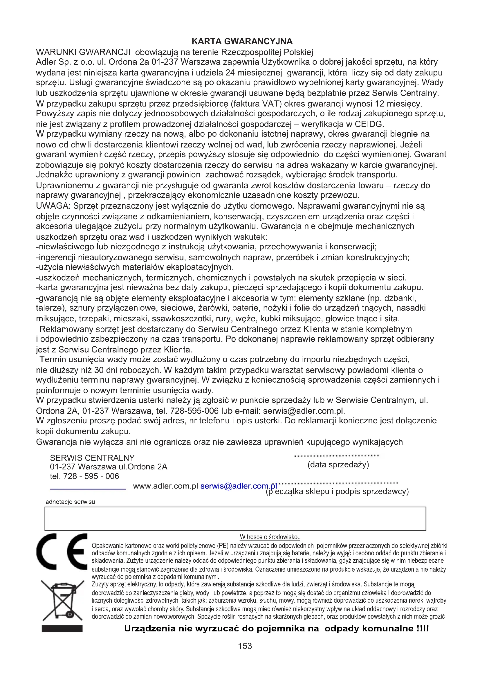 TECHNICKÉ DÁTA: Chladiaci výkon pri BTU: 7 000 BTU / hod Chladiaci výkon vo wattoch: 2000 Spotreba energie (chladenie) W: 750 W Objem: <= 65 dB Prietok vzduchu: 250 m3 / h Energetická trieda: A. Časovač: 24 hodín Hmotnosť chladiacej kvapaliny R290: max. 135 gramov153 KARTA GWARANCYJNA WARUNKI GWARANCJI obowiązują na terenie Rzeczpospolitej Polskiej Adler Sp. z o.o. ul. Ordona 2a 01-237 Warszawa zapewnia Użytkownika o dobrej jakości sprzętu, na który wydana jest niniejsza karta gwarancyjna i udziela 24 miesięcznej gwarancji, która liczy się od daty zakupu sprzętu. Usługi gwarancyjne świadczone są po okazaniu prawidłowo wypełnionej karty gwarancyjnej. Wady lub uszkodzenia sprzętu ujawnione w okresie gwarancji usuwane będą bezpłatnie przez Serwis Centralny. W przypadku zakupu sprzętu przez przedsiębiorcę (faktura VAT) okres gwarancji wynosi 12 miesięcy. Powyższy zapis nie dotyczy jednoosobowych działalności gospodarczych, o ile rodzaj zakupionego sprzętu, nie jest związany z profilem prowadzonej działalności gospodarczej – weryfikacja w CEIDG. W przypadku wymiany rzeczy na nową, albo po dokonaniu istotnej naprawy, okres gwarancji biegnie na nowo od chwili dostarczenia klientowi rzeczy wolnej od wad, lub zwrócenia rzeczy naprawionej. Jeżeli gwarant wymienił część rzeczy, przepis powyższy stosuje się odpowiednio do części wymienionej. Gwarant zobowiązuje się pokryć koszty dostarczenia rzeczy do serwisu na adres wskazany w karcie gwarancyjnej. Jednakże uprawniony z gwarancji powinien zachować rozsądek, wybierając środek transportu. Uprawnionemu z gwarancji nie przysługuje od gwaranta zwrot kosztów dostarczenia towaru – rzeczy do naprawy gwarancyjnej , przekraczający ekonomicznie uzasadnione koszty przewozu. UWAGA: Sprzęt przeznaczony jest wyłącznie do użytku domowego. Naprawami gwarancyjnymi nie są objęte czynności związane z odkamienianiem, konserwacją, czyszczeniem urządzenia oraz części i akcesoria ulegające zużyciu przy normalnym użytkowaniu. Gwarancja nie obejmuje mechanicznych uszkodzeń sprzętu oraz wad i uszkodzeń wynikłych wskutek: -niewłaściwego lub niezgodnego z instrukcją użytkowania, przechowywania i konserwacji; -ingerencji nieautoryzowanego serwisu, samowolnych napraw, przeróbek i zmian konstrukcyjnych; -użycia niewłaściwych materiałów eksploatacyjnych. -uszkodzeń mechanicznych, termicznych, chemicznych i powstałych na skutek przepięcia w sieci. -karta gwarancyjna jest nieważna bez daty zakupu, pieczęci sprzedającego i kopii dokumentu zakupu. -gwarancją nie są objęte elementy eksploatacyjne i akcesoria w tym: elementy szklane (np. dzbanki, talerze), sznury przyłączeniowe, sieciowe, żarówki, baterie, nożyki i folie do urządzeń tnących, nasadki miksujące, trzepaki, mieszaki, ssawkoszczotki, rury, węże, kubki miksujące, głowice tnące i sita. Reklamowany sprzęt jest dostarczany do Serwisu Centralnego przez Klienta w stanie kompletnym i odpowiednio zabezpieczony na czas transportu. Po dokonanej naprawie reklamowany sprzęt odbierany jest z Serwisu Centralnego przez Klienta. Termin usunięcia wady może zostać wydłużony o czas potrzebny do importu niezbędnych części, nie dłuższy niż 30 dni roboczych. W każdym takim przypadku warsztat serwisowy powiadomi klienta o wydłużeniu terminu naprawy gwarancyjnej. W związku z koniecznością sprowadzenia części zamiennych i poinformuje o nowym terminie usunięcia wady. W przypadku stwierdzenia usterki należy ją zgłosić w punkcie sprzedaży lub w Serwisie Centralnym, ul. Ordona 2A, 01-237 Warszawa, tel. 728-595-006 lub e-mail: serwis@adler.com.pl. W zgłoszeniu proszę podać swój adres, nr telefonu i opis usterki. Do reklamacji konieczne jest dołączenie kopii dokumentu zakupu. Gwarancja nie wyłącza ani nie ogranicza oraz nie zawiesza uprawnień kupującego wynikających SERWIS CENTRALNY 01-237 Warszawa ul.Ordona 2A tel. 728 - 595 - 006 www.adler.com.pl serwis@adler.com.pl (data sprzedaży) (pieczątka sklepu i podpis sprzedawcy) adnotacje serwisu: Urządzenia nie wyrzucać do pojemnika na odpady komunalne !!!! W trosce o środowisko.. Opakowania kartonowe oraz worki polietylenowe (PE) należy wrzucać do odpowiednich pojemników przeznaczonych do selektywnej zbiórki odpadów komunalnych zgodnie z ich opisem. Jeżeli w urządzeniu znajdują się baterie, należy je wyjąć i osobno oddać do punktu zbierania i składowania. Zużyte urządzenie należy oddać do odpowiedniego punktu zbierania i składowania, gdyż znajdujące się w nim niebezpieczne substancje mogą stanowić zagrożenie dla zdrowia i środowiska. Oznaczenie umieszczone na produkcie wskazuje, że urządzenia nie należy wyrzucać do pojemnika z odpadami komunalnymi. Zużyty sprzęt elektryczny, to odpady, które zawierają substancje szkodliwe dla ludzi, zwierząt i środowiska. Substancje te mogą doprowadzić do zanieczyszczenia gleby, wody lub powietrze, a poprzez to mogą się dostać do organizmu człowieka i doprowadzić do licznych dolegliwości zdrowotnych, takich jak: zaburzenia wzroku, słuchu, mowy, mogą również doprowadzić do uszkodzenia nerek, wątroby i serca, oraz wywołać choroby skóry. Substancje szkodliwe mogą mieć również niekorzystny wpływ na układ oddechowy i rozrodczy oraz doprowadzić do zamian nowotworowych. Spożycie roślin rosnących na skarżonych glebach, oraz produktów powstałych z nich może grozić154 POLSKI
