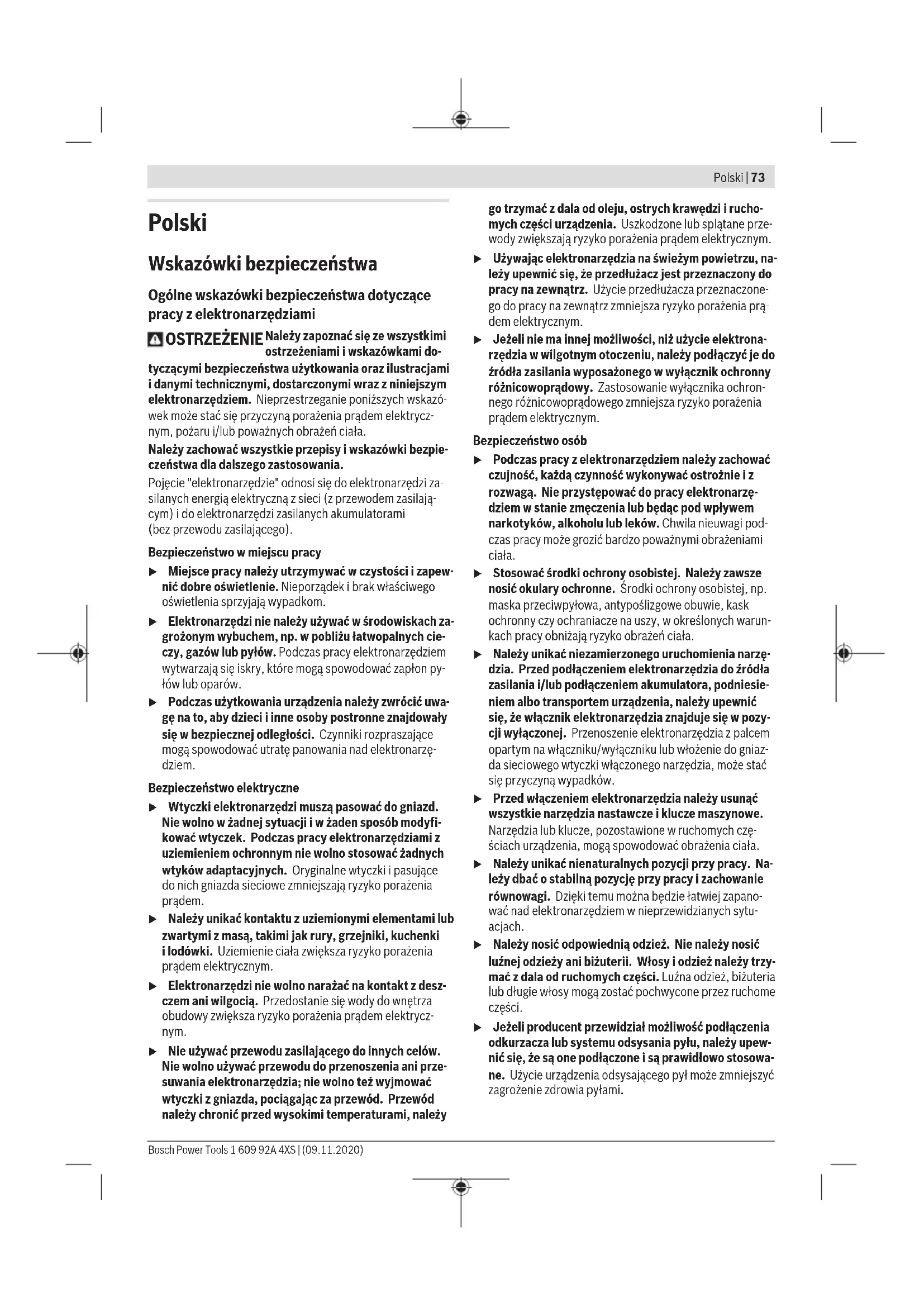 Karasoku Mahallesi 28028. Sokak No:20/A Merkez / ADANA Tel.: +903223599710 -3521379 Fax: +903223591323 E-mail: isiklar@isiklarelektrik.com Diğer servis adreslerini şurada bulabilirsiniz: www.bosch-pt.com/serviceaddresses Nakliye Alet içindeki lityum iyon (Li-Ionen) aküler tehlikeli madde taşıma yönetmeliği hükümlerine tabidir. Aküler başka bir yükümlülük olmaksızın kullanıcı tarafından caddeler üzerinde taşınabilir. Üçüncü kişiler eliyle yollanma durumunda (örneğin hava yolu ile veya nakliye şirketleri ile) paketleme ve etiketlemeye ilişkin özel hükümlere uyulmalıdır. Gönderi paketlenirken bir tehlikeli madde uzmanından yardım alınmalıdır. Aküleri sadece ve ancak gövdelerinde hasar yoksa gönderin. Açık kontakları kapatın ve aküyü ambalaj içinde hareket etmeyecek biçimde paketleyin. Lütfen olası ek ulusal yönetmelik hükümlerine de uyun. Tasfiye Elektrikli el aletleri, aküler, aksesuar ve ambalaj malzemesi çevre dostu tasfiye amacıyla bir geri dönüşüm merkezine yollanmalıdır. Elektrikli el aletlerini ve aküleri/bataryaları evsel çöplerin içine atmayın! Sadece AB ülkeleri için: 2012/19/EU yönetmeliği uyarınca kullanım ömrünü tamamlamış elektrikli el aletleri ve 2006/66/EC yönetmeliği uyarınca arızalı veya kullanım ömrünü tamamlamış aküler/ bataryalar ayrı ayrı toplanmak ve çevre dostu tasfiye için bir geri dönüşüm merkezine yollanmak zorundadır. Aküler/bataryalar: Lityum iyon: Lütfen nakliye bölümündeki talimata uyun (Bakınız „Nakliye“, Sayfa72). 1 609 92A 4XS | (09.11.2020) Bosch Power ToolsPolski | 73 Polski Wskazówki bezpieczeństwa Ogólne wskazówki bezpieczeństwa dotyczące pracy z elektronarzędziami OSTRZEŻENIE Należy zapoznać się ze wszystkimi ostrzeżeniami i wskazówkami do- tyczącymi bezpieczeństwa użytkowania oraz ilustracjami i danymi technicznymi, dostarczonymi wraz z niniejszym elektronarzędziem. Nieprzestrzeganie poniższych wskazó- wek może stać się przyczyną porażenia prądem elektrycz- nym, pożaru i/lub poważnych obrażeń ciała. Należy zachować wszystkie przepisy i wskazówki bezpie- czeństwa dla dalszego zastosowania. Pojęcie "elektronarzędzie" odnosi się do elektronarzędzi za- silanych energią elektryczną z sieci (z przewodem zasilają- cym) i do elektronarzędzi zasilanych akumulatorami (bezprzewodu zasilającego). Bezpieczeństwo w miejscu pracy u Miejsce pracy należy utrzymywać w czystości i zapew- nić dobre oświetlenie. Nieporządek i brak właściwego oświetlenia sprzyjają wypadkom. u Elektronarzędzi nie należy używać w środowiskach za- grożonym wybuchem, np. w pobliżu łatwopalnych cie- czy, gazów lub pyłów. Podczas pracy elektronarzędziem wytwarzają się iskry, które mogą spowodować zapłon py- łów lub oparów. u Podczas użytkowania urządzenia należy zwrócić uwa- gę na to, aby dzieci i inne osoby postronne znajdowały się w bezpiecznej odległości. Czynniki rozpraszające mogą spowodować utratę panowania nad elektronarzę- dziem. Bezpieczeństwo elektryczne u Wtyczki elektronarzędzi muszą pasować do gniazd. Nie wolno w żadnej sytuacji i w żaden sposób modyfi- kować wtyczek. Podczas pracy elektronarzędziami z uziemieniem ochronnym nie wolno stosować żadnych wtyków adaptacyjnych. Oryginalne wtyczki i pasujące do nich gniazda sieciowe zmniejszają ryzyko porażenia prądem. u Należy unikać kontaktu z uziemionymi elementami lub zwartymi z masą, takimi jak rury, grzejniki, kuchenki ilodówki. Uziemienie ciała zwiększa ryzyko porażenia prądem elektrycznym. u Elektronarzędzi nie wolno narażać na kontakt z desz- czem ani wilgocią. Przedostanie się wody do wnętrza obudowy zwiększa ryzyko porażenia prądem elektrycz- nym. u Nie używać przewodu zasilającego do innych celów. Nie wolno używać przewodu do przenoszenia ani prze- suwania elektronarzędzia; nie wolno też wyjmować wtyczki z gniazda, pociągając za przewód. Przewód należy chronić przed wysokimi temperaturami, należy go trzymać zdala od oleju, ostrych krawędzi i rucho- mych części urządzenia. Uszkodzone lub splątane prze- wody zwiększają ryzyko porażenia prądem elektrycznym. u Używając elektronarzędzia na świeżym powietrzu, na- leży upewnić się, że przedłużacz jest przeznaczony do pracy na zewnątrz. Użycie przedłużacza przeznaczone- go do pracy na zewnątrz zmniejsza ryzyko porażenia prą- dem elektrycznym. u Jeżeli nie ma innej możliwości, niż użycie elektrona- rzędzia w wilgotnym otoczeniu, należy podłączyć je do źródła zasilania wyposażonego w wyłącznik ochronny różnicowoprądowy. Zastosowanie wyłącznika ochron- nego różnicowoprądowego zmniejsza ryzyko porażenia prądem elektrycznym. Bezpieczeństwo osób u Podczas pracy z elektronarzędziem należy zachować czujność, każdą czynność wykonywać ostrożnie i z rozwagą. Nie przystępować do pracy elektronarzę- dziem w stanie zmęczenia lub będąc pod wpływem narkotyków, alkoholu lub leków. Chwila nieuwagi pod- czas pracy może grozić bardzo poważnymi obrażeniami ciała. u Stosować środki ochrony osobistej. Należy zawsze nosić okulary ochronne. Środki ochrony osobistej, np. maska przeciwpyłowa, antypoślizgowe obuwie, kask ochronny czy ochraniacze na uszy, w określonych warun- kach pracy obniżają ryzyko obrażeń ciała. u Należy unikać niezamierzonego uruchomienia narzę- dzia. Przed podłączeniem elektronarzędzia do źródła zasilania i/lub podłączeniem akumulatora, podniesie- niem albo transportem urządzenia, należy upewnić się, że włącznik elektronarzędzia znajduje się w pozy- cji wyłączonej. Przenoszenie elektronarzędzia z palcem opartym na włączniku/wyłączniku lub włożenie do gniaz- da sieciowego wtyczki włączonego narzędzia, może stać się przyczyną wypadków. u Przed włączeniem elektronarzędzia należy usunąć wszystkie narzędzia
