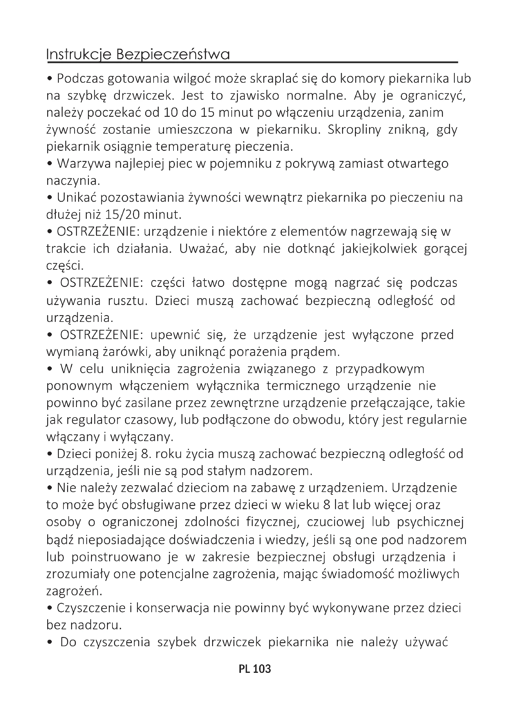 - Podczas gotowania wilgoć może skraplać się do komory piekarnika lub na szybkę drzwiczek. Jest to zjawisko normalne. Aby je ograniczyć, należy poczekać od 10 do 15 minut po włączeniu urządzenia, zanim żywność zostanie umieszczona w piekarniku. Skropliny znikną, gdy piekarnik osiągnie temperaturę pieczenia.