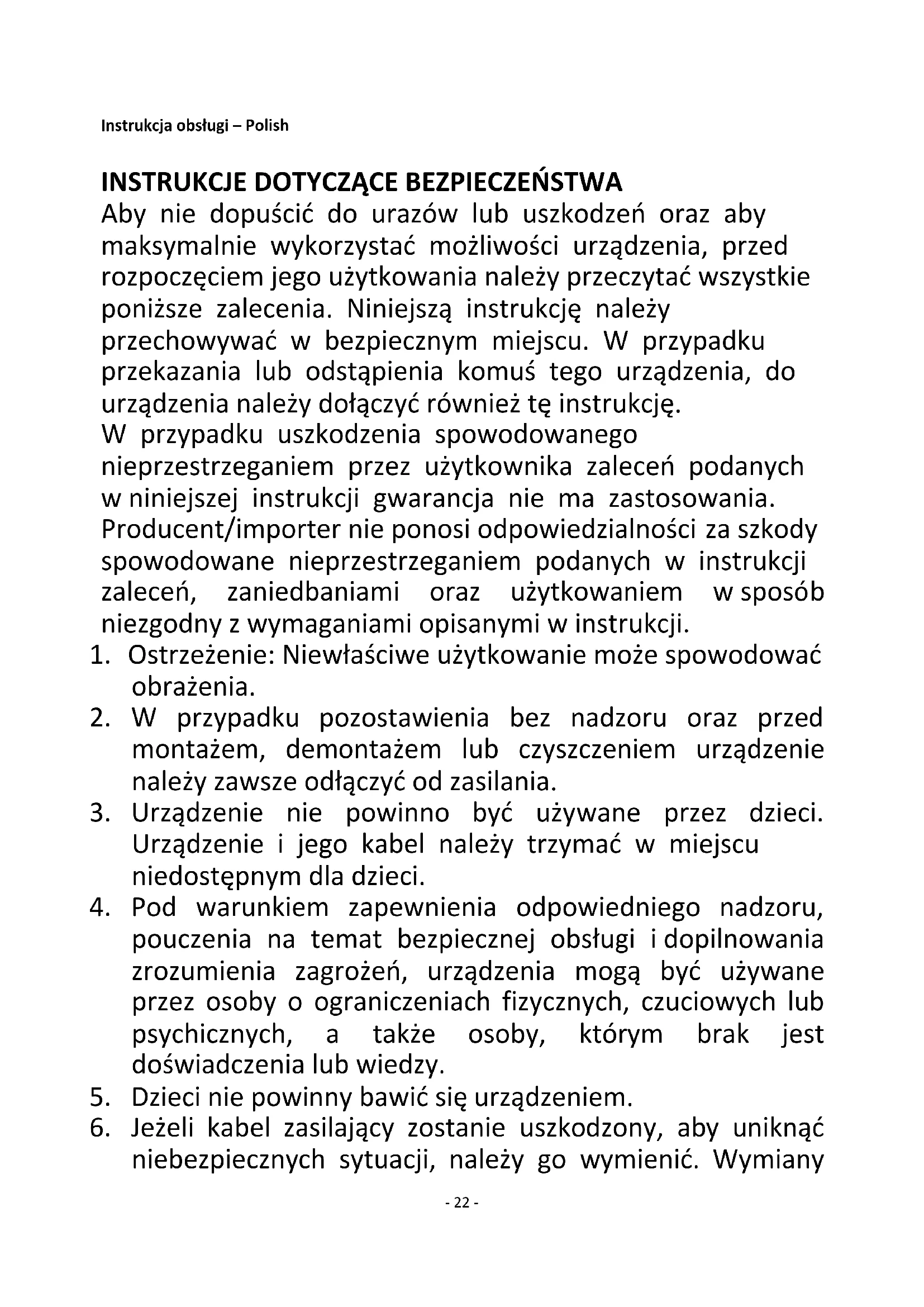 Aby nie dopuścić do urazów lub uszkodzeń oraz aby maksymalnie wykorzystać możliwości urządzenia, przed rozpoczęciem jego użytkowania należy przeczytać wszystkie poniższe zalecenia. Niniejszą instrukcję należy przechowywać w bezpiecznym miejscu. W przypadku przekazania lub odstąpienia komuś tego urządzenia, do urządzenia należy dołączyć również tę instrukcję. W przypadku uszkodzenia spowodowanego nieprzestrzeganiem przez użytkownika zaleceń podanych w niniejszej instrukcji gwarancja nie ma zastosowania. Producent/importer nie ponosi odpowiedzialności za szkody spowodowane nieprzestrzeganiem podanych w instrukcji zaleceń, zaniedbaniami oraz użytkowaniem w sposób niezgodny z wymaganiami opisanymi w instrukcji.