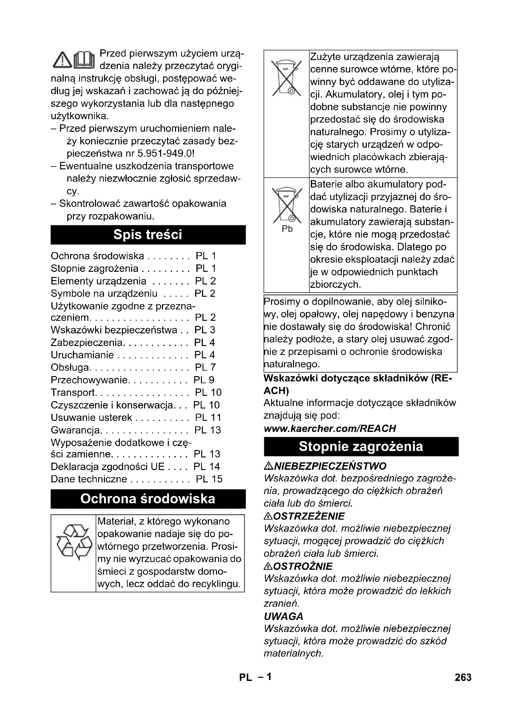262 SL– 1 Przed pierwszym użyciem urzą- dzenia należy przeczytać orygi- nalną instrukcję obsługi, postępować we- dług jej wskazań i zachować ją do później- szego wykorzystania lub dla następnego użytkownika. – Przed pierwszym uruchomieniem nale- ży koniecznie przeczytać zasady bez- pieczeństwa nr 5.951-949.0! – Ewentualne uszkodzenia transportowe należy niezwłocznie zgłosić sprzedaw- cy. – Skontrolować zawartość opakowania przy rozpakowaniu. Wskazówki dotyczące składników (RE- ACH) Aktualne informacje dotyczące składników znajdują się pod: www.kaercher.com/REACH NIEBEZPIECZEŃSTWO Wskazówka dot. bezpośredniego zagroże- nia, prowadzącego do ciężkich obrażeń ciała lub do śmierci. 몇 OSTRZEŻENIE Wskazówka dot. możliwie niebezpiecznej sytuacji, mogącej prowadzić do ciężkich obrażeń ciała lub śmierci. 몇 OSTROŻNIE Wskazówka dot. możliwie niebezpiecznej sytuacji, która może prowadzić do lekkich zranień. UWAGA Wskazówka dot. możliwie niebezpiecznej sytuacji, która może prowadzić do szkód materialnych. Spis treści Ochrona środowiska . . . . . . . . PL 1 Stopnie zagrożenia . . . . . . . . . PL 1 Elementy urządzenia . . . . . . . PL 2 Symbole na urządzeniu . . . . . PL 2 Użytkowanie zgodne z przezna- czeniem. . . . . . . . . . . . . . . . . . PL 2 Wskazówki bezpieczeństwa . . PL 3 Zabezpieczenia. . . . . . . . . . . . PL 4 Uruchamianie . . . . . . . . . . . . . PL 4 Obsługa. . . . . . . . . . . . . . . . . . PL 7 Przechowywanie. . . . . . . . . . . PL 9 Transport. . . . . . . . . . . . . . . . . PL 10 Czyszczenie i konserwacja. . . PL 10 Usuwanie usterek . . . . . . . . . . PL 11 Gwarancja. . . . . . . . . . . . . . . . PL 13 Wyposażenie dodatkowe i czę- ści zamienne. . . . . . . . . . . . . . PL 13 Deklaracja zgodności UE . . . . PL 14 Dane techniczne . . . . . . . . . . . PL 15 Ochrona środowiska Materiał, z którego wykonano opakowanie nadaje się do po- wtórnego przetworzenia. Prosi- my nie wyrzucać opakowania do śmieci z gospodarstw domo- wych, lecz oddać do recyklingu. Zużyte urządzenia zawierają cenne surowce wtórne, które po- winny być oddawane do utyliza- cji. Akumulatory, olej i tym po- dobne substancje nie powinny przedostać się do środowiska naturalnego. Prosimy o utyliza- cję starych urządzeń w odpo- wiednich placówkach zbierają- cych surowce wtórne. Baterie albo akumulatory pod- dać utylizacji przyjaznej do śro- dowiska naturalnego. Baterie i akumulatory zawierają substan- cje, które nie mogą przedostać się do środowiska. Dlatego po okresie eksploatacji należy zdać je w odpowiednich punktach zbiorczych. Prosimy o dopilnowanie, aby olej silniko- wy, olej opałowy, olej napędowy i benzyna nie dostawały się do środowiska! Chronić należy podłoże, a stary olej usuwać zgod- nie z przepisami o ochronie środowiska naturalnego. Stopnie zagrożenia