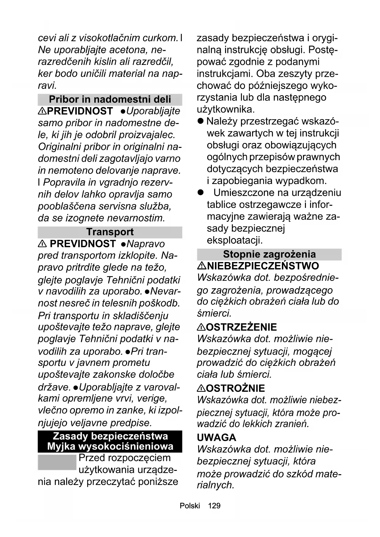 Przed przystąpieniem do wszel- kich prac przy urządzeniu i ak- cesoriach całkowicie zredukować ciśnienie w ukła- dzie wysokociśnieniowym. 몇 OSTROŻNIE Naprawy mogą być wykonywane wyłącz- nie przez autoryzowane punkty serwisowe lub osoby wykwalifi- kowane w tym zakresie, którym znane są wszystkie istotne za- sady bezpieczeństwa. Urzą- dzenie uruchomić dopiero po usunięciu wszystkich usterek. UWAGA Przestrzegać kontroli bezpieczeństwa urządzeń prze- nośnych wykorzystywanych do celów handlowych zgodnie z lo-Româneşte 137 kalnie obowiązującymi przepi- sami Zwarcia i inne szkody. Nie czyścić urządzenia za pomocą węża ani strumienia pod ciśnie- niem. Nie stosować acetonu, stężonych kwasów ani rozpusz- czalników, ponieważ działają agresywnie na materiały zasto- sowane w urządzeniu. Akcesoria i części zamienne 몇 OSTROŻNIE Stosować wy- łącznie akcesoria i części za- mienne dopuszczone przez producenta. Oryginalne akceso- ria i części zamienne gwarantują niezawodną i bezawaryjną pra- cę urządzenia. Naprawy i mon- taż części zamiennych mogą wykonywać wyłącznie autoryzo- wane punkty serwisowe, co po- zwoli uniknąć ryzyka. Transport 몇 OSTROŻNIE Wyłączyć urządzenie przed transportem. Przymocować urządzenie, uwzględniając jego masę, patrz rozdział Dane techniczne w in- strukcji obsługi. Niebezpie- czeństwo wypadku i niebezpieczeństwo odniesienia obrażeń. Podczas transportu i składowania zwracać uwagę na ciężar urządzenia, patrz rozdział Dane techniczne w instrukcji ob- sługi. Podczas transportu po drogach publicznych należy przestrzegać przepisów obowią- zujących w danym kraju. Sto- sować liny, łańcuchy, urządzenia sprzęgające i zawie- sia, które są wyposażone w za- bezpieczenia zgodne z obowiązującymi przepisami. Indicaţii privind siguranţa Aparat de curăţat cu presiune maximă Înainte de prima utiliza- re a aparatului, citiţi in- dicaţiile privind siguranţa şi instrucţiunile de utilizare origina- le. Respectaţi aceste instrucţi- uni. Păstraţi aceste două manuale pentru viitoarele utili- zări sau pentru viitorul posesor. În afară de indicaţiile din in- strucţiunile de funcţionare, este necesar să fie luate în considerare şi prevederile ge- nerale privind protecţia muncii şi prevenirea accidentelor de muncă, emise de organele le- gislative. Plăcuţele de avertizare şi plă-