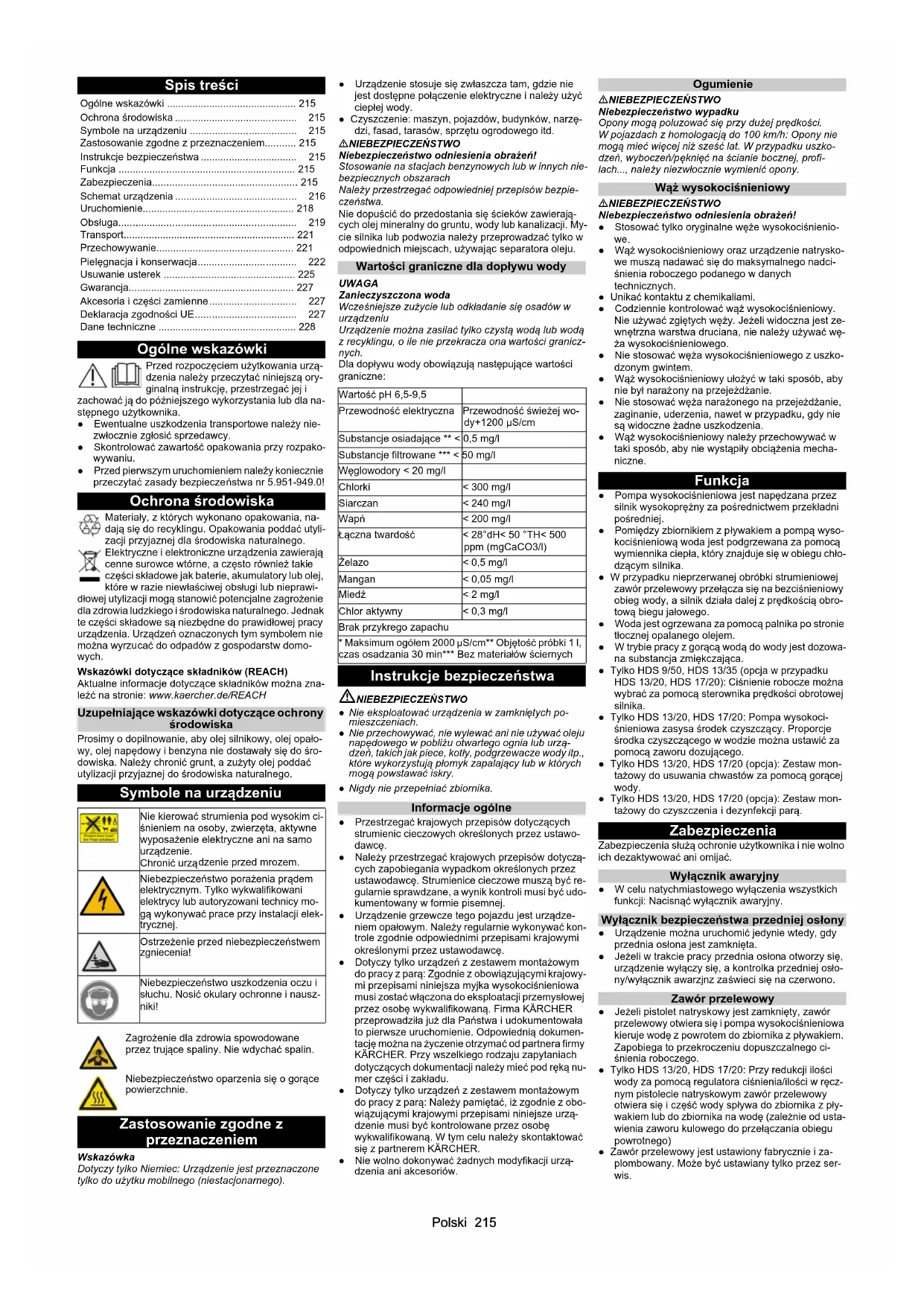 - 2,1 2,1 0,85 0,8Polski 215 Spis treści Ogólne wskazówki Przed rozpoczęciem użytkowania urzą- dzenia należy przeczytać niniejszą ory- ginalną instrukcję, przestrzegać jej i zachować ją do późniejszego wykorzystania lub dla na- stępnego użytkownika. ● Ewentualne uszkodzenia transportowe należy nie- zwłocznie zgłosić sprzedawcy. ● Skontrolować zawartość opakowania przy rozpako- wywaniu. ● Przed pierwszym uruchomieniem należy koniecznie przeczytać zasady bezpieczeństwa nr 5.951-949.0! Ochrona środowiska Materiały, z których wykonano opakowania, na- dają się do recyklingu. Opakowania poddać utyli- zacji przyjaznej dla środowiska naturalnego. Elektryczne i elektroniczne urządzenia zawierają cenne surowce wtórne, a często również takie części składowe jak baterie, akumulatory lub olej, które w razie niewłaściwej obsługi lub nieprawi- dłowej utylizacji mogą stanowić potencjalne zagrożenie dla zdrowia ludzkiego i środowiska naturalnego. Jednak te części składowe są niezbędne do prawidłowej pracy urządzenia. Urządzeń oznaczonych tym symbolem nie można wyrzucać do odpadów z gospodarstw domo- wych. Wskazówki dotyczące składników (REACH) Aktualne informacje dotyczące składników można zna- leźć na stronie: www.kaercher.de/REACH Uzupełniające wskazówki dotyczące ochrony środowiska Prosimy o dopilnowanie, aby olej silnikowy, olej opało- wy, olej napędowy i benzyna nie dostawały się do śro- dowiska. Należy chronić grunt, a zużyty olej poddać utylizacji przyjaznej do środowiska naturalnego. Symbole na urządzeniu Zastosowanie zgodne z przeznaczeniem Wskazówka Dotyczy tylko Niemiec: Urządzenie jest przeznaczone tylko do użytku mobilnego (niestacjonarnego). ● Urządzenie stosuje się zwłaszcza tam, gdzie nie jest dostępne połączenie elektryczne i należy użyć ciepłej wody. ● Czyszczenie: maszyn, pojazdów, budynków, narzę- dzi, fasad, tarasów, sprzętu ogrodowego itd. NIEBEZPIECZEŃSTWO Niebezpieczeństwo odniesienia obrażeń! Stosowanie na stacjach benzynowych lub w innych nie- bezpiecznych obszarach Należy przestrzegać odpowiedniej przepisów bezpie- czeństwa. Nie dopuścić do przedostania się ścieków zawierają- cych olej mineralny do gruntu, wody lub kanalizacji. My- cie silnika lub podwozia należy przeprowadzać tylko w odpowiednich miejscach, używając separatora oleju. Wartości graniczne dla dopływu wody UWAGA Zanieczyszczona woda Wcześniejsze zużycie lub odkładanie się osadów w urządzeniu Urządzenie można zasilać tylko czystą wodą lub wodą z recyklingu, o ile nie przekracza ona wartości granicz- nych. Dla dopływu wody obowiązują następujące wartości graniczne: Instrukcje bezpieczeństwa NIEBEZPIECZEŃSTWO ● Nie eksploatować urządzenia w zamkniętych po- mieszczeniach. ● Nie przechowywać, nie wylewać ani nie używać oleju napędowego w pobliżu otwartego ognia lub urzą- dzeń, takich jak piece, kotły, podgrzewacze wody itp., które wykorzystują płomyk zapalający lub w których mogą powstawać iskry. ● Nigdy nie przepełniać zbiornika. Informacje ogólne ● Przestrzegać krajowych przepisów dotyczących strumienic cieczowych określonych przez ustawo- dawcę. ● Należy przestrzegać krajowych przepisów dotyczą- cych zapobiegania wypadkom określonych przez ustawodawcę. Strumienice cieczowe muszą być re- gularnie sprawdzane, a wynik kontroli musi być udo- kumentowany w formie pisemnej. ● Urządzenie grzewcze tego pojazdu jest urządze- niem opałowym. Należy regularnie wykonywać kon- trole zgodnie odpowiednimi przepisami krajowymi określonymi przez ustawodawcę. ● Dotyczy tylko urządzeń z zestawem montażowym do pracy z parą: Zgodnie z obowiązującymi krajowy- mi przepisami niniejsza myjka wysokociśnieniowa musi zostać włączona do eksploatacji przemysłowej przez osobę wykwalifikowaną. Firma KÄRCHER przeprowadziła już dla Państwa i udokumentowała to pierwsze uruchomienie. Odpowiednią dokumen- tację można na życzenie otrzyma ć od partnera firmy KÄRCHER. Przy wszelkiego rodzaju zapytaniach dotyczących dokumentacji należy mieć pod ręką nu- mer części i zakładu. ● Dotyczy tylko urządzeń z zestawem montażowym do pracy z parą: Należy pamiętać, iż zgodnie z obo- wiązującymi krajowymi przepisami niniejsze urzą- dzenie musi być kontrolowane przez osobę wykwalifikowaną. W tym celu należy skontaktować się z partnerem KÄRCHER. ● Nie wolno dokonywać żadnych modyfikacji urzą- dzenia ani akcesoriów. Ogumienie NIEBEZPIECZEŃSTWO Niebezpieczeństwo wypadku Opony mogą poluzować się przy dużej prędkości. W pojazdach z homologacją do 100 km/h: Opony nie mogą mieć więcej niż sześć lat. W przypadku uszko- dzeń, wyboczeń/pęknięć na ścianie bocznej, profi- lach