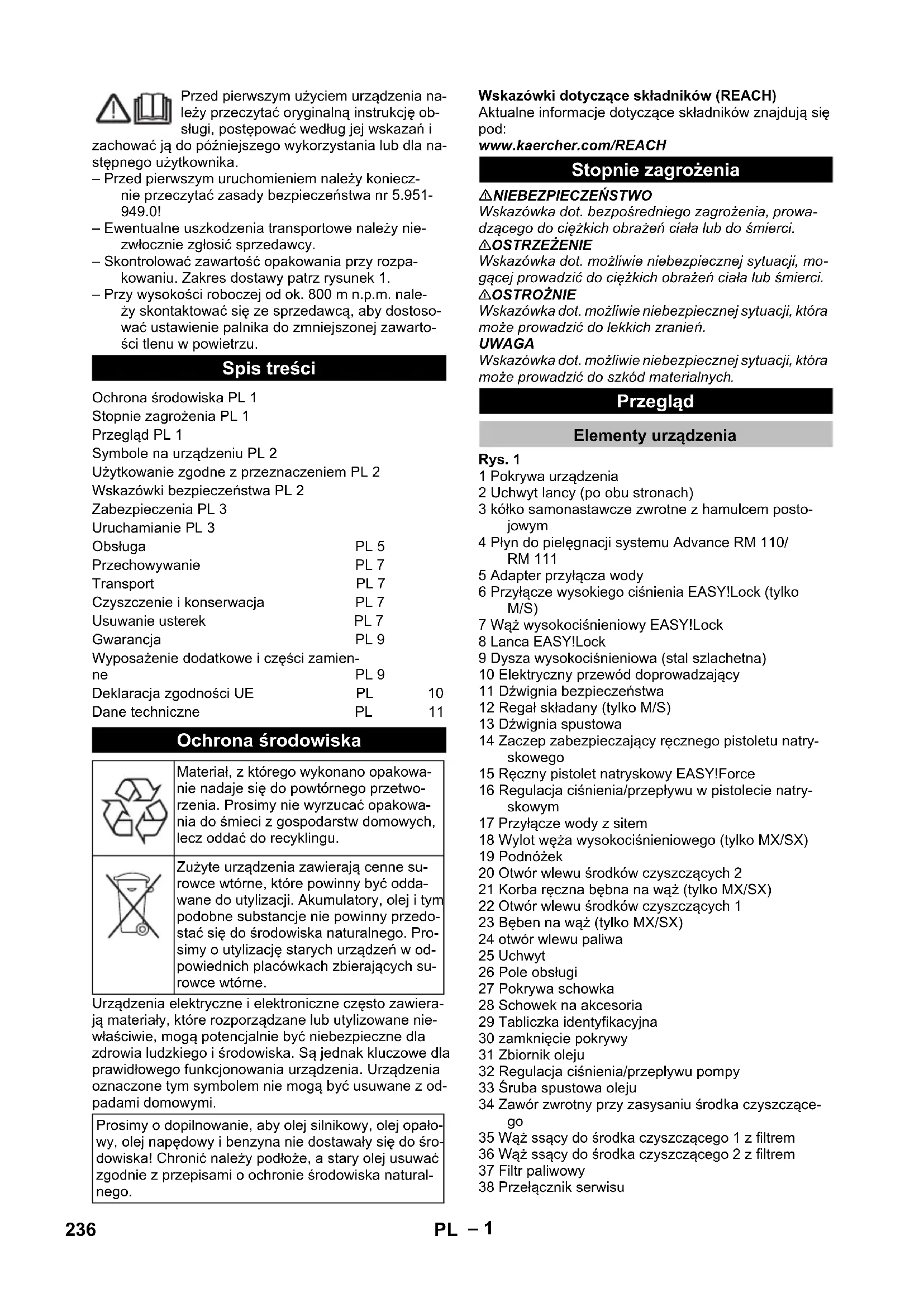 1,0 1,0 Goriva Gorivo -- EL kurilno olje ali di- zel EL kurilno olje ali di- zel Količina olja l 1,0 1,0 Vrsta olja -- SAE 90 SAE 90 Mere in teža Dolžina x širina x višina mm 1330 x 750 x 1060 1330 x 750 x 1060 Tipična delovna teža, S kg 200 200 Tipična delovna teža, SX kg 205 205 Rezervoar za gorivo l 25 25 Rezervoar za čistilo l 10 + 20 10 + 20 235SL– 1 Przed pierwszym użyciem urządzenia na- leży przeczytać oryginalną instrukcję ob- sługi, postępować według jej wskazań i zachować ją do późniejszego wykorzystania lub dla na- stępnego użytkownika. – Przed pierwszym uruchomieniem należy koniecz- nie przeczytać zasady bezpieczeństwa nr 5.951- 949.0! – Ewentualne uszkodzenia transportowe należy nie- zwłocznie zgłosić sprzedawcy. – Skontrolować zawartość opakowania przy rozpa- kowaniu. Zakres dostawy patrz rysunek 1. – Przy wysokości roboczej od ok. 800 m n.p.m. nale- ży skontaktować się ze sprzedawcą, aby dostoso- wać ustawienie palnika do zmniejszonej zawarto- ści tlenu w powietrzu. Urządzenia elektryczne i elektroniczne często zawiera- ją materiały, które rozporządzane lub utylizowane nie- właściwie, mogą potencjalnie być niebezpieczne dla zdrowia ludzkiego i środowiska. Są jednak kluczowe dla prawidłowego funkcjonowania urządzenia. Urządzenia oznaczone tym symbolem nie mogą być usuwane z od- padami domowymi. Wskazówki dotyczące składników (REACH) Aktualne informacje dotyczące składników znajdują się pod: www.kaercher.com/REACH NIEBEZPIECZEŃSTWO Wskazówka dot. bezpośredniego zagrożenia, prowa- dzącego do ciężkich obrażeń ciała lub do śmierci. 몇 OSTRZEŻENIE Wskazówka dot. możliwie niebezpiecznej sytuacji, mo- gącej prowadzić do ciężkich obrażeń ciała lub śmierci. 몇 OSTROŻNIE Wskazówka dot. możliwie niebezpiecznej sytuacji, która może prowadzić do lekkich zranień. UWAGA Wskazówka dot. możliwie niebezpiecznej sytuacji, która może prowadzić do szkód materialnych. Rys. 1 1 Pokrywa urządzenia 2 Uchwyt lancy (po obu stronach) 3 kółko samonastawcze zwrotne z hamulcem posto- jowym 4 Płyn do pielęgnacji systemu Advance RM 110/ RM 111 5 Adapter przyłącza wody 6 Przyłącze wysokiego ciśnienia EASY!Lock (tylko M/S) 7 Wąż wysokociśnieniowy EASY!Lock 8 Lanca EASY!Lock 9 Dysza wysokociśnieniowa (stal szlachetna) 10 Elektryczny przewód doprowadzający 11 Dźwignia bezpieczeństwa 12 Regał składany (tylko M/S) 13 Dźwignia spustowa 14 Zaczep zabezpieczający ręcznego pistoletu natry- skowego 15 Ręczny pistolet natryskowy EASY!Force 16 Regulacja ciśnienia/przepływu w pistolecie natry- skowym 17 Przyłącze wody z sitem 18 Wylot węża wysokociśnieniowego (tylko MX/SX) 19 Podnóżek 20 Otwór wlewu środków czyszczących 2 21 Korba ręczna bębna na wąż (tylko MX/SX) 22 Otwór wlewu środków czyszczących 1 23 Bęben na wąż (tylko MX/SX) 24 otwór wlewu paliwa 25 Uchwyt 26 Pole obsługi 27 Pokrywa schowka 28 Schowek na akcesoria 29 Tabliczka identyfikacyjna 30 zamknięcie pokrywy 31 Zbiornik oleju 32 Regulacja ciśnienia/przepływu pompy 33 Śruba spustowa oleju 34 Zawór zwrotny przy zasysaniu środka czyszczące-