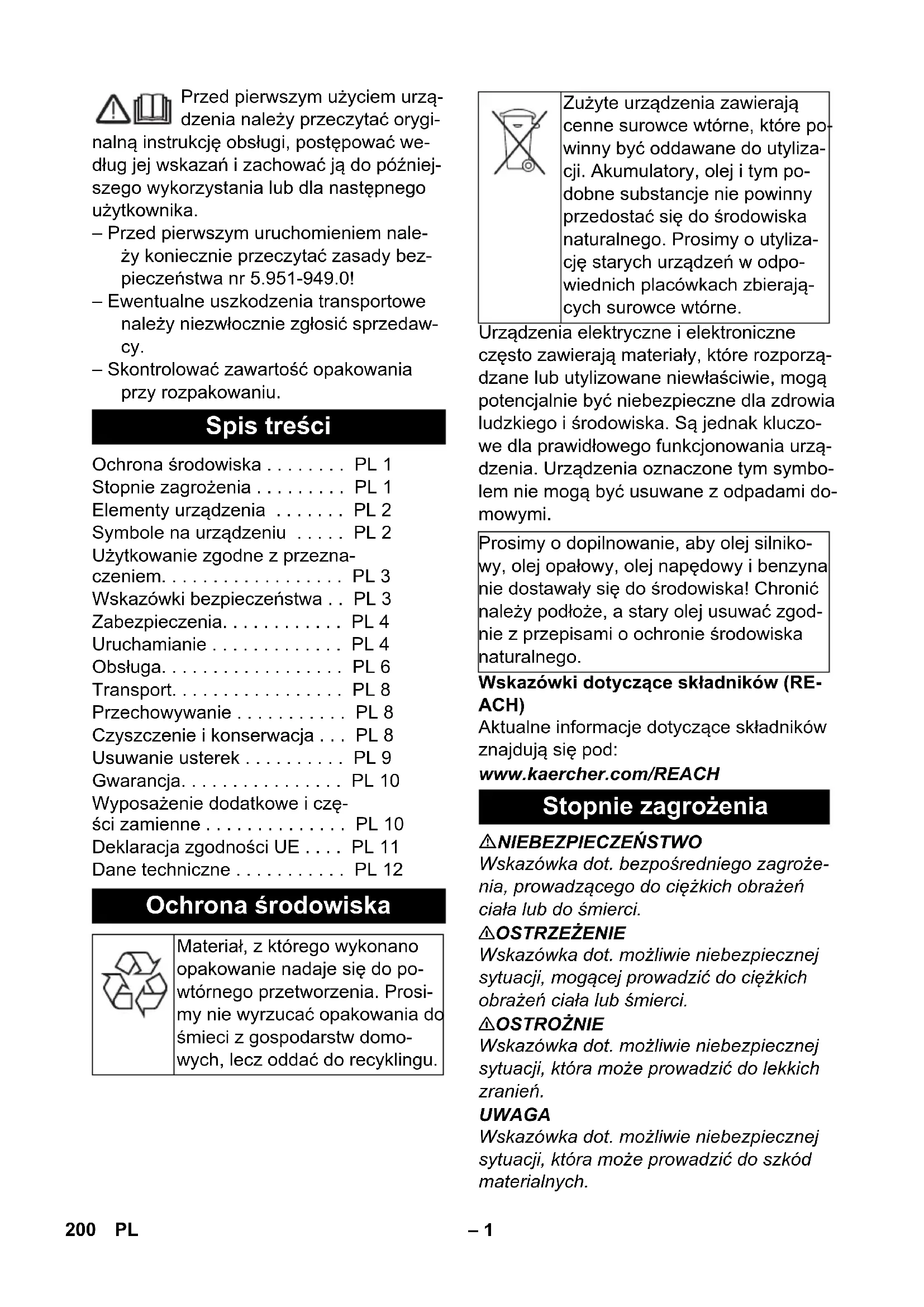 0,6 0,7 199SL– 1 Przed pierwszym użyciem urzą- dzenia należy przeczytać orygi- nalną instrukcję obsługi, postępować we- dług jej wskazań i zachować ją do później- szego wykorzystania lub dla następnego użytkownika. – Przed pierwszym uruchomieniem nale- ży koniecznie przeczytać zasady bez- pieczeństwa nr 5.951-949.0! – Ewentualne uszkodzenia transportowe należy niezwłocznie zgłosić sprzedaw- cy. – Skontrolować zawartość opakowania przy rozpakowaniu. Urządzenia elektryczne i elektroniczne często zawierają materiały, które rozporzą- dzane lub utylizowane niewłaściwie, mogą potencjalnie być niebezpieczne dla zdrowia ludzkiego i środowiska. Są jednak kluczo- we dla prawidłowego funkcjonowania urzą- dzenia. Urządzenia oznaczone tym symbo- lem nie mogą być usuwane z odpadami do- mowymi. Wskazówki dotyczące składników (RE- ACH) Aktualne informacje dotyczące składników znajdują się pod: www.kaercher.com/REACH NIEBEZPIECZEŃSTWO Wskazówka dot. bezpośredniego zagroże- nia, prowadzącego do ciężkich obrażeń ciała lub do śmierci. 몇 OSTRZEŻENIE Wskazówka dot. możliwie niebezpiecznej sytuacji, mogącej prowadzić do ciężkich obrażeń ciała lub śmierci. 몇 OSTROŻNIE Wskazówka dot. możliwie niebezpiecznej sytuacji, która może prowadzić do lekkich zranień. UWAGA Wskazówka dot. możliwie niebezpiecznej sytuacji, która może prowadzić do szkód materialnych. Spis treści Ochrona środowiska . . . . . . . . PL 1 Stopnie zagrożenia . . . . . . . . . PL 1 Elementy urządzenia . . . . . . . PL 2 Symbole na urządzeniu . . . . . PL 2 Użytkowanie zgodne z przezna- czeniem. . . . . . . . . . . . . . . . . . PL 3 Wskazówki bezpieczeństwa . . PL 3 Zabezpieczenia. . . . . . . . . . . . PL 4 Uruchamianie . . . . . . . . . . . . . PL 4 Obsługa. . . . . . . . . . . . . . . . . . PL 6 Transport. . . . . . . . . . . . . . . . . PL 8 Przechowywanie . . . . . . . . . . . PL 8 Czyszczenie i konserwacja . . . PL 8 Usuwanie usterek . . . . . . . . . . PL 9 Gwarancja. . . . . . . . . . . . . . . . PL 10 Wyposażenie dodatkowe i czę- ści zamienne . . . . . . . . . . . . . . PL 10 Deklaracja zgodności UE . . . . PL 11 Dane techniczne . . . . . . . . . . . PL 12 Ochrona środowiska Materiał, z którego wykonano opakowanie nadaje się do po- wtórnego przetworzenia. Prosi- my nie wyrzucać opakowania do śmieci z gospodarstw domo- wych, lecz oddać do recyklingu. Zużyte urządzenia zawierają cenne surowce wtórne, które po- winny być oddawane do utyliza- cji. Akumulatory, olej i tym po- dobne substancje nie powinny przedostać się do środowiska naturalnego. Prosimy o utyliza- cję starych urządzeń w odpo- wiednich placówkach zbierają- cych surowce wtórne. Prosimy o dopilnowanie, aby olej silniko- wy, olej opałowy, olej napędowy i benzyna nie dostawały się do środowiska! Chronić należy podłoże, a stary olej usuwać zgod- nie z przepisami o ochronie środowiska naturalnego. Stopnie zagrożenia 200 PL– 2 1 Złącze śrubowe dyszy 2 Dysza 3 Lanca EASY!Lock 4 Ręczny pistolet natryskowy EASY!For-