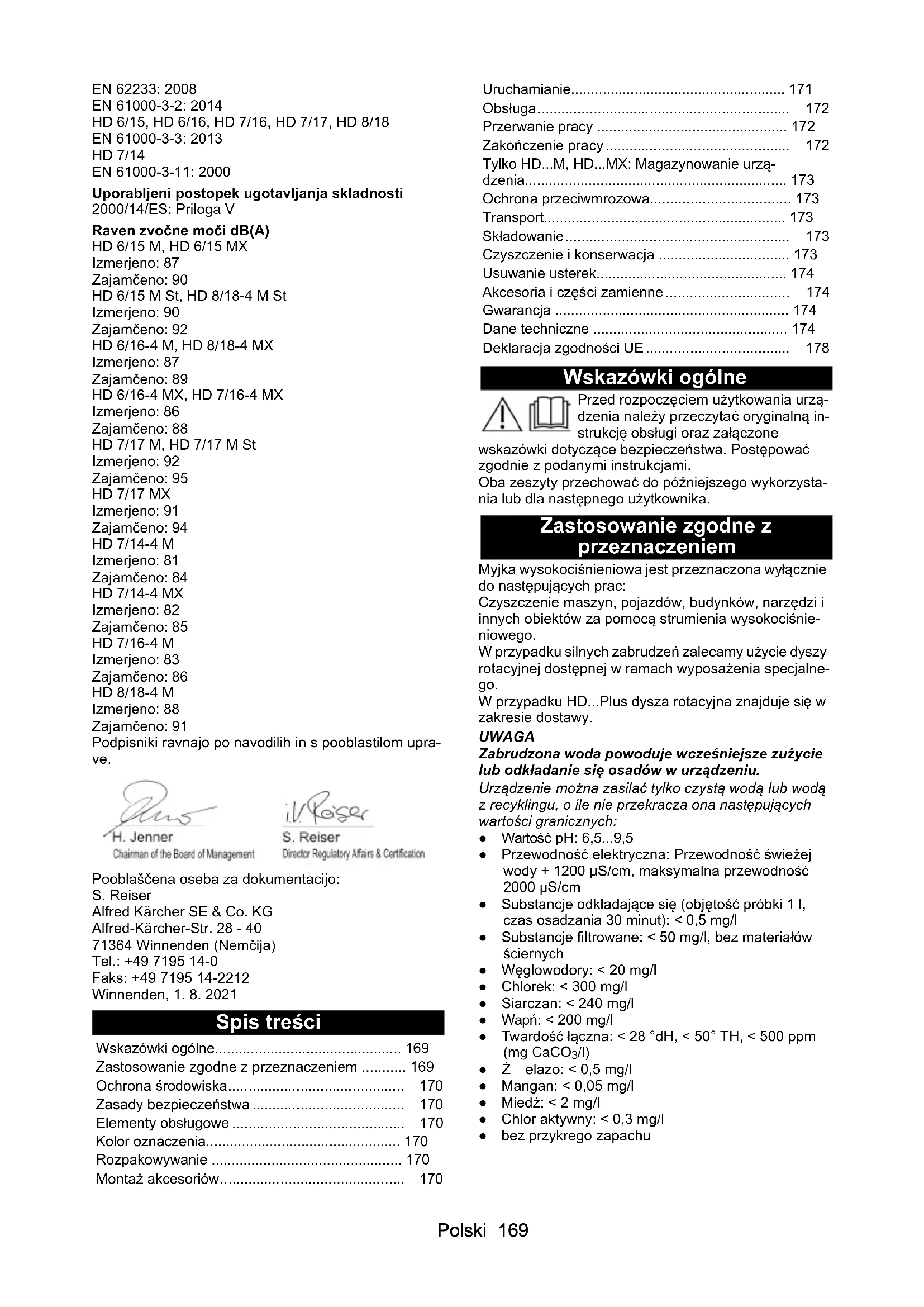 dB(A)939189929295Polski 169 EN 62233: 2008 EN 61000-3-2: 2014 HD 6/15, HD 6/16, HD 7/16, HD 7/17, HD 8/18 EN 61000-3-3: 2013 HD 7/14 EN 61000-3-11: 2000 Uporabljeni postopek ugotavljanja skladnosti 2000/14/ES: Priloga V Raven zvočne moči dB(A) HD 6/15 M, HD 6/15 MX Izmerjeno: 87 Zajamčeno: 90 HD 6/15 M St, HD 8/18-4 M St Izmerjeno: 90 Zajamčeno: 92 HD 6/16-4 M, HD 8/18-4 MX Izmerjeno: 87 Zajamčeno: 89 HD 6/16-4 MX, HD 7/16-4 MX Izmerjeno: 86 Zajamčeno: 88 HD 7/17 M, HD 7/17 M St Izmerjeno: 92 Zajamčeno: 95 HD 7/17 MX Izmerjeno: 91 Zajamčeno: 94 HD 7/14-4 M Izmerjeno: 81 Zajamčeno: 84 HD 7/14-4 MX Izmerjeno: 82 Zajamčeno: 85 HD 7/16-4 M Izmerjeno: 83 Zajamčeno: 86 HD 8/18-4 M Izmerjeno: 88 Zajamčeno: 91 Podpisniki ravnajo po navodilih in s pooblastilom upra- ve. Pooblaščena oseba za dokumentacijo: S. Reiser Alfred Kärcher SE & Co. KG Alfred-Kärcher-Str. 28 - 40 71364 Winnenden (Nemčija) Tel.: +49 7195 14-0 Faks: +49 7195 14-2212 Winnenden, 1. 8. 2021 Spis treści Wskazówki ogólne Przed rozpoczęciem użytkowania urzą- dzenia należy przeczytać oryginalną in- strukcję obsługi oraz załączone wskazówki dotyczące bezpieczeństwa. Postępować zgodnie z podanymi instrukcjami. Oba zeszyty przechować do późniejszego wykorzysta- nia lub dla następnego użytkownika. Zastosowanie zgodne z przeznaczeniem Myjka wysokociśnieniowa jest przeznaczona wyłącznie do następujących prac: Czyszczenie maszyn, pojazdów, budynków, narzędzi i innych obiektów za pomocą strumienia wysokociśnie- niowego. W przypadku silnych zabrudzeń zalecamy użycie dyszy rotacyjnej dostępnej w ramach wyposażenia specjalne- go. W przypadku HD...Plus dysza rotacyjna znajduje się w zakresie dostawy. UWAGA Zabrudzona woda powoduje wcześniejsze zużycie lub odkładanie się osadów w urządzeniu. Urządzenie można zasilać tylko czystą wodą lub wodą z recyklingu, o ile nie przekracza ona następujących wartości granicznych: ● Wartość pH: 6,5...9,5 ● Przewodność elektryczna: Przewodność świeżej wody + 1200 µS/cm, maksymalna przewodność 2000 µS/cm ● Substancje odkładające się (objętość próbki 1 l, czas osadzania 30 minut): < 0,5 mg/l ● Substancje filtrowane: < 50 mg/l, bez materiałów ściernych ● Węglowodory: < 20 mg/l ● Chlorek: < 300 mg/l ● Siarczan: < 240 mg/l ● Wapń: < 200 mg/l ● Twardość łączna: < 28 °dH, < 50° TH, < 500 ppm (mg CaCO