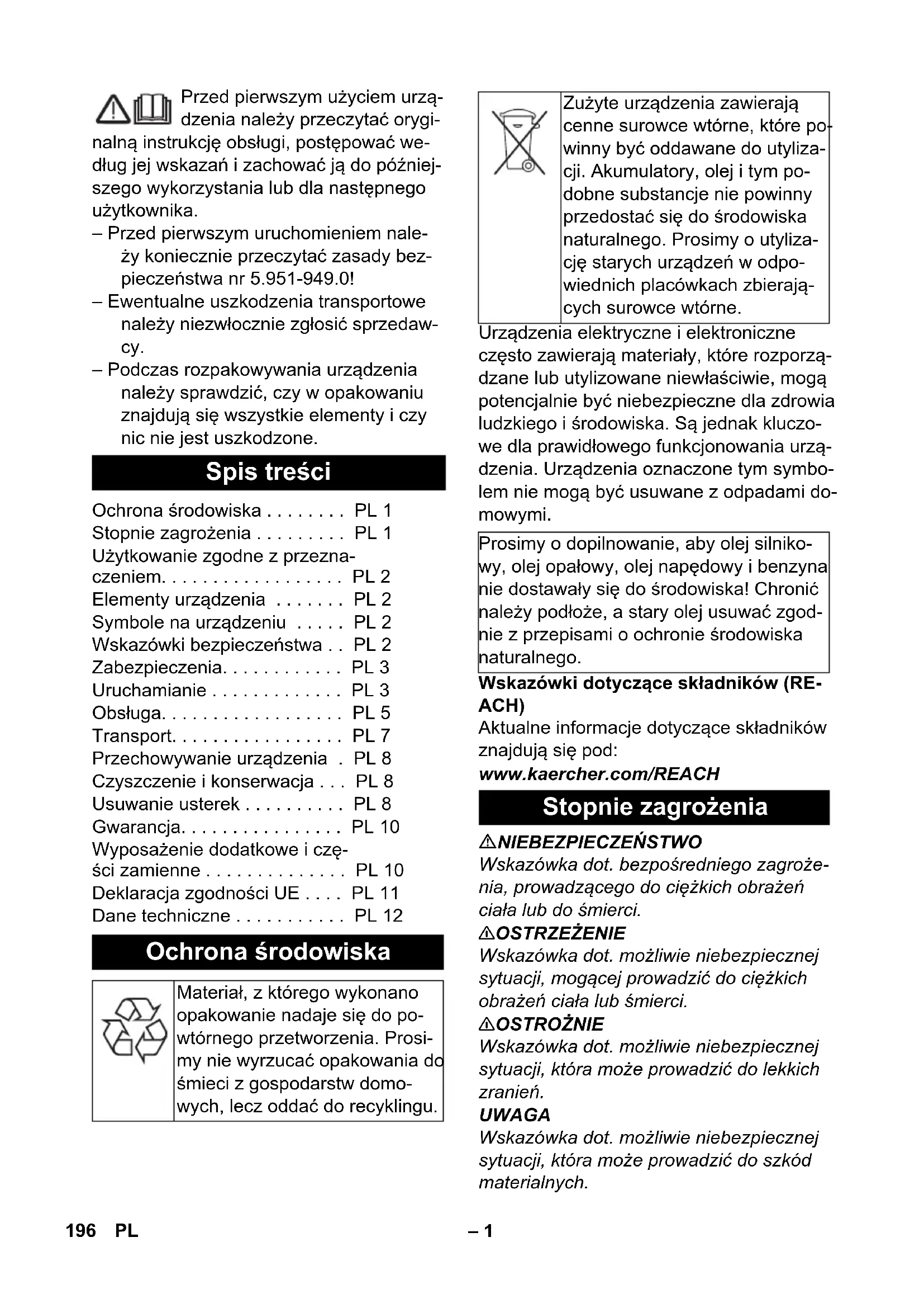 dB(A) 93 97 96 195SL– 1 Przed pierwszym użyciem urzą- dzenia należy przeczytać orygi- nalną instrukcję obsługi, postępować we- dług jej wskazań i zachować ją do później- szego wykorzystania lub dla następnego użytkownika. – Przed pierwszym uruchomieniem nale- ży koniecznie przeczytać zasady bez- pieczeństwa nr 5.951-949.0! – Ewentualne uszkodzenia transportowe należy niezwłocznie zgłosić sprzedaw- cy. – Podczas rozpakowywania urządzenia należy sprawdzić, czy w opakowaniu znajdują się wszystkie elementy i czy nic nie jest uszkodzone. Urządzenia elektryczne i elektroniczne często zawierają materiały, które rozporzą- dzane lub utylizowane niewłaściwie, mogą potencjalnie być niebezpieczne dla zdrowia ludzkiego i środowiska. Są jednak kluczo- we dla prawidłowego funkcjonowania urzą- dzenia. Urządzenia oznaczone tym symbo- lem nie mogą być usuwane z odpadami do- mowymi. Wskazówki dotyczące składników (RE- ACH) Aktualne informacje dotyczące składników znajdują się pod: www.kaercher.com/REACH NIEBEZPIECZEŃSTWO Wskazówka dot. bezpośredniego zagroże- nia, prowadzącego do ciężkich obrażeń ciała lub do śmierci. 몇 OSTRZEŻENIE Wskazówka dot. możliwie niebezpiecznej sytuacji, mogącej prowadzić do ciężkich obrażeń ciała lub śmierci. 몇 OSTROŻNIE Wskazówka dot. możliwie niebezpiecznej sytuacji, która może prowadzić do lekkich zranień. UWAGA Wskazówka dot. możliwie niebezpiecznej sytuacji, która może prowadzić do szkód materialnych. Spis treści Ochrona środowiska . . . . . . . . PL 1 Stopnie zagrożenia . . . . . . . . . PL 1 Użytkowanie zgodne z przezna- czeniem. . . . . . . . . . . . . . . . . . PL 2 Elementy urządzenia . . . . . . . PL 2 Symbole na urządzeniu . . . . . PL 2 Wskazówki bezpieczeństwa . . PL 2 Zabezpieczenia. . . . . . . . . . . . PL 3 Uruchamianie . . . . . . . . . . . . . PL 3 Obsługa. . . . . . . . . . . . . . . . . . PL 5 Transport. . . . . . . . . . . . . . . . . PL 7 Przechowywanie urządzenia . PL 8 Czyszczenie i konserwacja . . . PL 8 Usuwanie usterek . . . . . . . . . . PL 8 Gwarancja. . . . . . . . . . . . . . . . PL 10 Wyposażenie dodatkowe i czę- ści zamienne . . . . . . . . . . . . . . PL 10 Deklaracja zgodności UE . . . . PL 11 Dane techniczne . . . . . . . . . . . PL 12 Ochrona środowiska Materiał, z którego wykonano opakowanie nadaje się do po- wtórnego przetworzenia. Prosi- my nie wyrzucać opakowania do śmieci z gospodarstw domo- wych, lecz oddać do recyklingu. Zużyte urządzenia zawierają cenne surowce wtórne, które po- winny być oddawane do utyliza- cji. Akumulatory, olej i tym po- dobne substancje nie powinny przedostać się do środowiska naturalnego. Prosimy o utyliza- cję starych urządzeń w odpo- wiednich placówkach zbierają- cych surowce wtórne. Prosimy o dopilnowanie, aby olej silniko- wy, olej opałowy, olej napędowy i benzyna nie dostawały się do środowiska! Chronić należy podłoże, a stary olej usuwać zgod- nie z przepisami o ochronie środowiska naturalnego. Stopnie zagrożenia 196 PL– 2 To wysokociśnieniowe urządzenie czysz- czące należy stosować wyłącznie: – do czyszczenia maszyn, pojazdów, bu- dynków, narzędzi. – przy zastosowaniu akcesoriów i części zamiennych dopuszczonych przez fir- mę Kärcher. Ilustracje patrz strona 2 1 Ręczny pistolet natryskowy EASY!For-